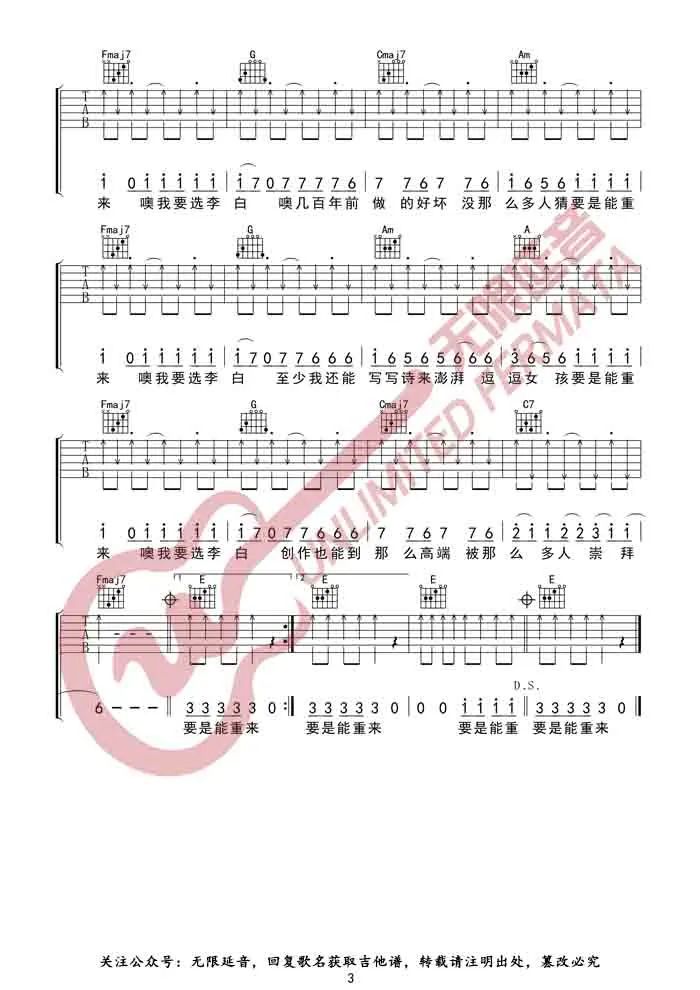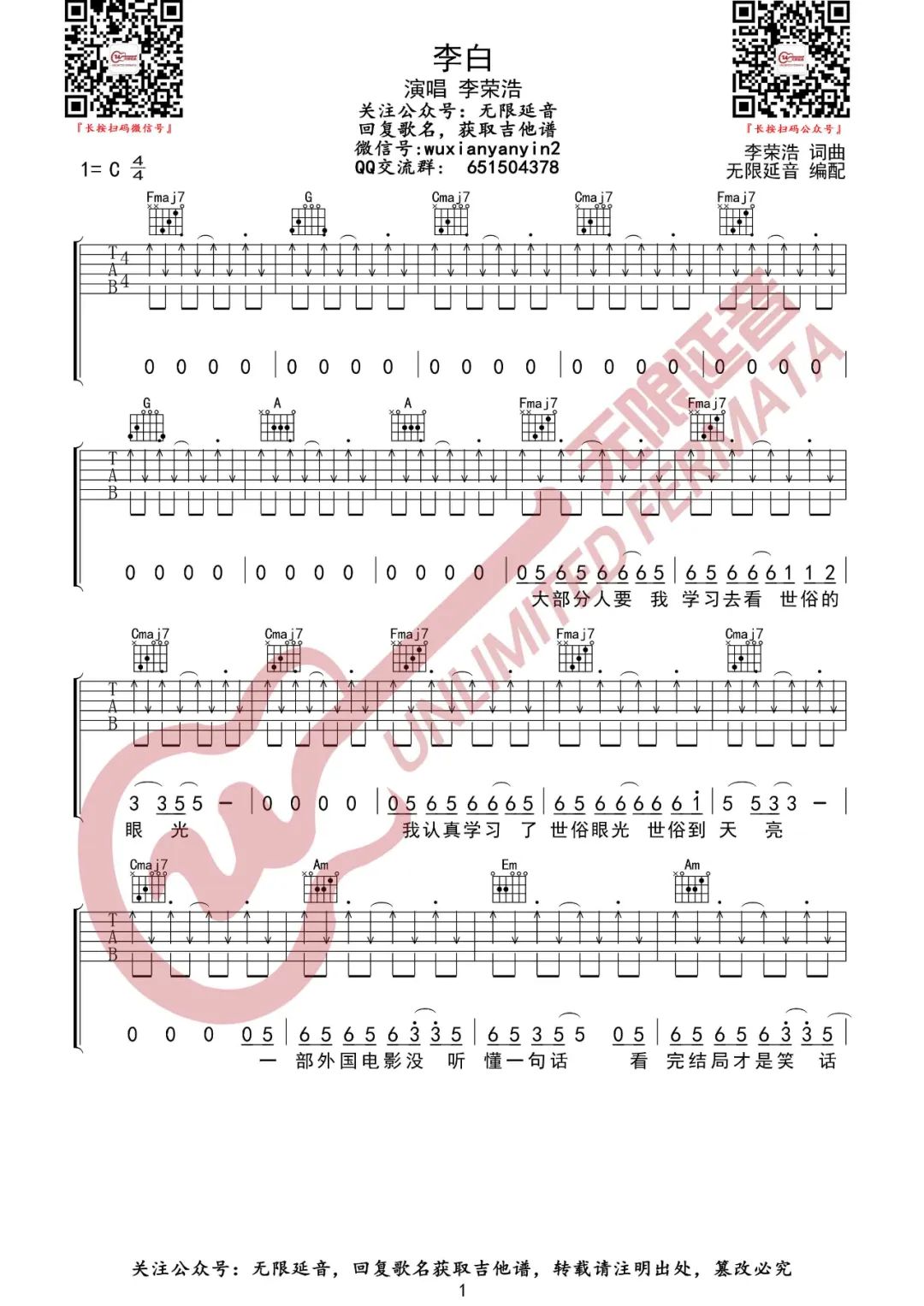 李荣浩《李白》吉他谱 C调切音扫弦弹唱乐谱