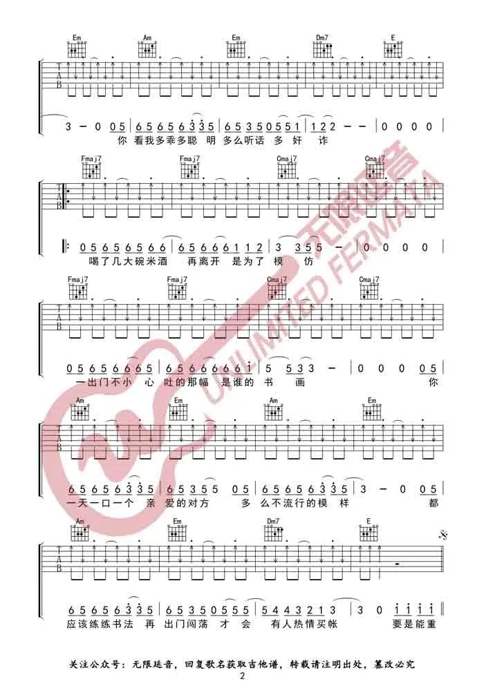 歌曲原调为C调,此版本的曲谱来源于@无限延音,为4/4拍的节奏,按C调指法编配,共3张高清吉他谱,变调夹不夹为原歌曲的调式,演唱时可按个人音域选择合适的变调夹位置。