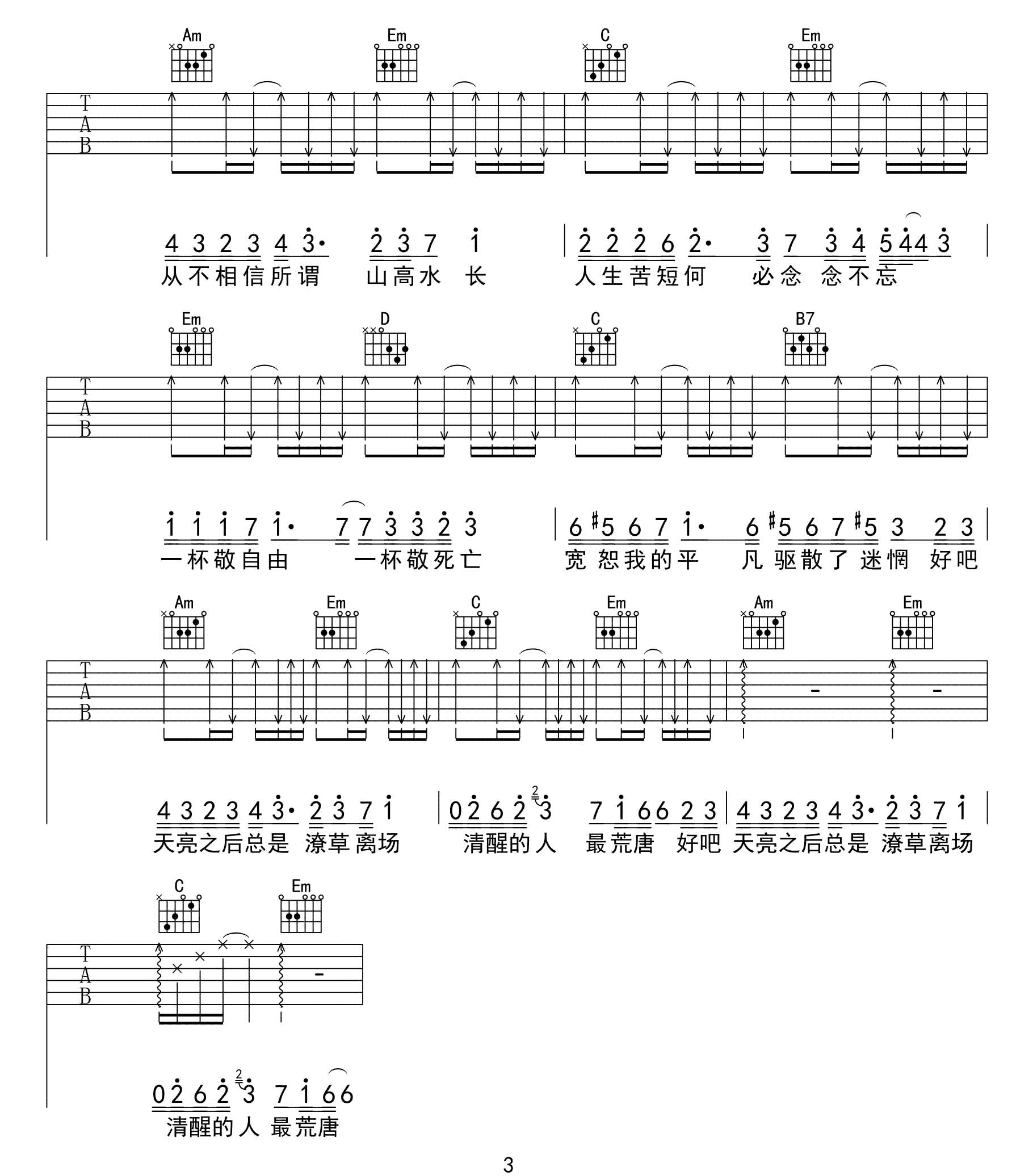 歌曲原调为降A调,此版本的曲谱来源于@米鹏,为4/4拍的节奏,按G调指法编配,共3张高清吉他谱,变调夹1品为原歌曲的调式,演唱时可按个人音域选择合适的变调夹位置。