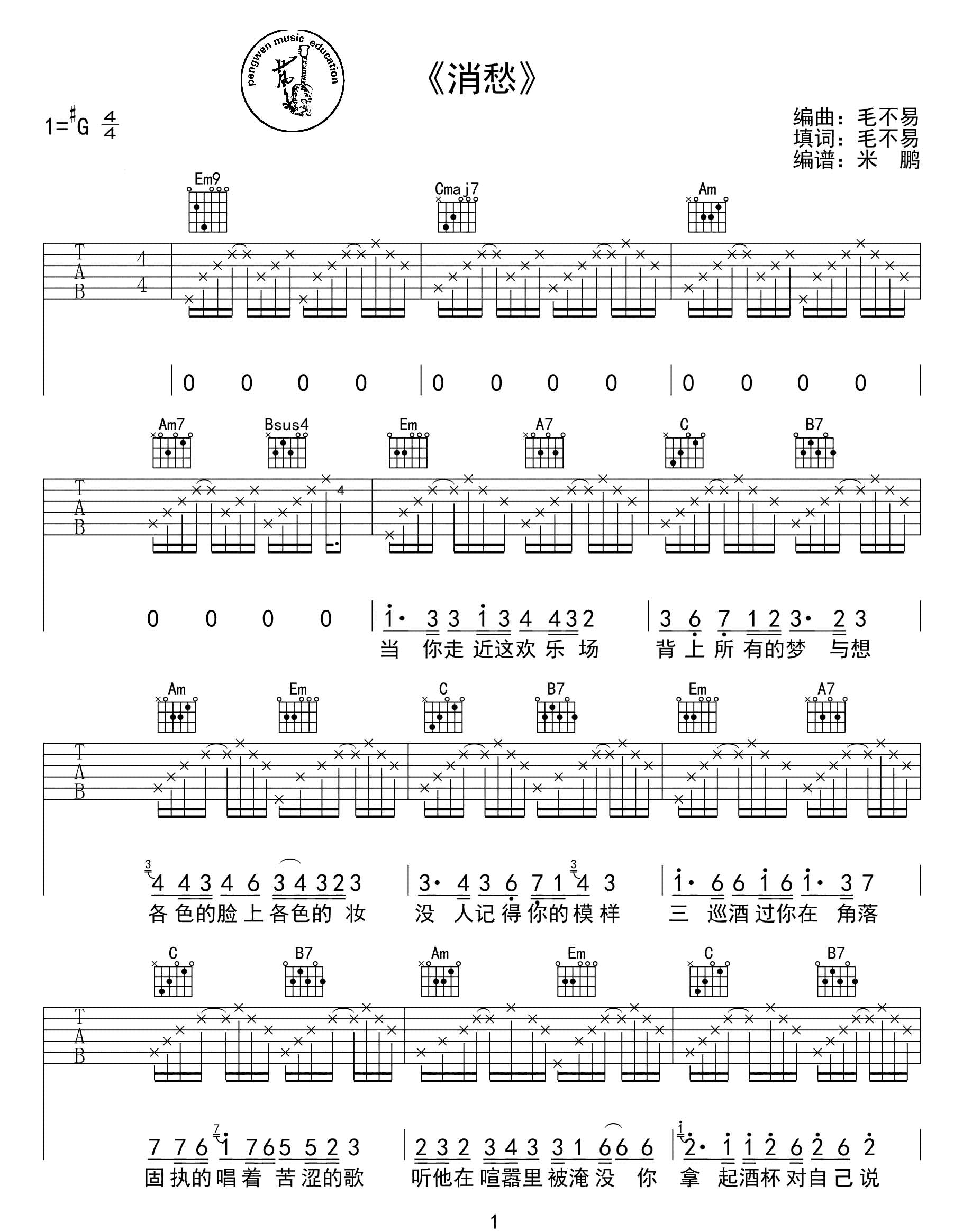毛不易《消愁》吉他谱 G调简单版弹唱谱