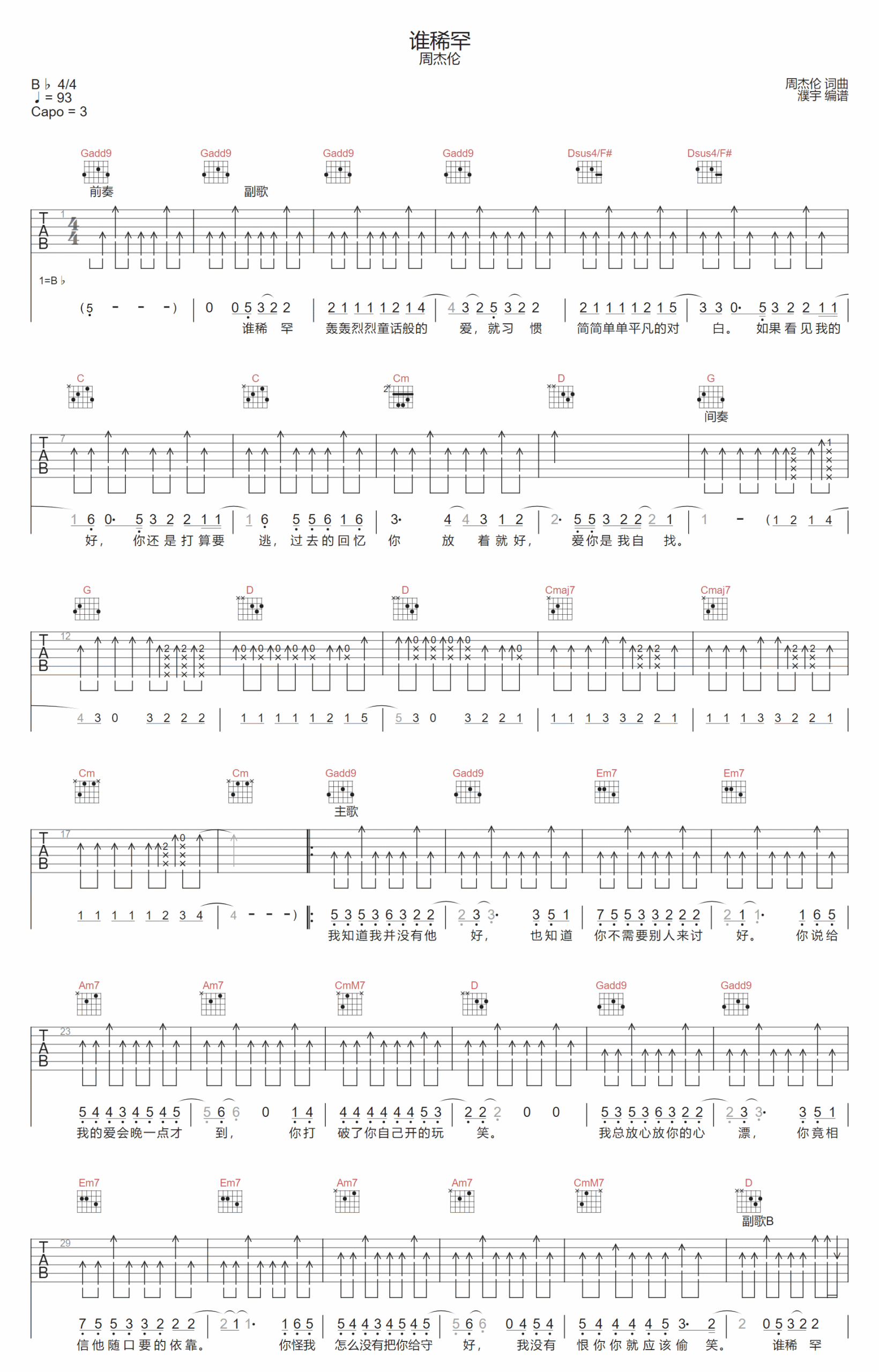 周杰伦《谁稀罕》吉他谱 G调扫弦版弹唱谱