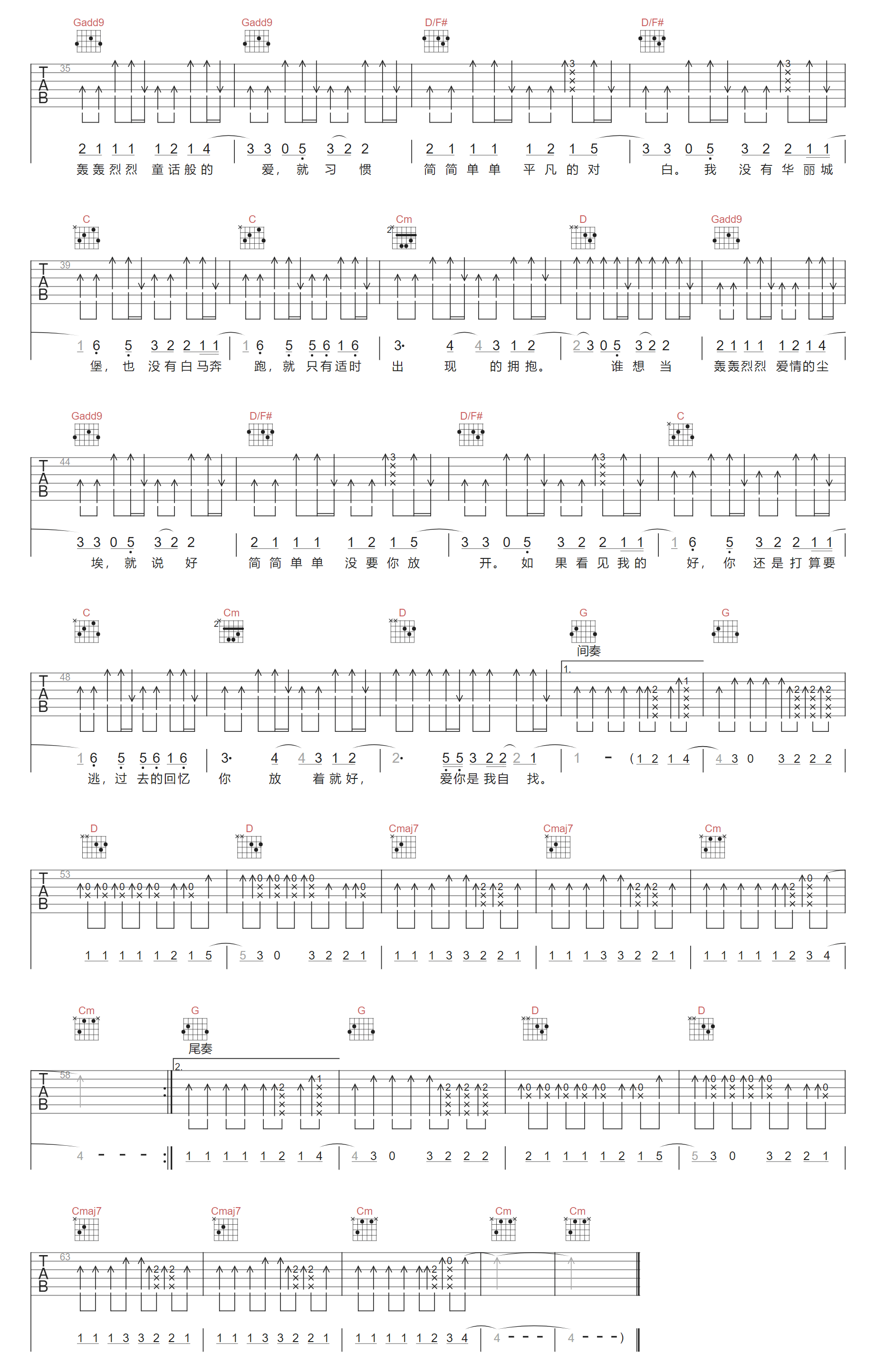 歌曲原调为降B调,此版本的曲谱来源于@濮宇,为4/4拍的节奏,按G调指法编配,共2张高清吉他谱,变调夹3品为原歌曲的调式,演唱时可按个人音域选择合适的变调夹位置。