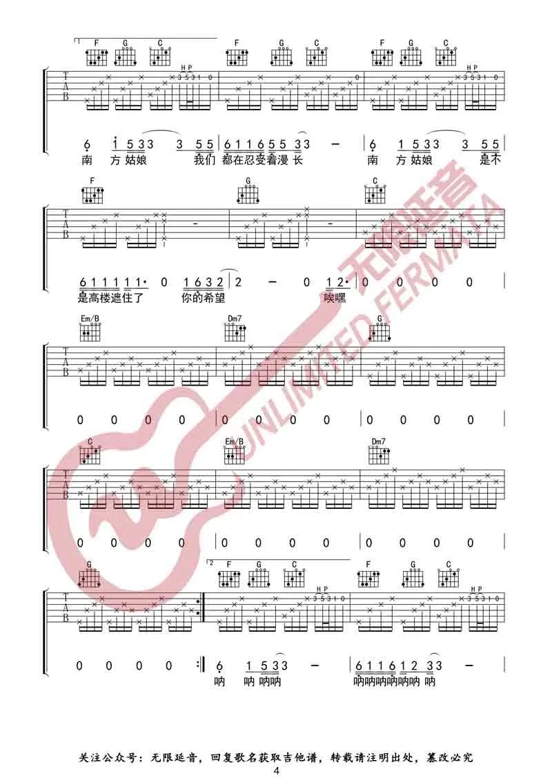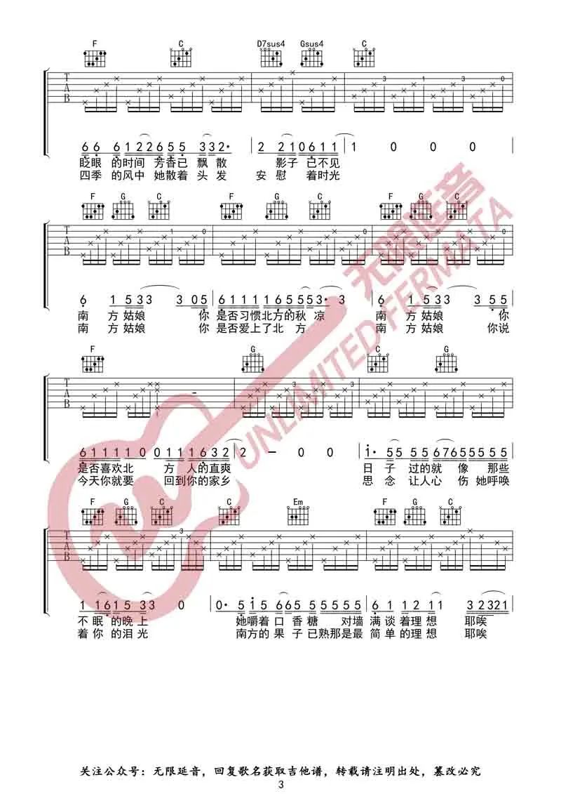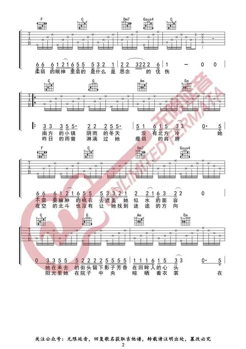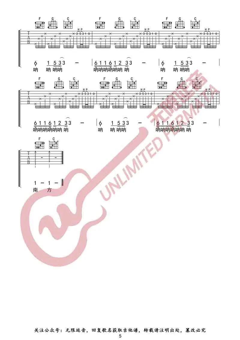 歌曲原调为F调,此版本的曲谱来源于@无限延音,为4/4拍的节奏,按C调指法编配,共5张高清吉他谱,变调夹5品为原歌曲的调式,演唱时可按个人音域选择合适的变调夹位置。