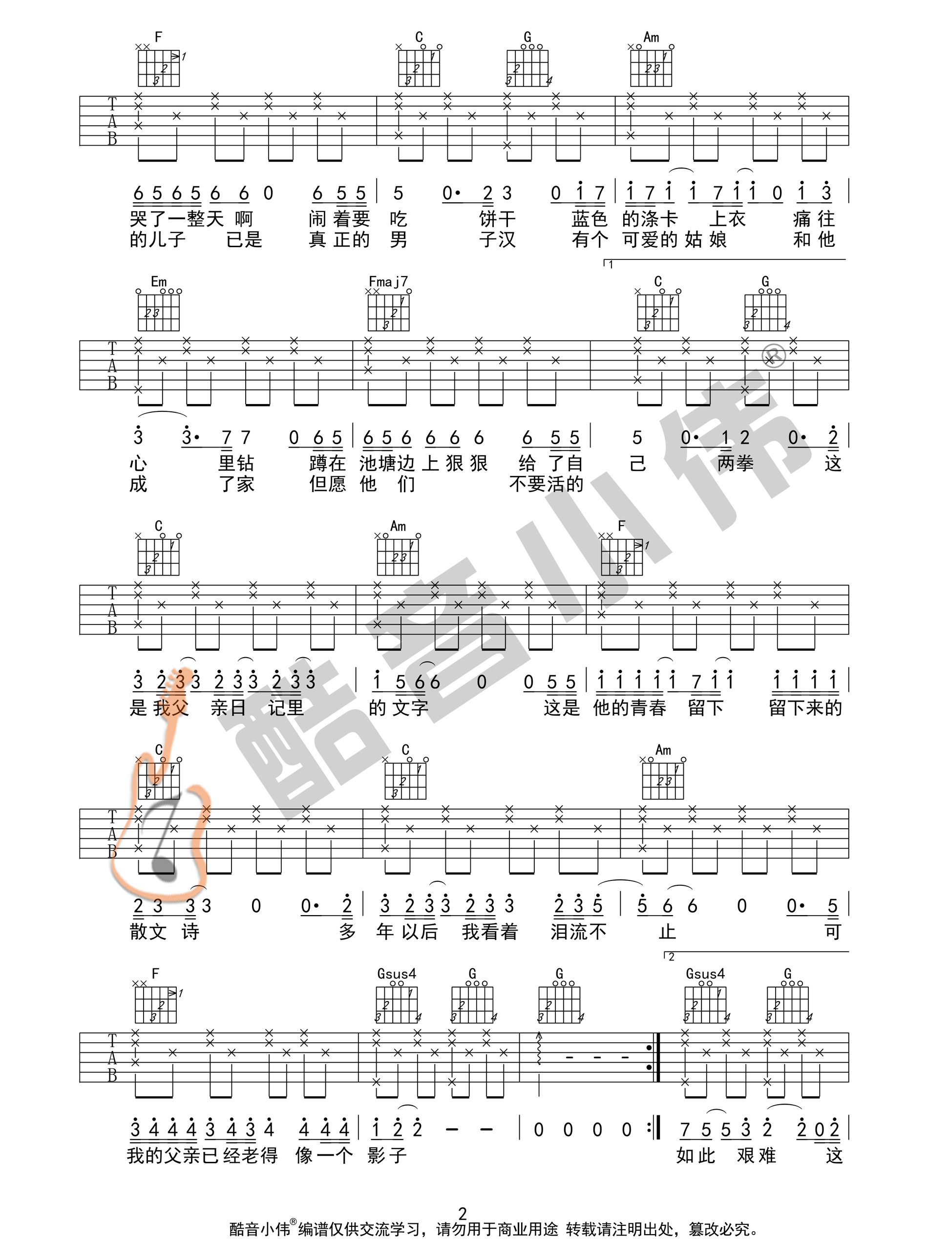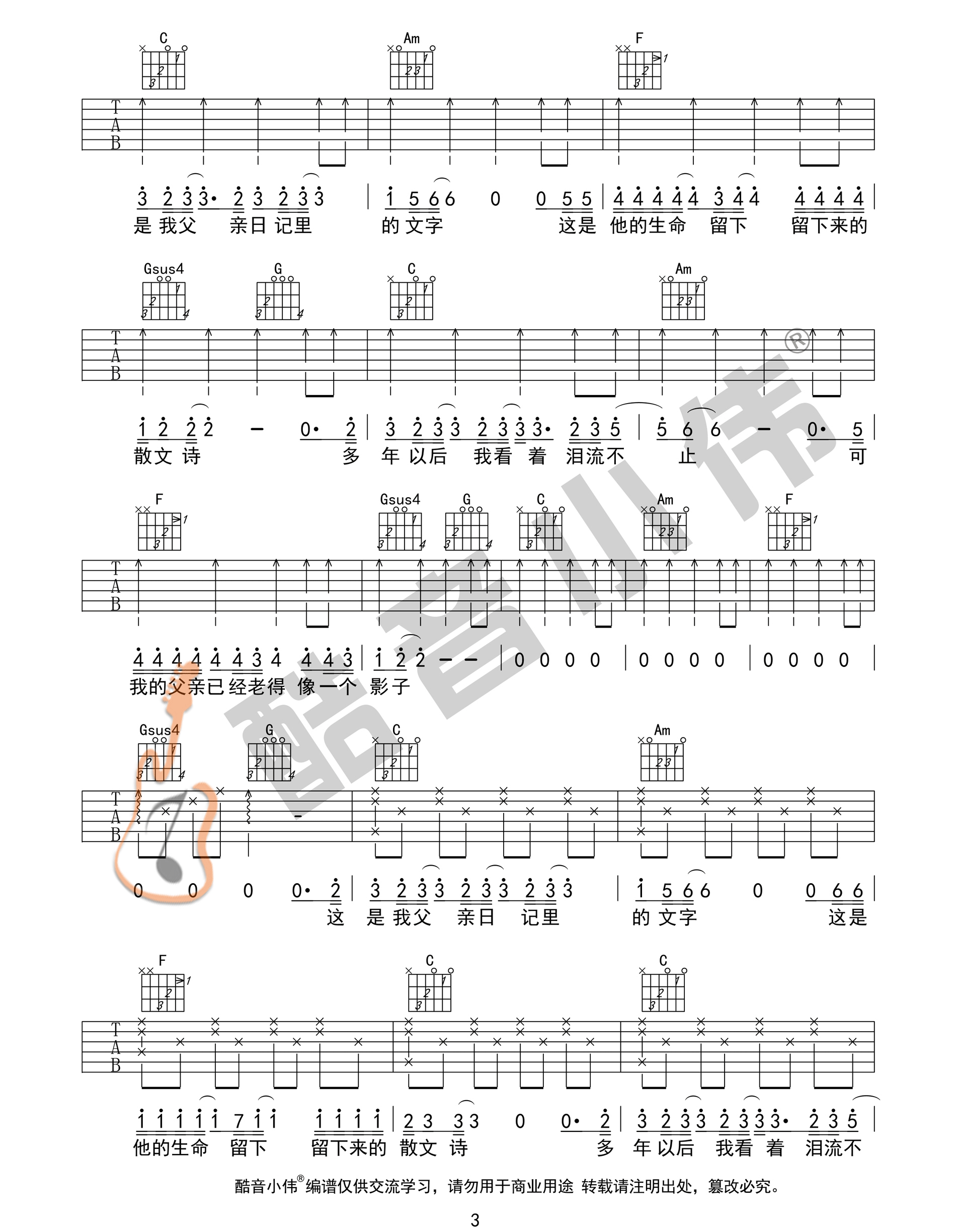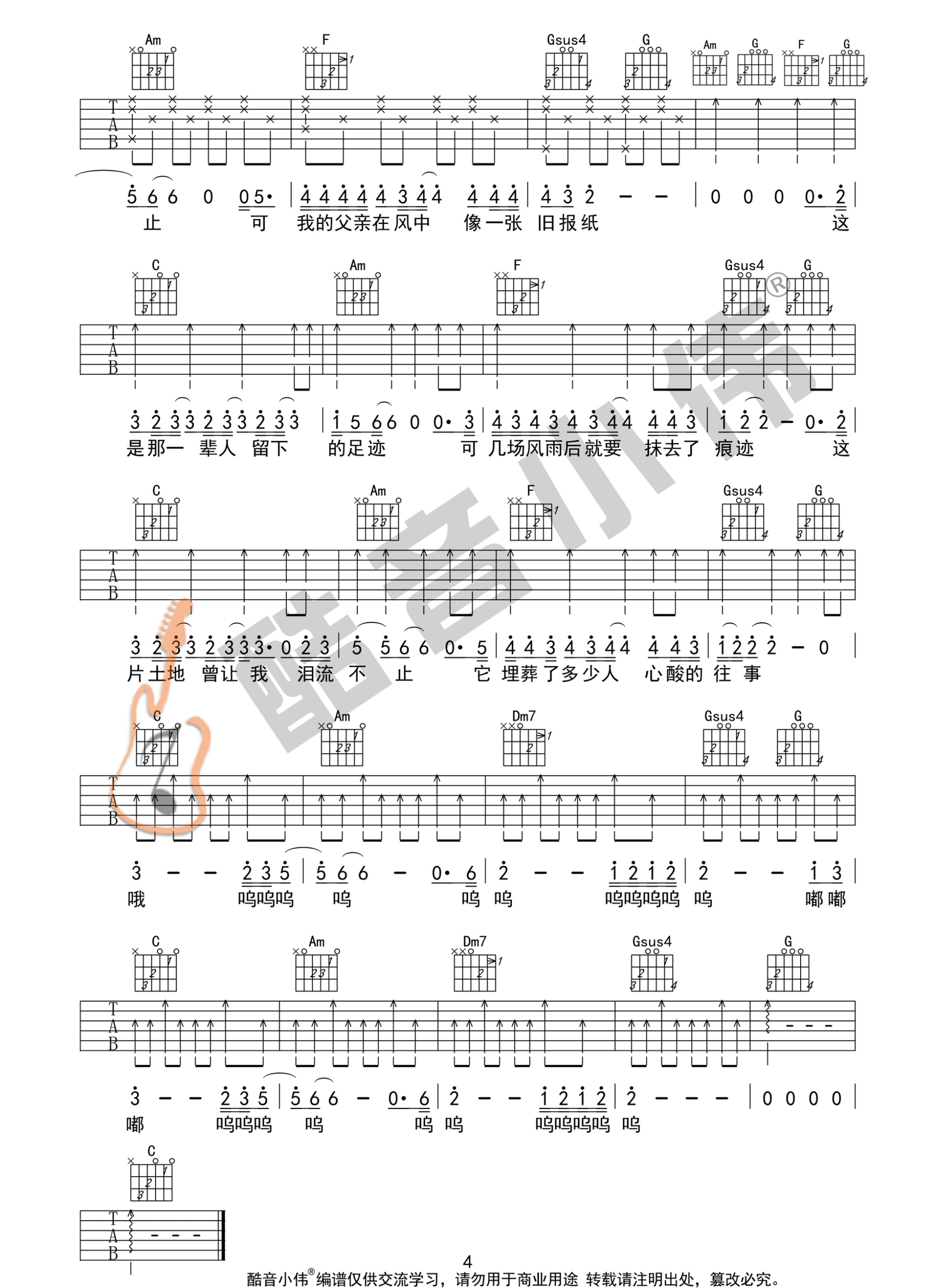 歌曲原调为C调,此版本的曲谱来源于@酷音小伟,为4/4拍的节奏,按C调指法编配,共4张高清吉他谱,变调夹不夹为原歌曲的调式,演唱时可按个人音域选择合适的变调夹位置。