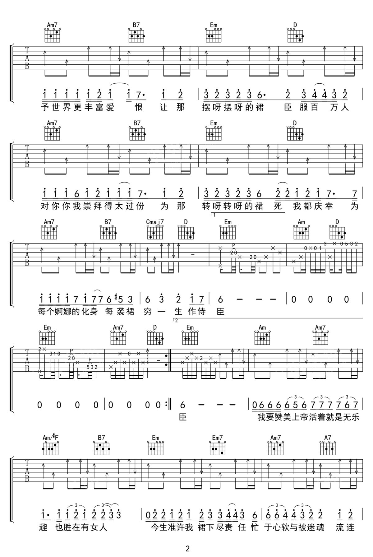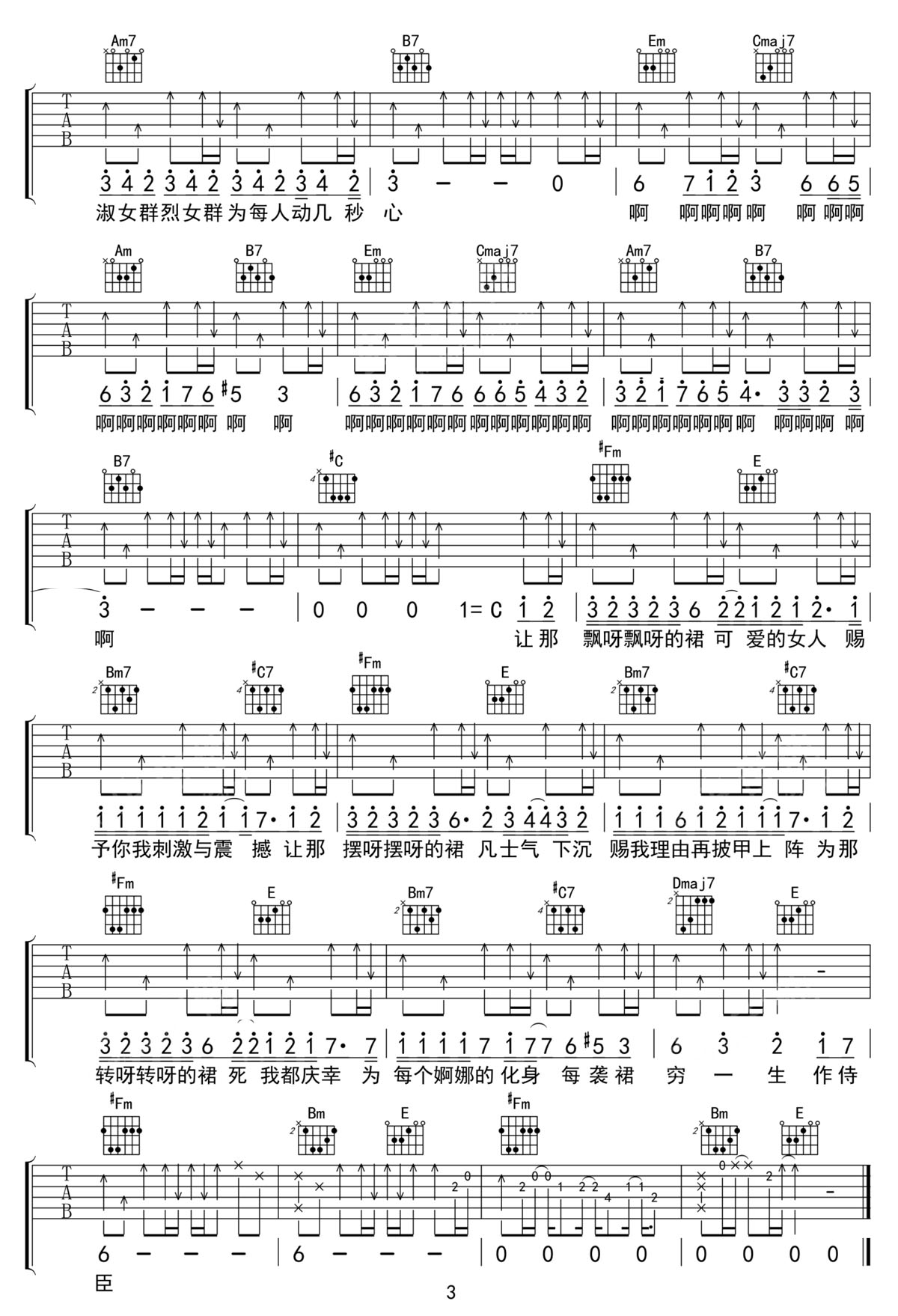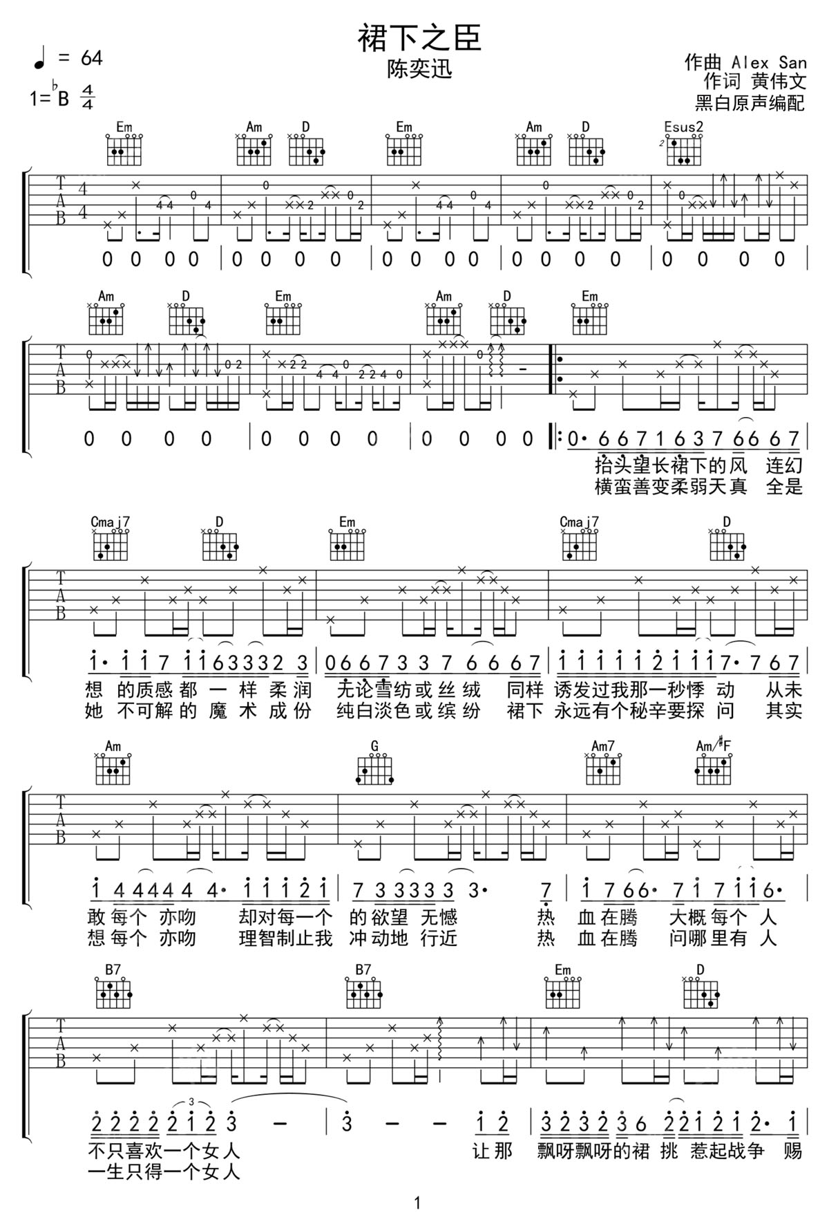 歌曲原调为降B调,此版本的曲谱来源于@黑白原声,为4/4拍的节奏,按G调指法编配,共3张高清吉他谱,变调夹3品为原歌曲的调式,演唱时可按个人音域选择合适的变调夹位置。
