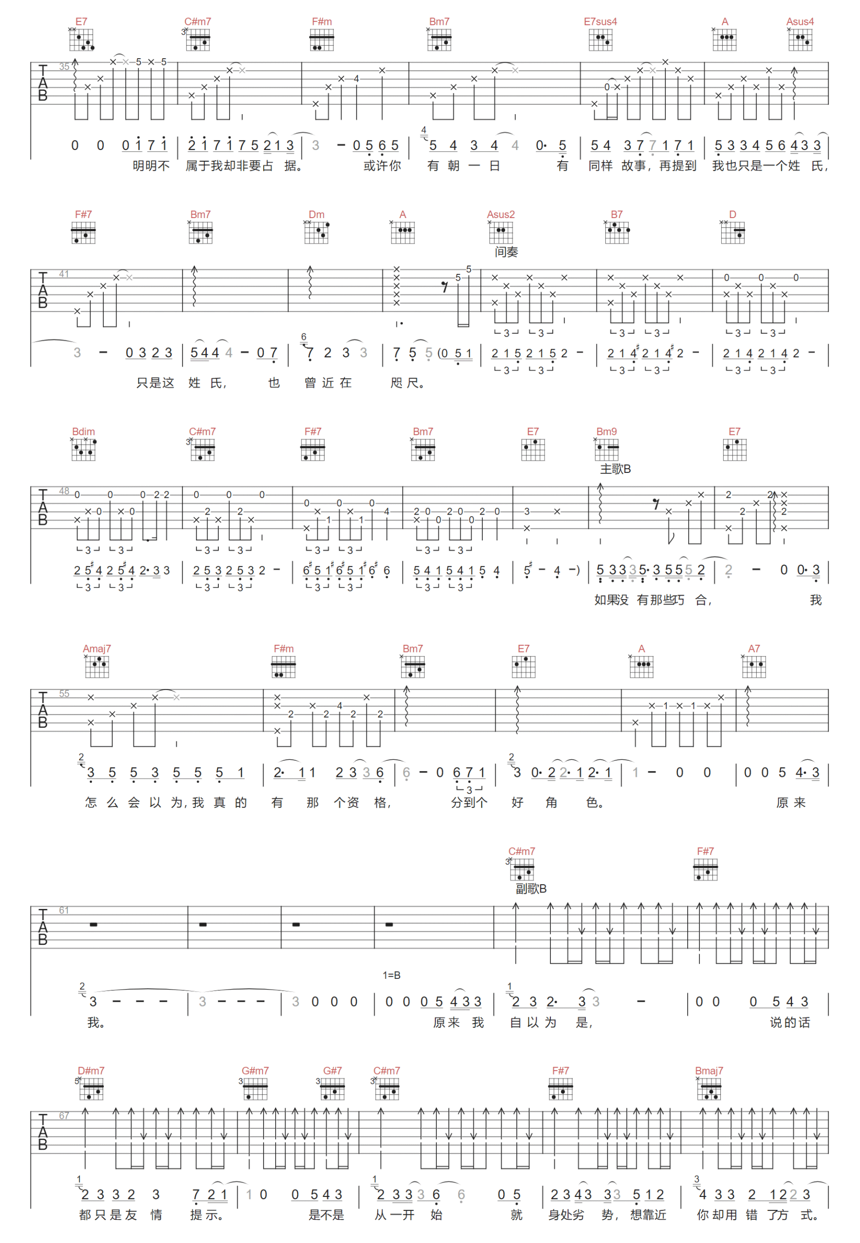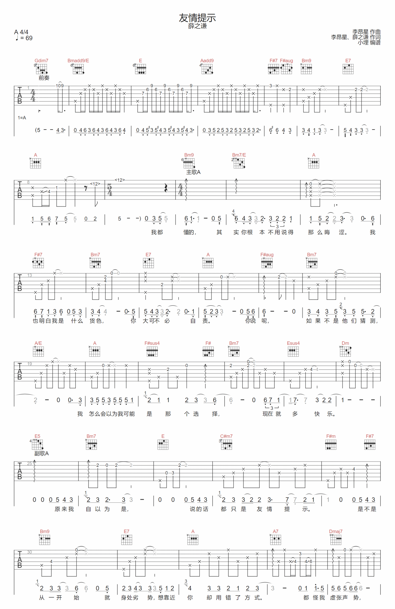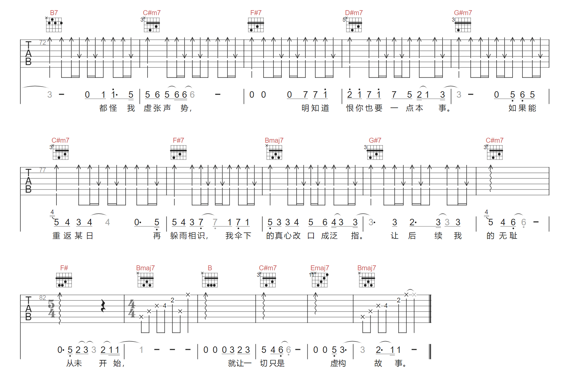 歌曲原调为A调,此版本的曲谱来源于@小埋,为4/4拍的节奏,按A调指法编配,共3张高清吉他谱,变调夹不夹为原歌曲的调式,演唱时可按个人音域选择合适的变调夹位置。