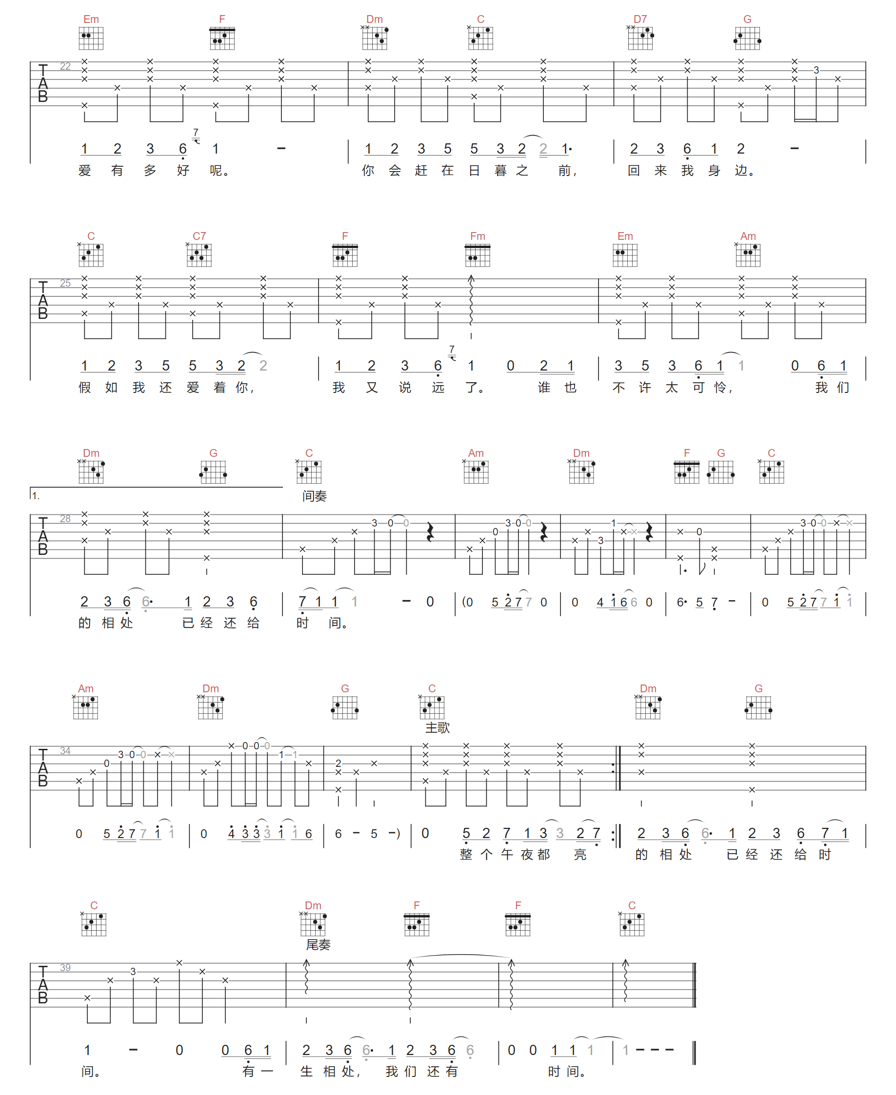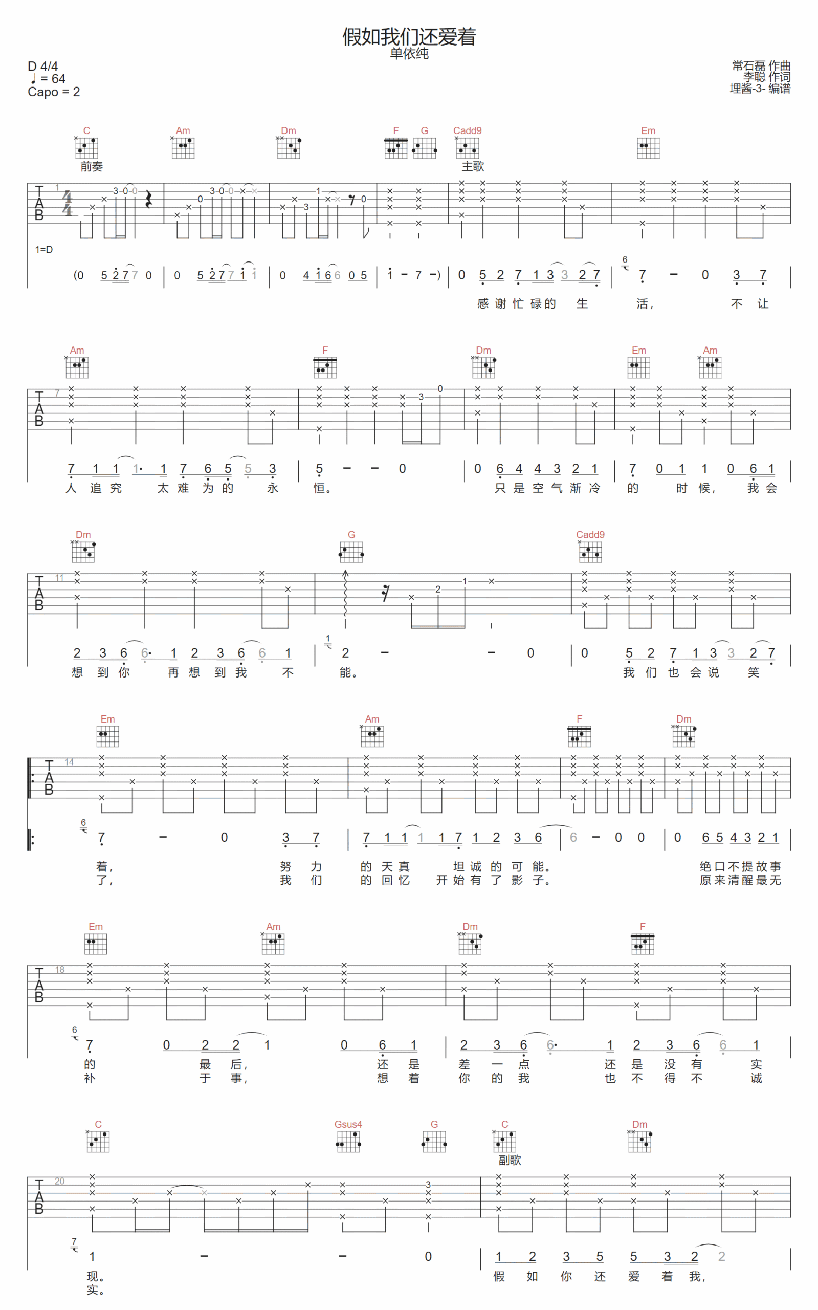 单依纯《假如我们还爱着》吉他谱 C调弹唱谱 爱乐谱 2026-03-06 0 歌曲原调为D调,此版本的曲谱来源于@埋酱,为4/4拍的节奏,按C调指法编配,共2张高清吉他谱,变调夹2品为原歌曲的调式,演唱时可按个人音域选择合适的变调夹位置。
