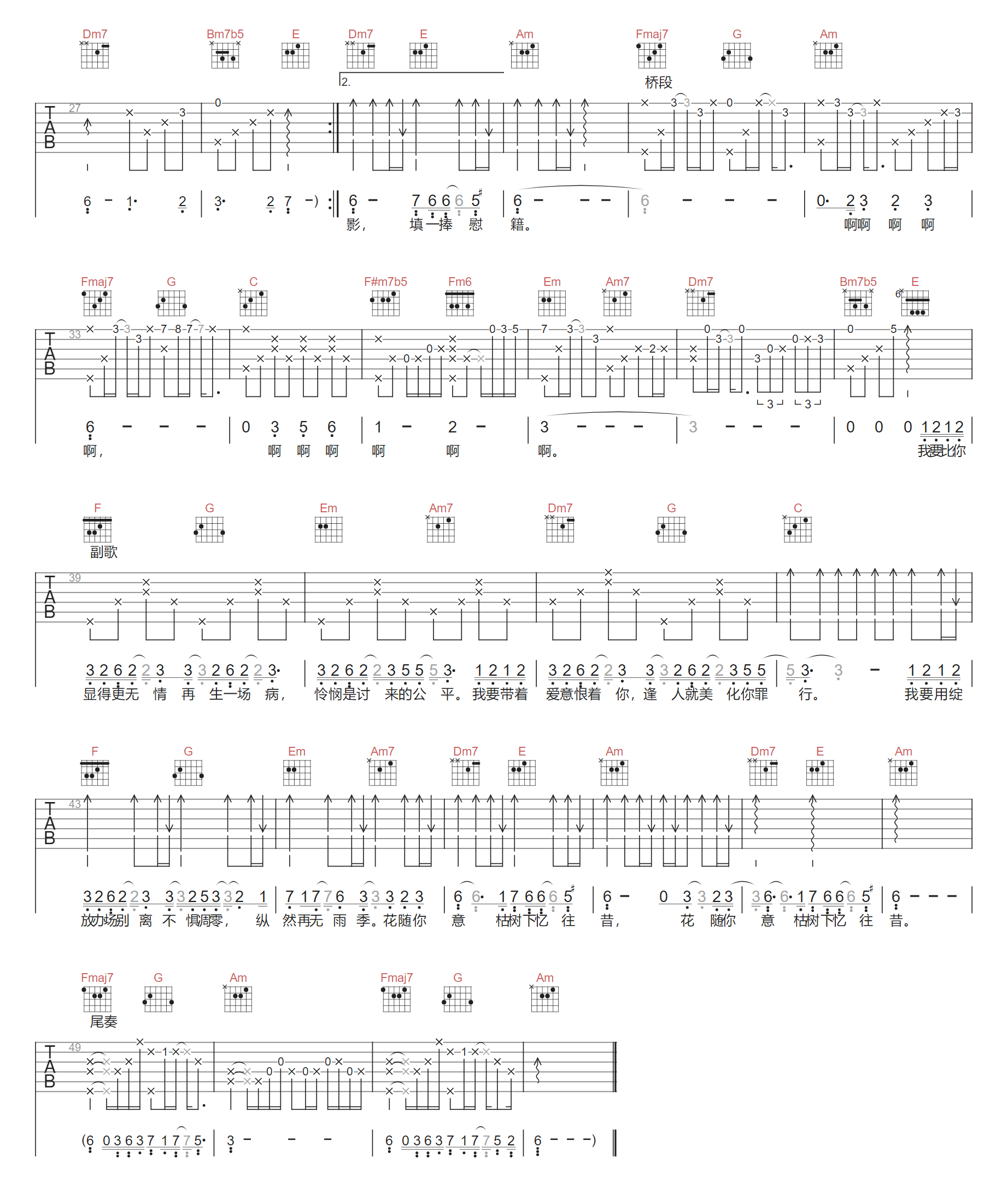 歌曲原调为F调,此版本的曲谱来源于@一颗加菲,为4/4拍的节奏,按C调指法编配,共2张高清吉他谱,变调夹4品为原歌曲的调式,演唱时可按个人音域选择合适的变调夹位置。