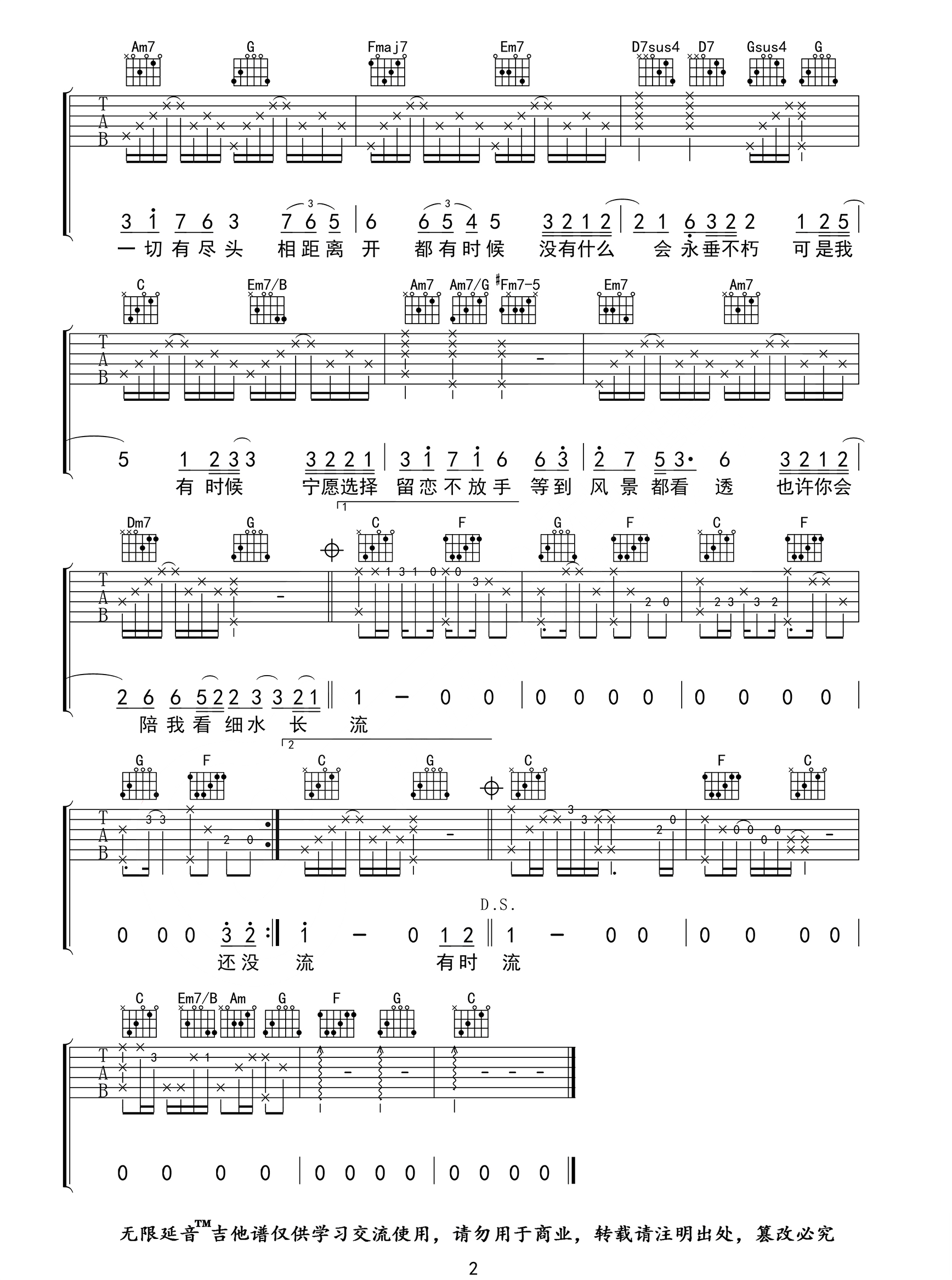 歌曲原调为C调,此版本的曲谱来源于@无限延音,为4/4拍的节奏,按C调指法编配,共2张高清吉他谱,变调夹不夹为原歌曲的调式,演唱时可按个人音域选择合适的变调夹位置。