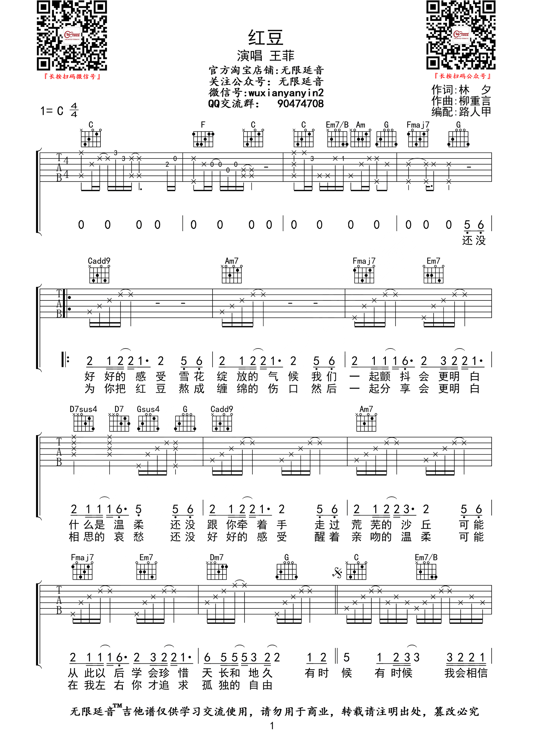 王菲《红豆》吉他谱 C调弹唱乐谱
