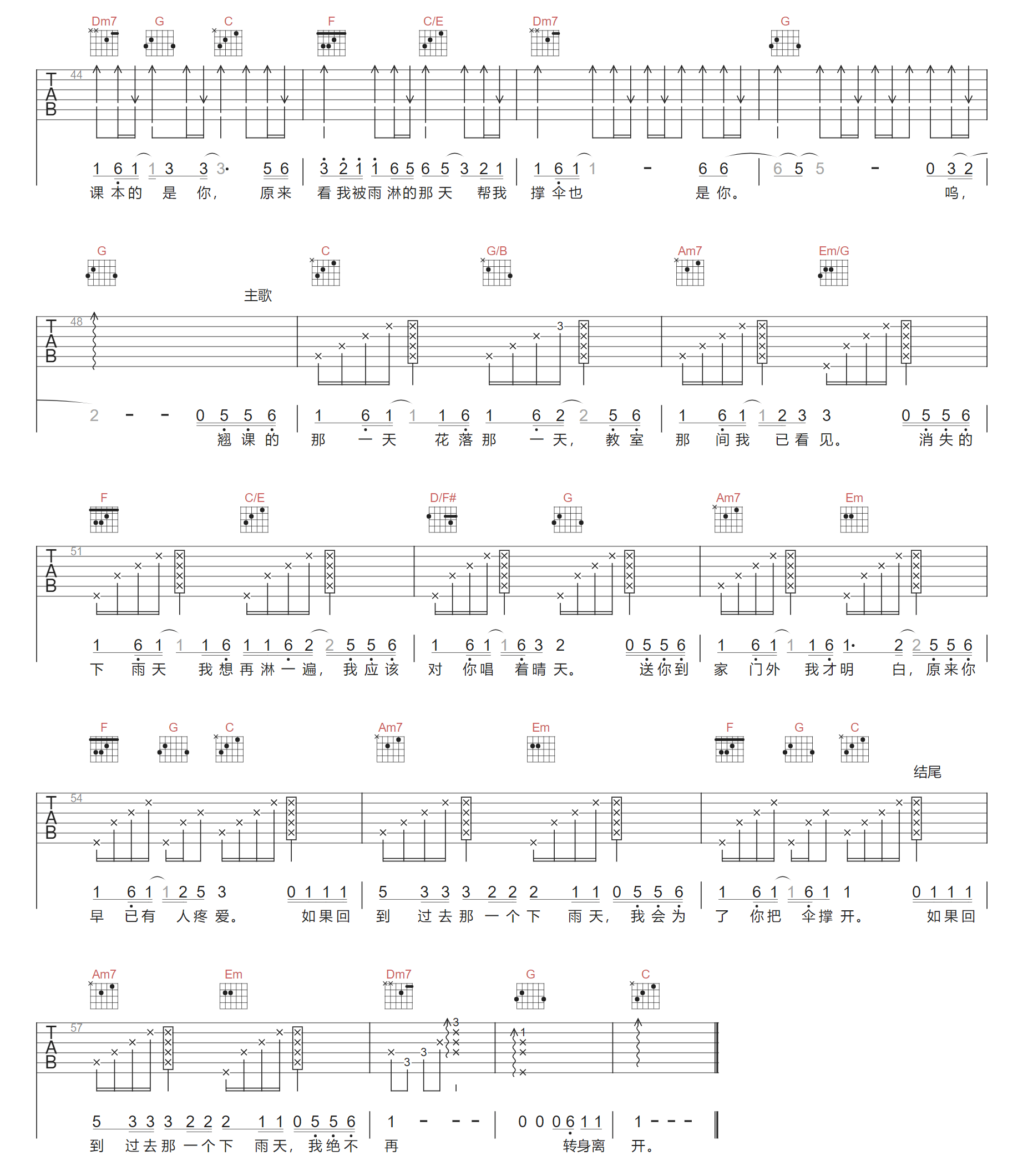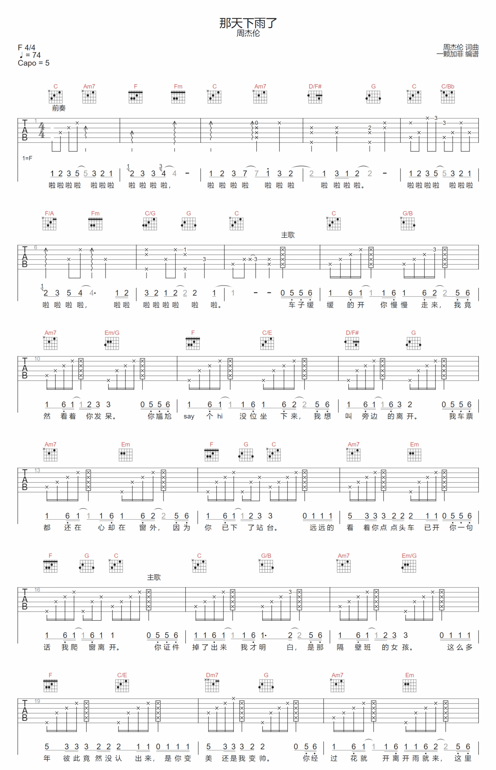 周杰伦《那天下雨了》吉他谱 C调弹唱谱