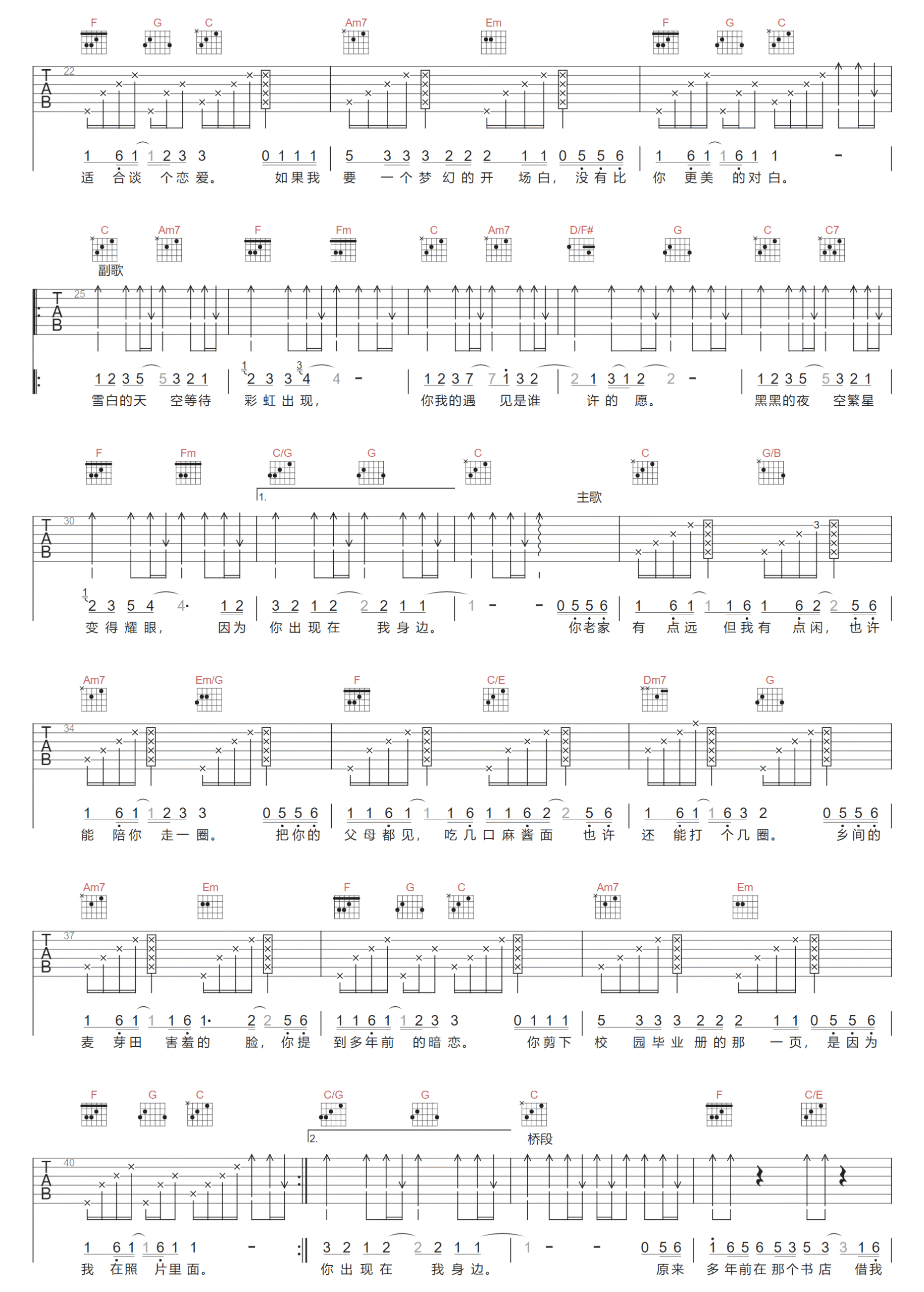 歌曲原调为F调,此版本的曲谱来源于@一颗加菲,为4/4拍的节奏,按C调指法编配,共3张高清吉他谱,变调夹5品为原歌曲的调式,演唱时可按个人音域选择合适的变调夹位置。