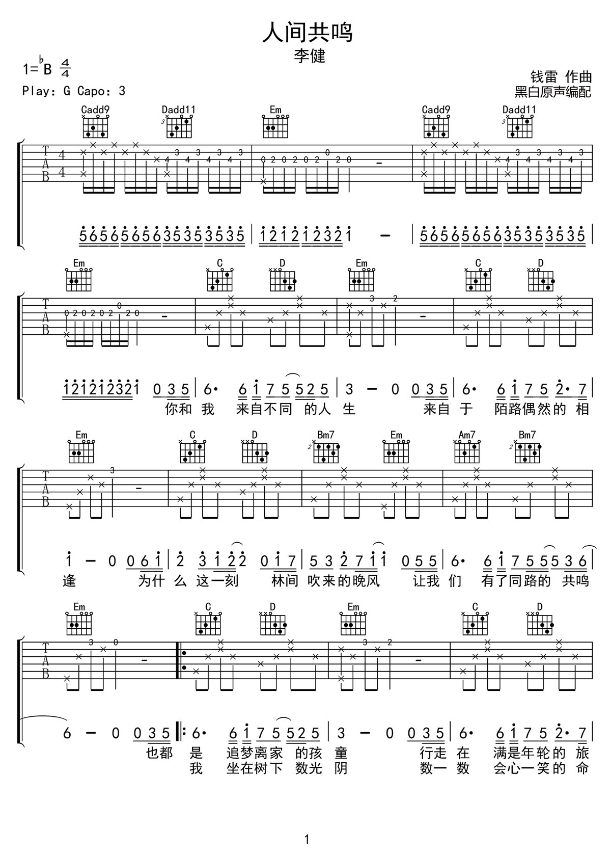 歌曲原调为降B调,此版本的曲谱来源于@黑白原声,为4/4拍的节奏,按G调指法编配,共3张高清吉他谱,变调夹3品为原歌曲的调式,演唱时可按个人音域选择合适的变调夹位置。