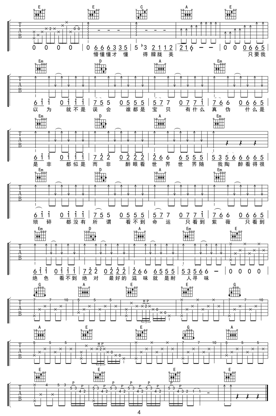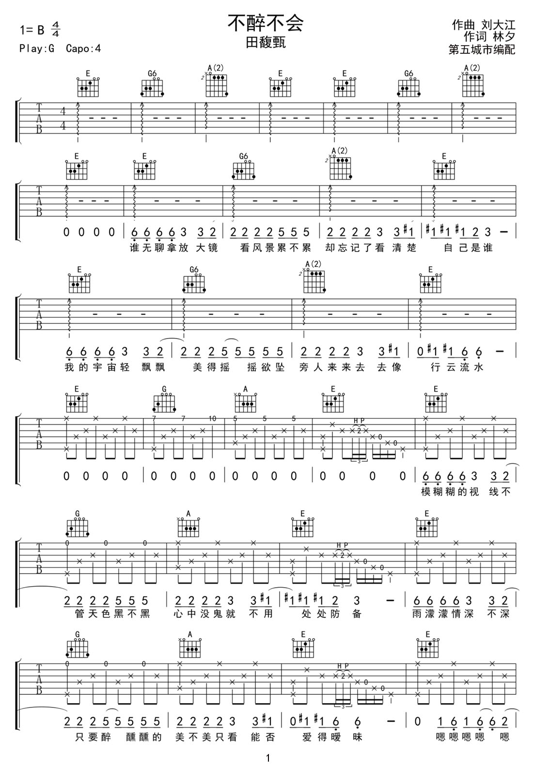 歌曲原调为B调,此版本的曲谱来源于@网络转载,为4/4拍的节奏,按G调指法编配,共4张高清吉他谱,变调夹4品为原歌曲的调式,演唱时可按个人音域选择合适的变调夹位置。