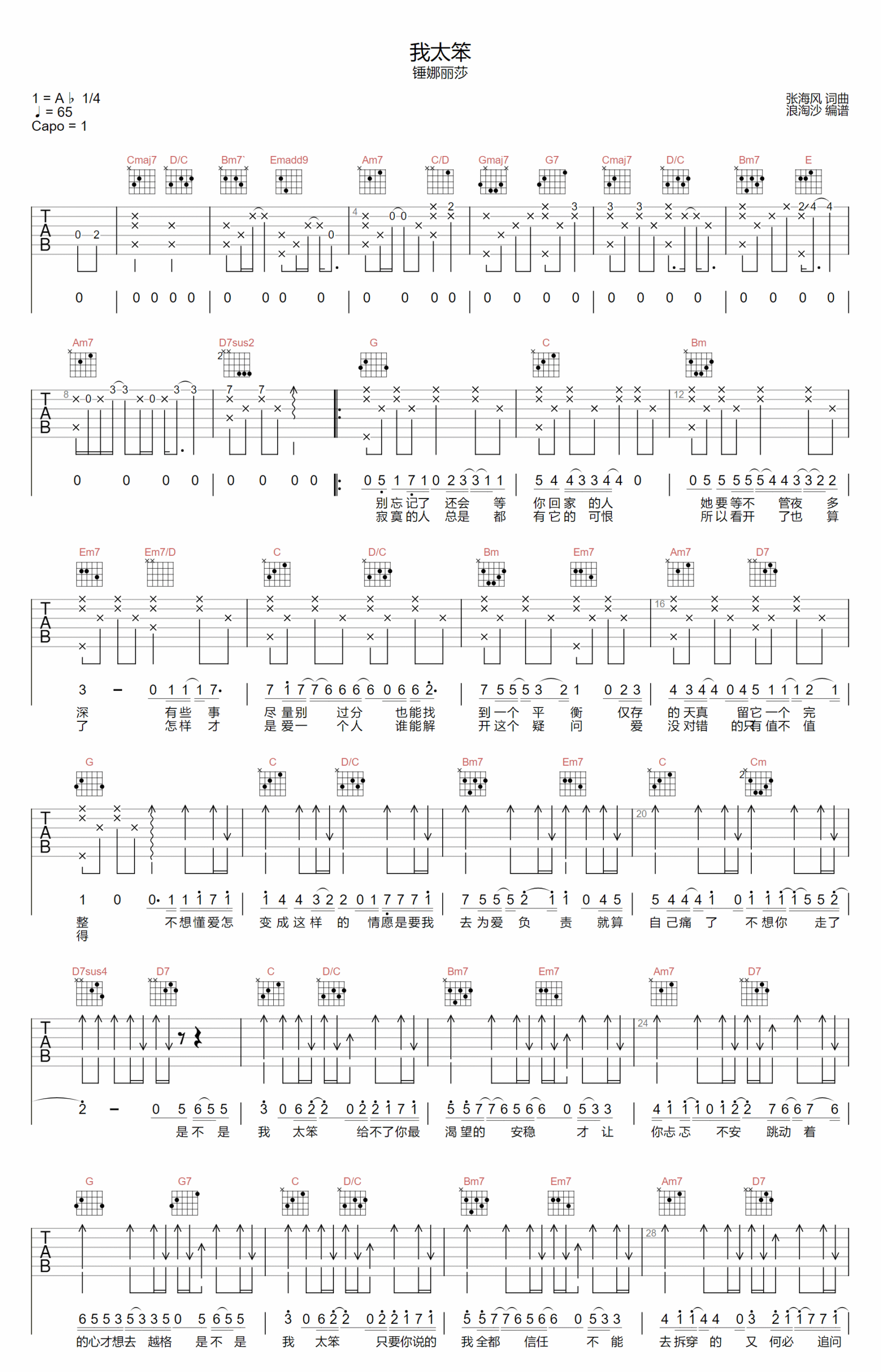 锤娜丽莎《我太笨》吉他谱 G调原版弹唱谱