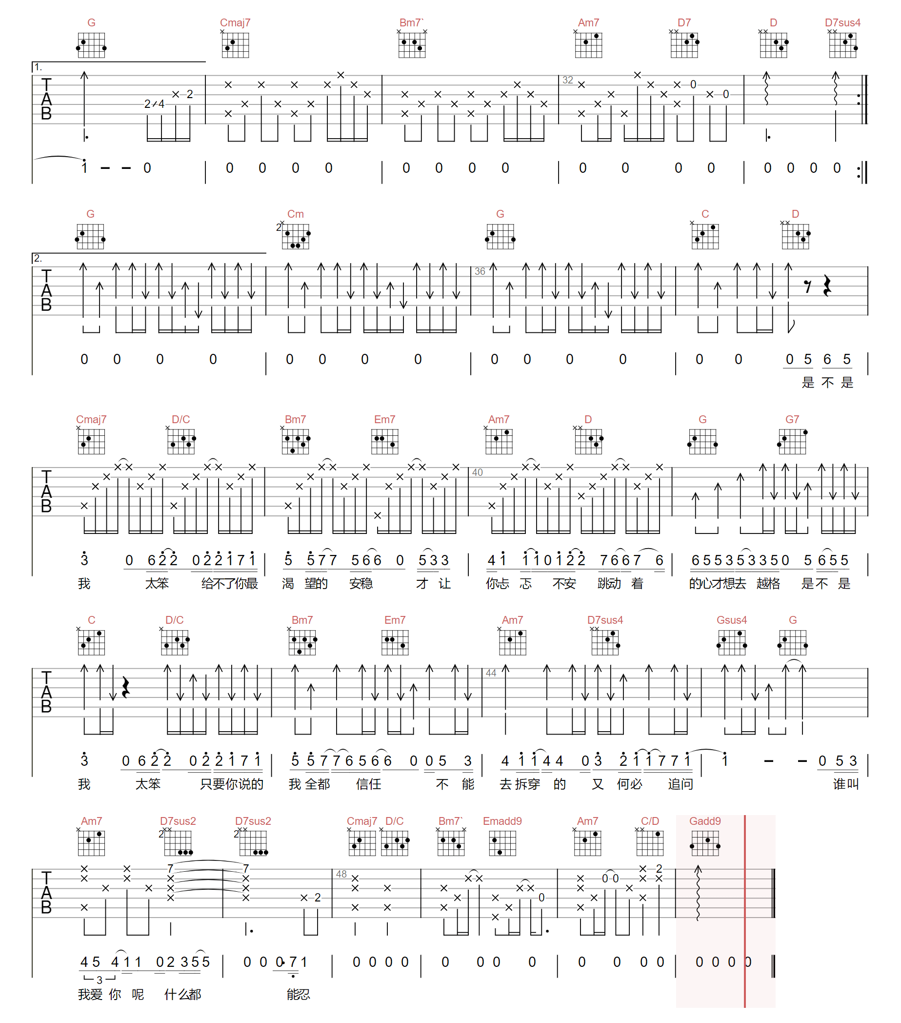 歌曲原调为降A调,此版本的曲谱来源于@浪淘沙,为4/4拍的节奏,按G调指法编配,共2张高清吉他谱,变调夹1品为原歌曲的调式,演唱时可按个人音域选择合适的变调夹位置。