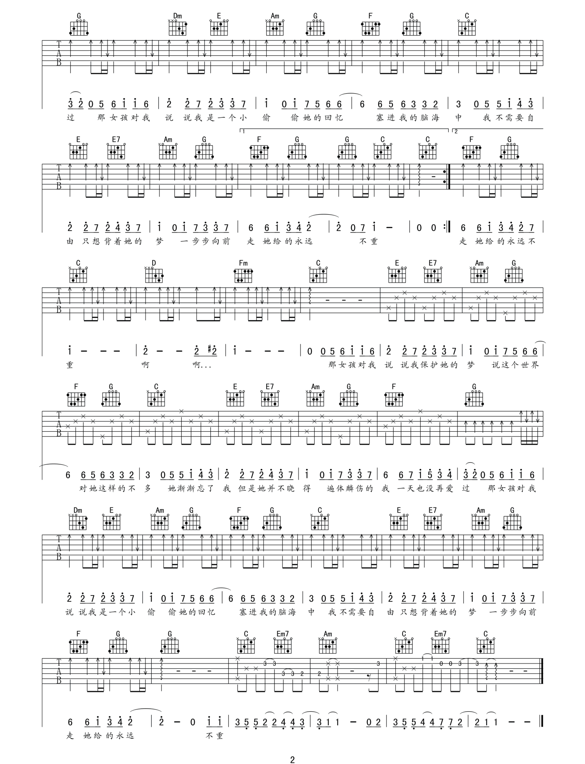 歌曲原调为C调,此版本的曲谱来源于@网络转载,为4/4拍的节奏,按C调指法编配,共2张高清吉他谱,变调夹不夹为原歌曲的调式,演唱时可按个人音域选择合适的变调夹位置。