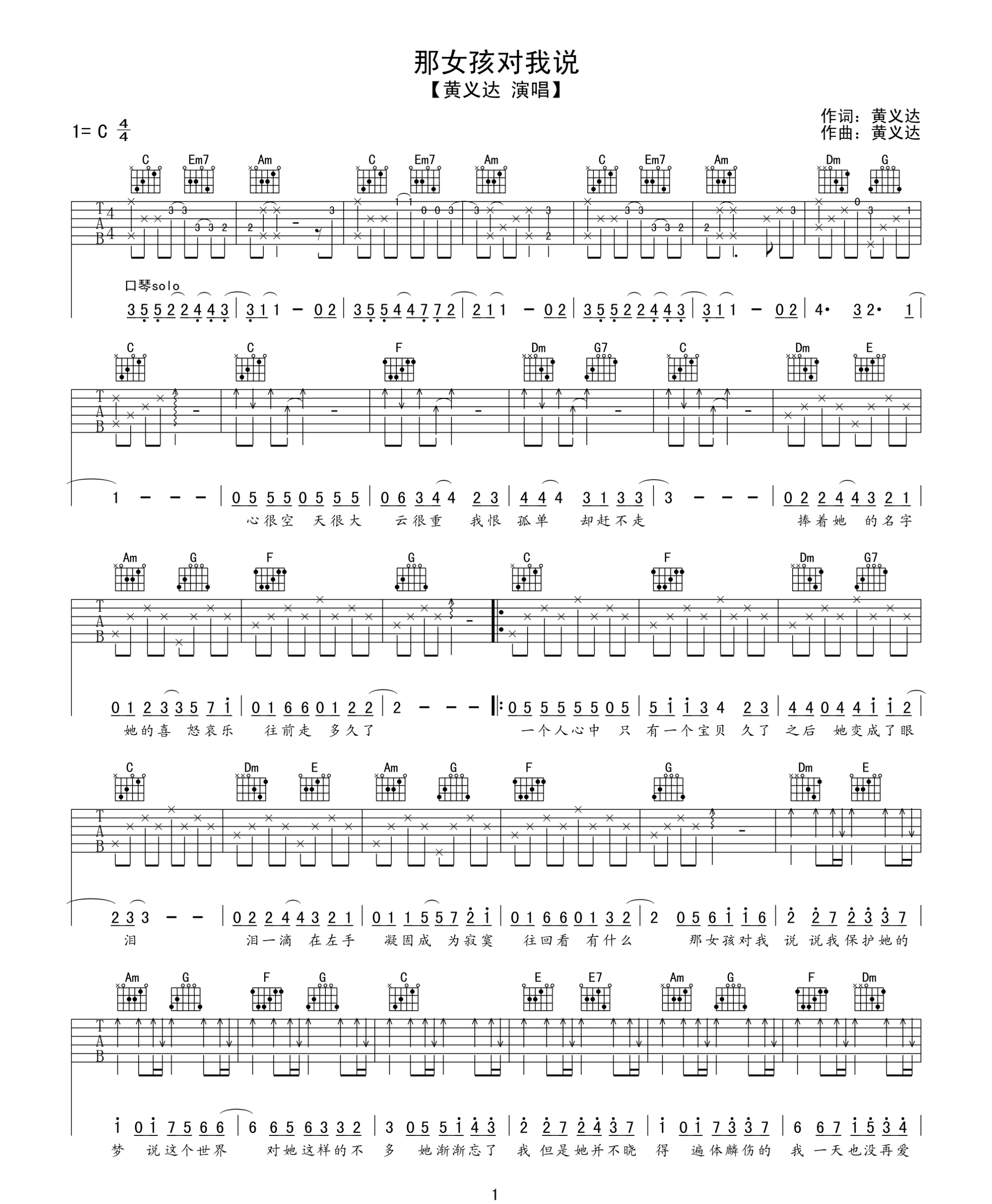 黄义达《那女孩对我说》吉他谱 C调弹唱谱