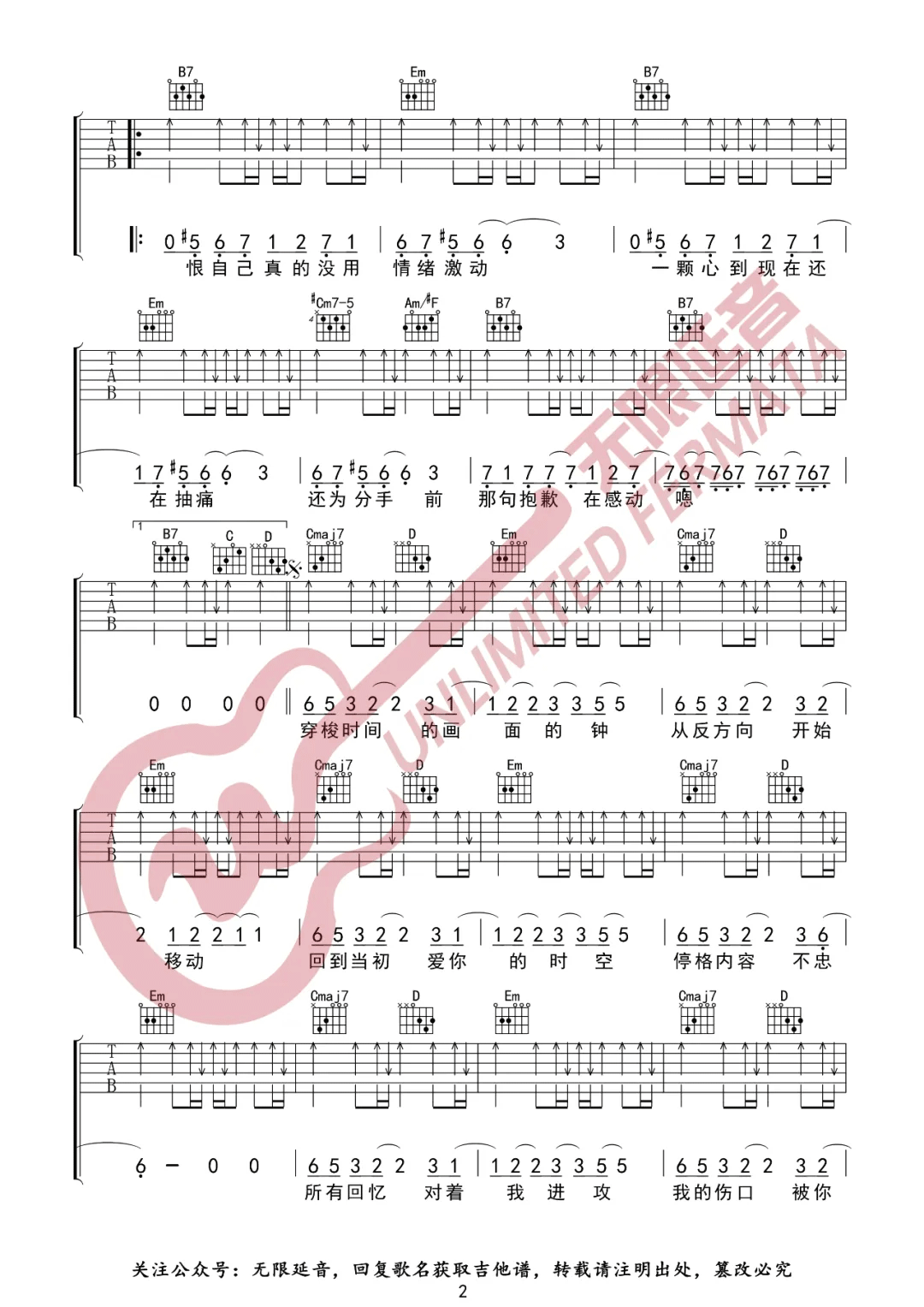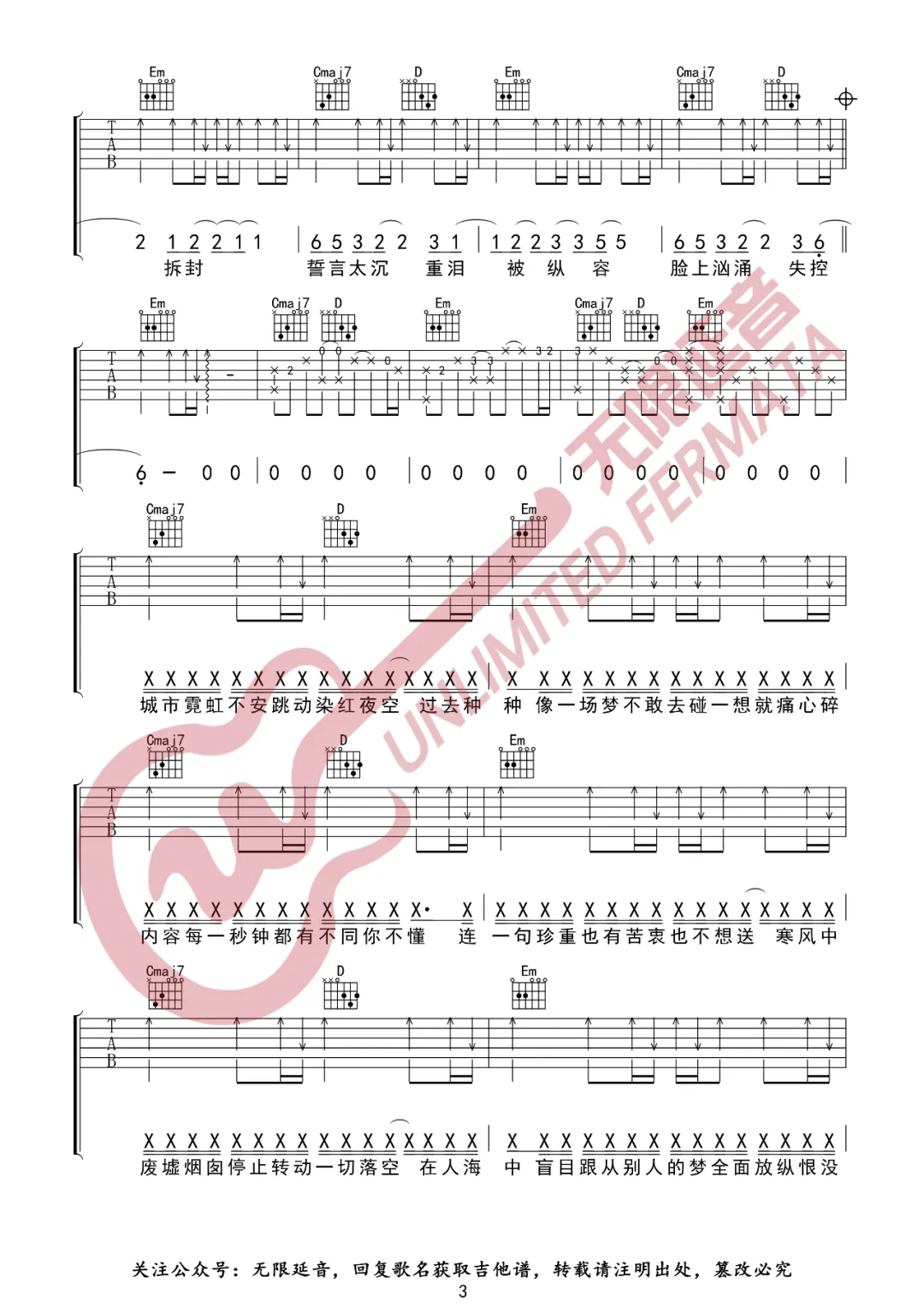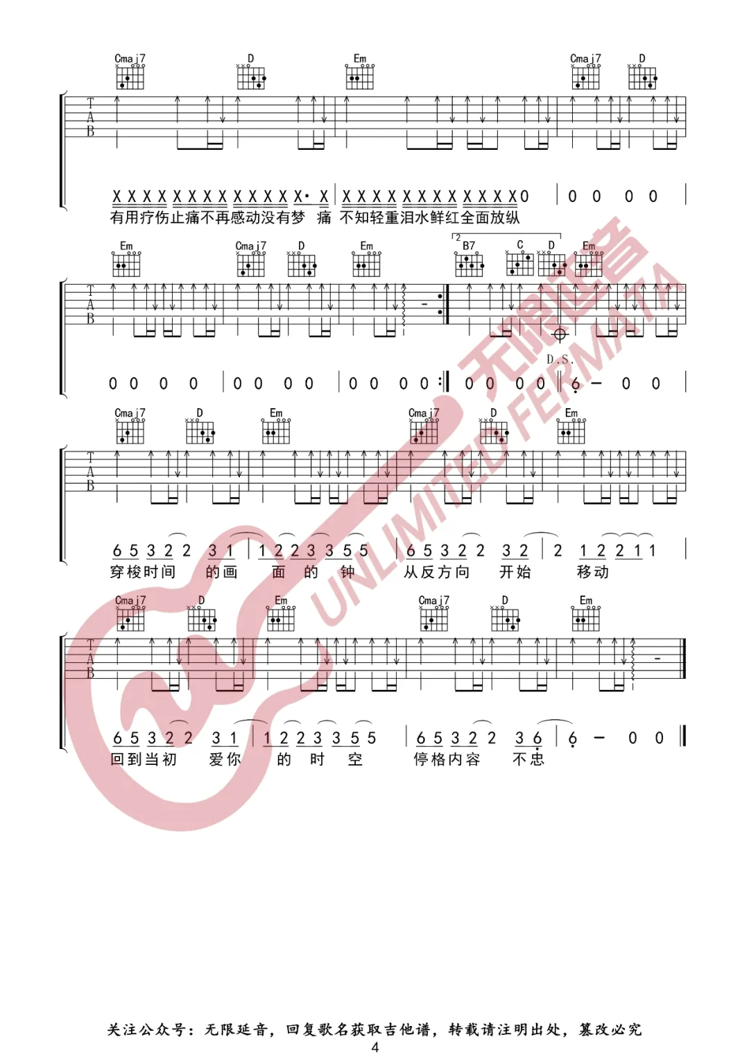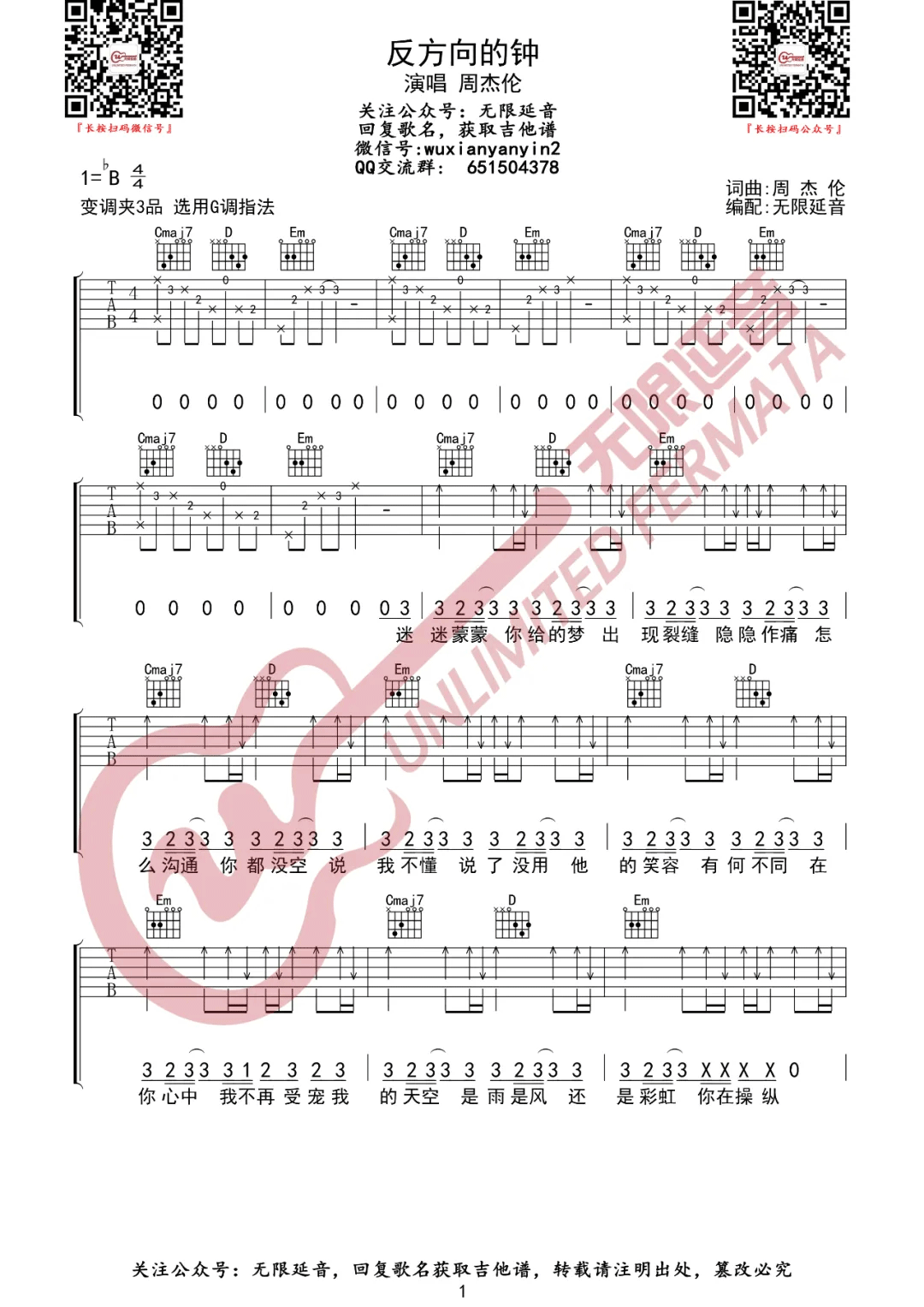 歌曲原调为降B调,此版本的曲谱来源于@无限延音,为4/4拍的节奏,按G调指法编配,共4张高清吉他谱,变调夹3品为原歌曲的调式,演唱时可按个人音域选择合适的变调夹位置。