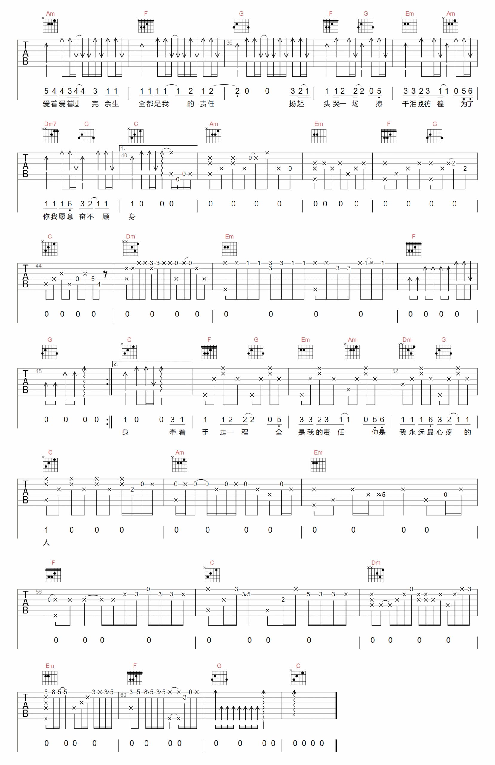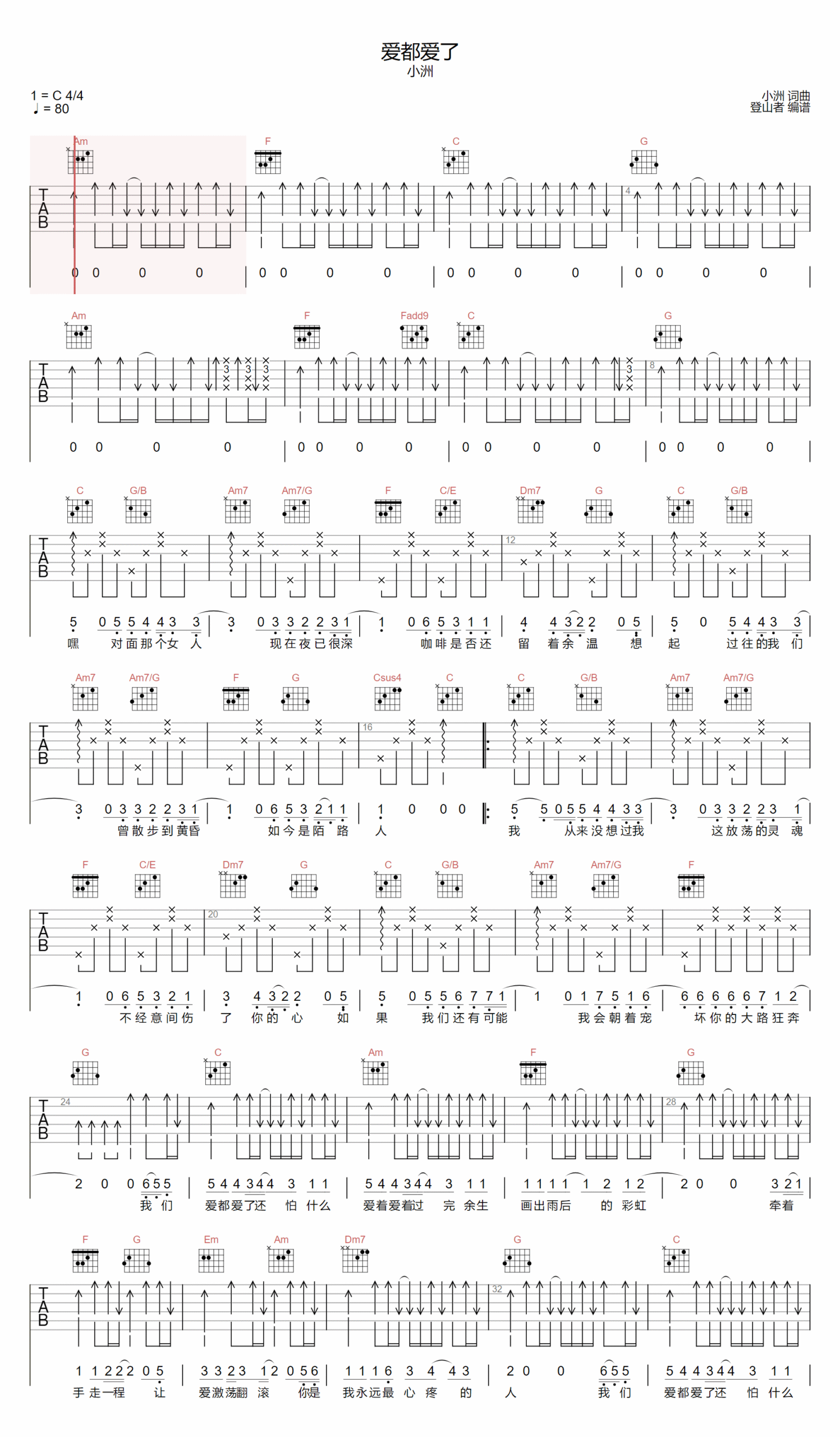 歌曲原调为C调,此版本的曲谱来源于@登山者,为4/4拍的节奏,按C调指法编配,共2张高清吉他谱,变调夹不夹为原歌曲的调式,演唱时可按个人音域选择合适的变调夹位置。
