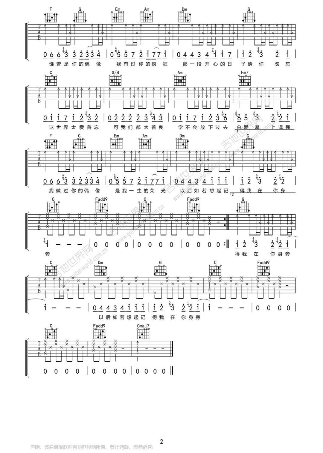 歌曲原调为C调,此版本的曲谱来源于@秃老师,为4/4拍的节奏,按C调指法编配,共2张高清吉他谱,变调夹不夹为原歌曲的调式,演唱时可按个人音域选择合适的变调夹位置。