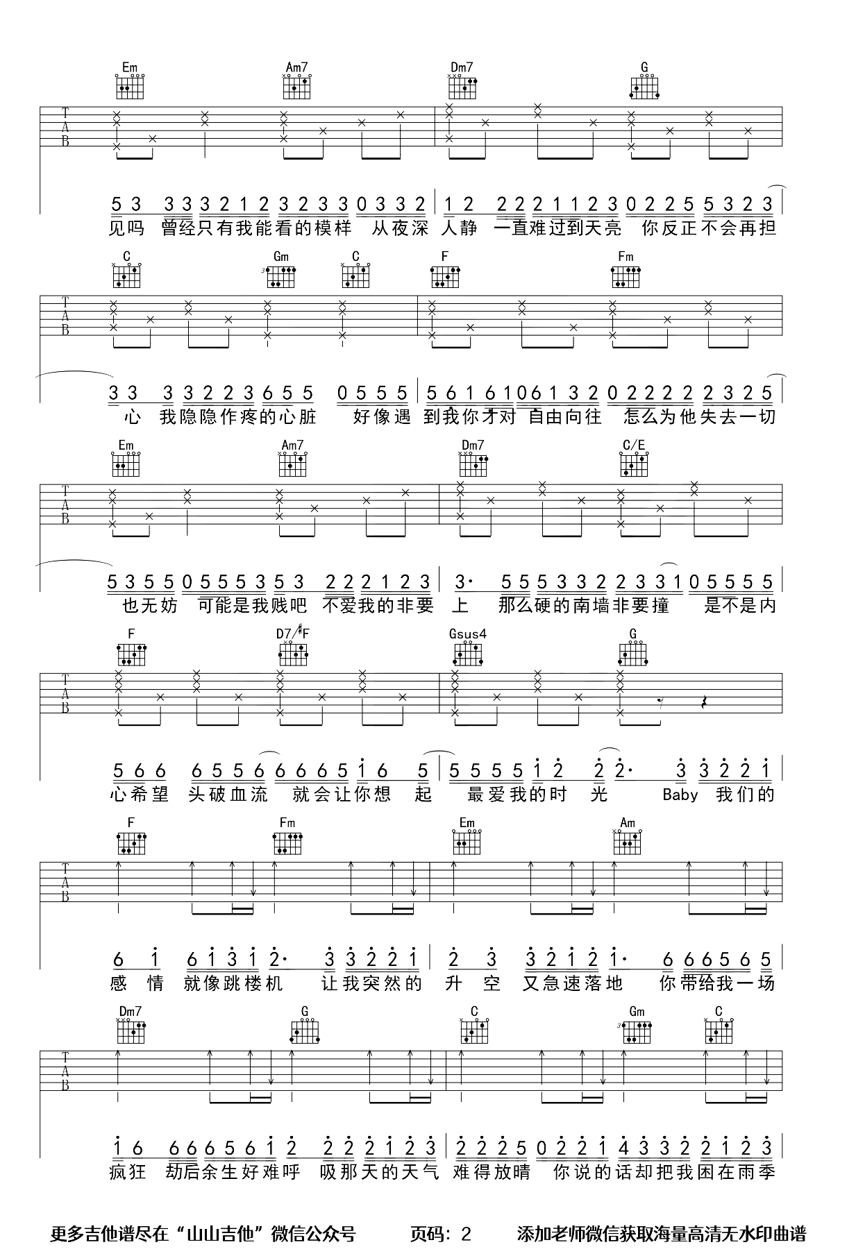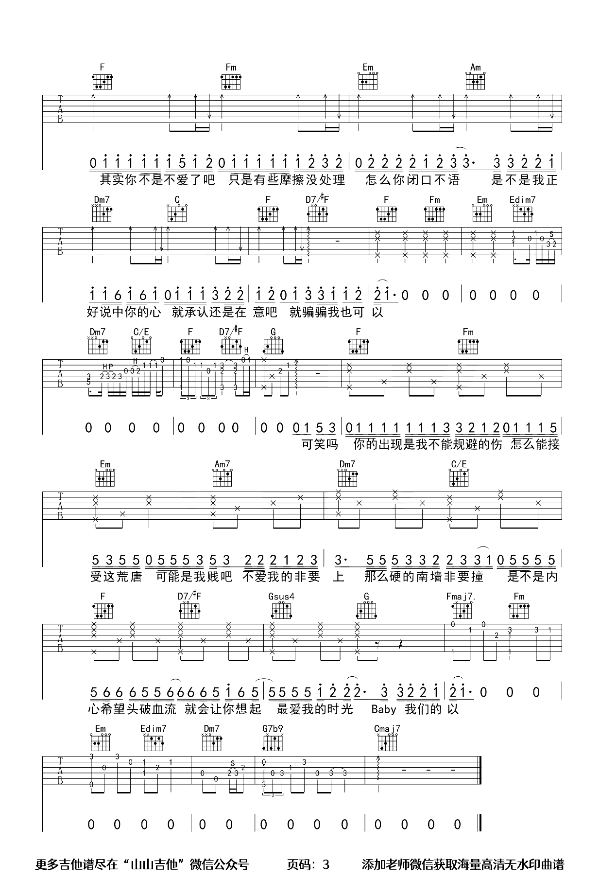 歌曲原调为#F调,此版本的曲谱来源于@山山吉他,为4/4拍的节奏,按C调指法编配,共3张高清吉他谱,变调夹6品为原歌曲的调式,演唱时可按个人音域选择合适的变调夹位置。