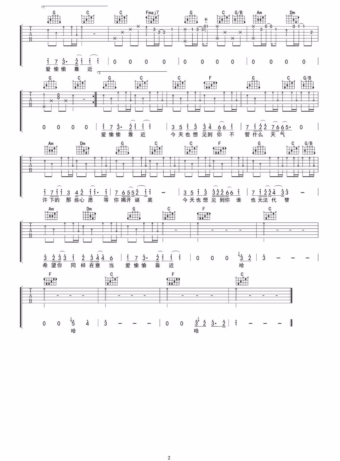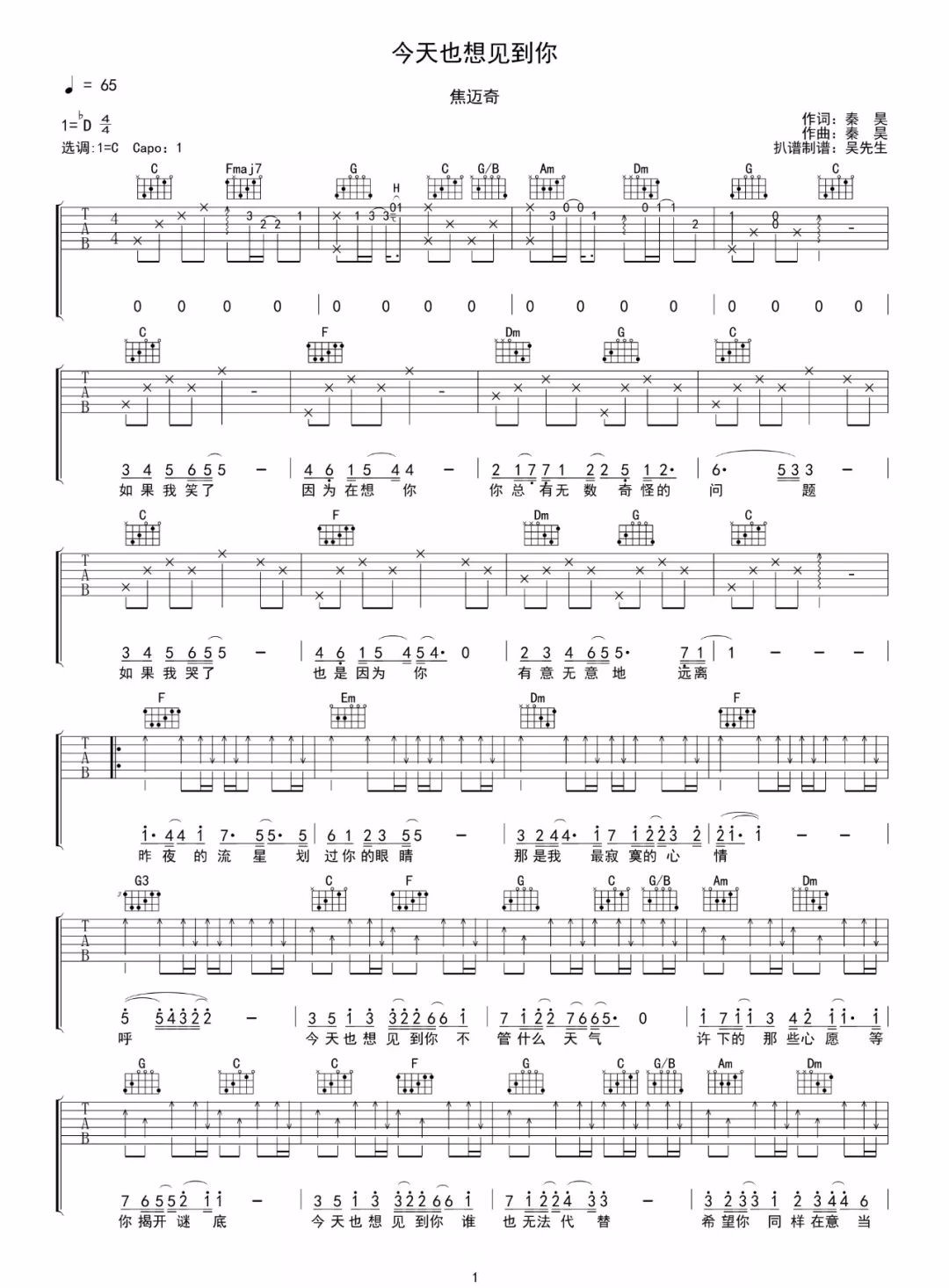 焦迈奇《今天也想见到你》吉他谱 C调弹唱谱 高清乐谱图