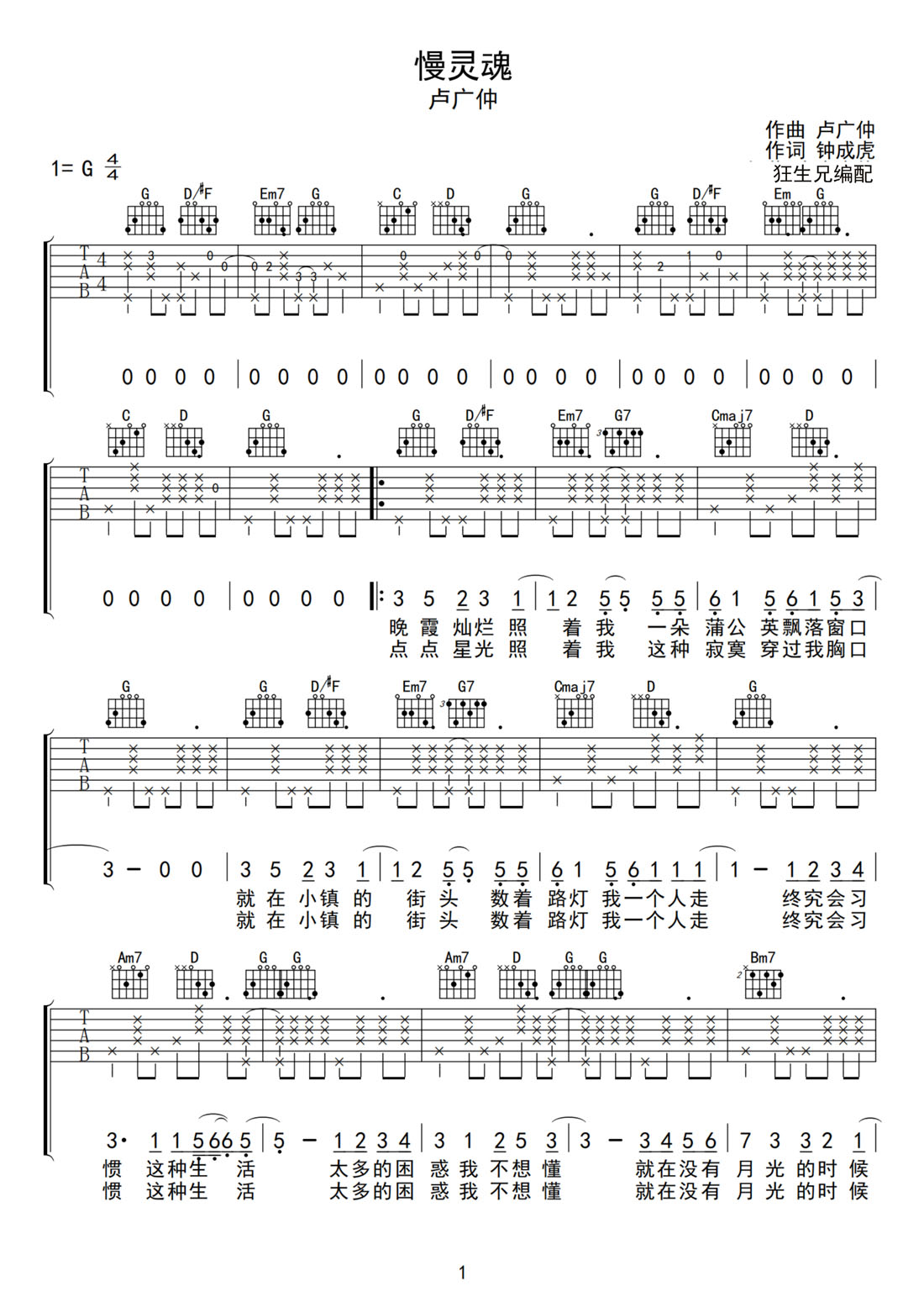 卢广仲《慢灵魂》吉他谱 G调弹唱谱