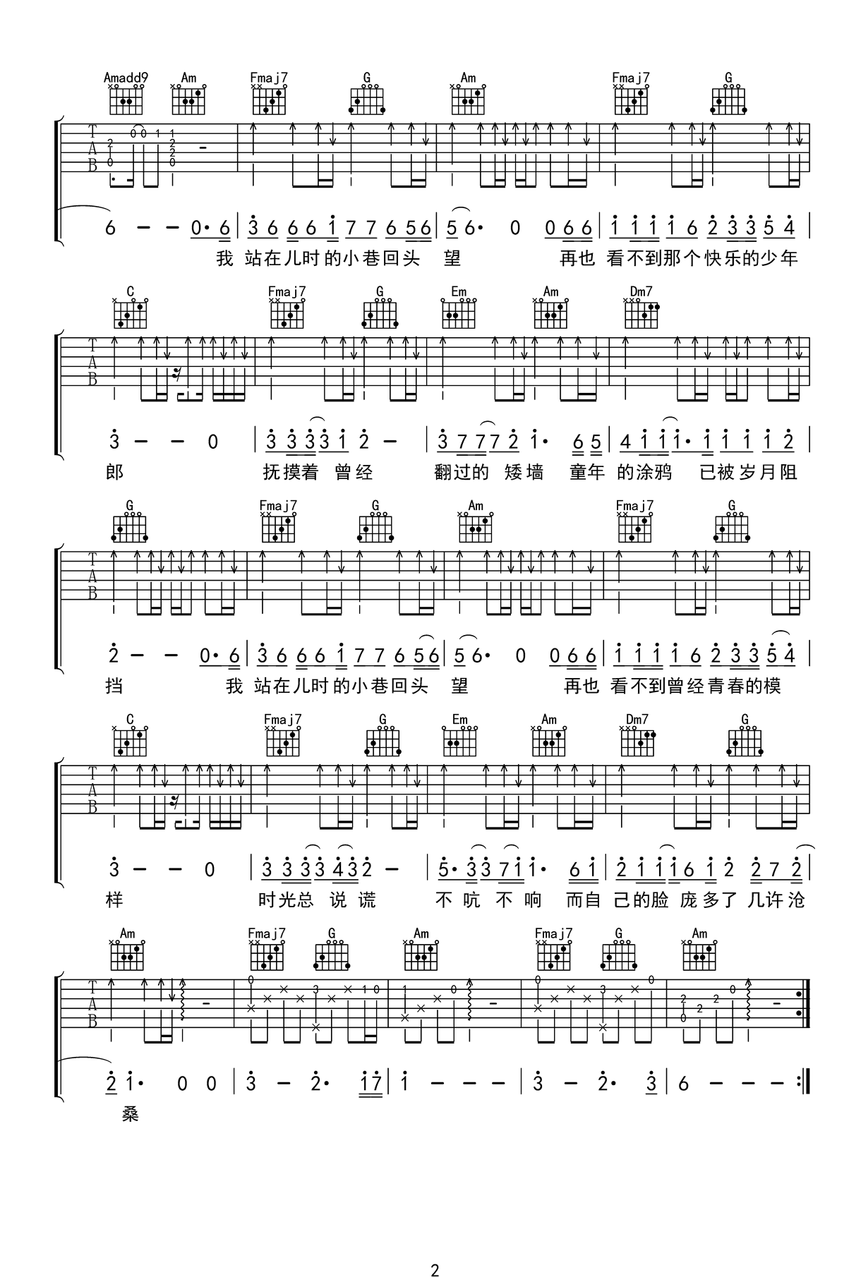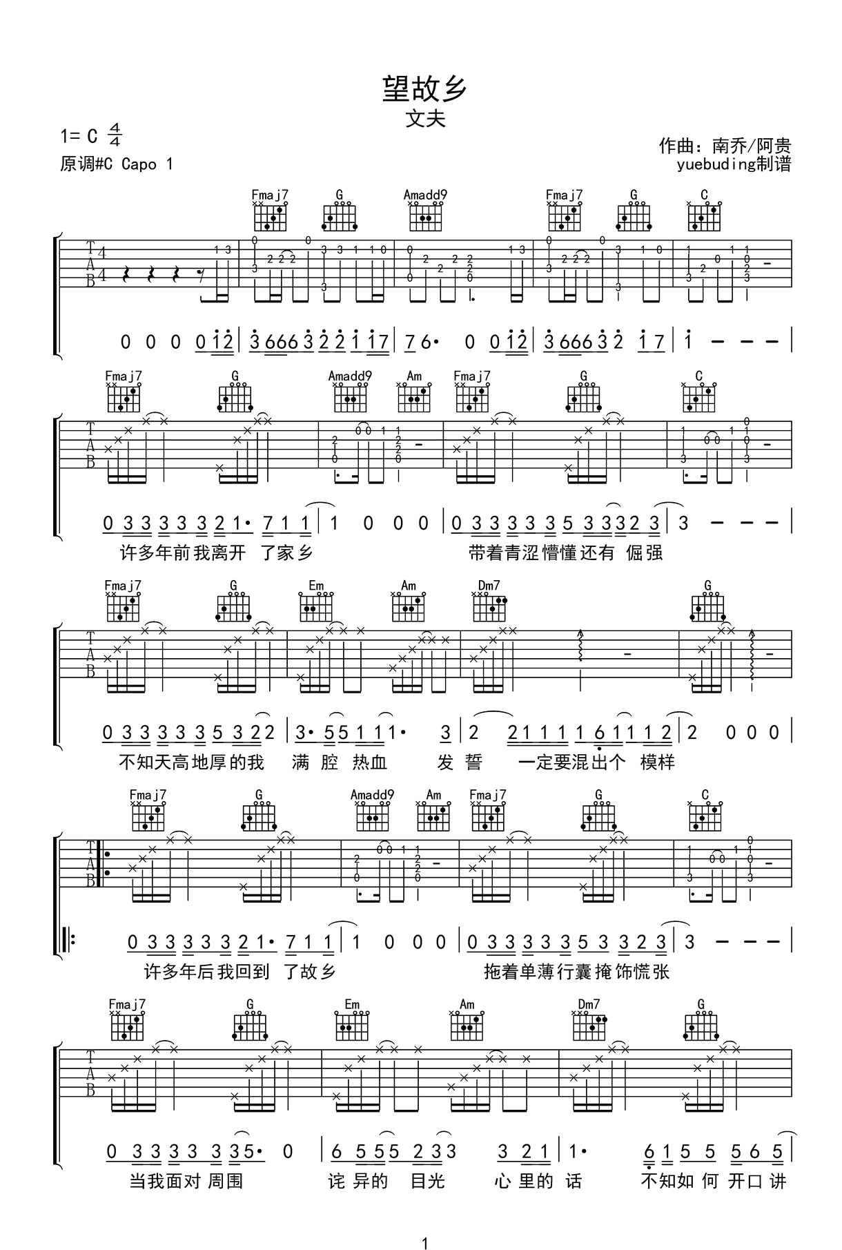 歌曲原调为#C调,此版本的曲谱来源于@网络转载,为4/4拍的节奏,按C调指法编配,共2张高清吉他谱,变调夹1品为原歌曲的调式,演唱时可按个人音域选择合适的变调夹位置。