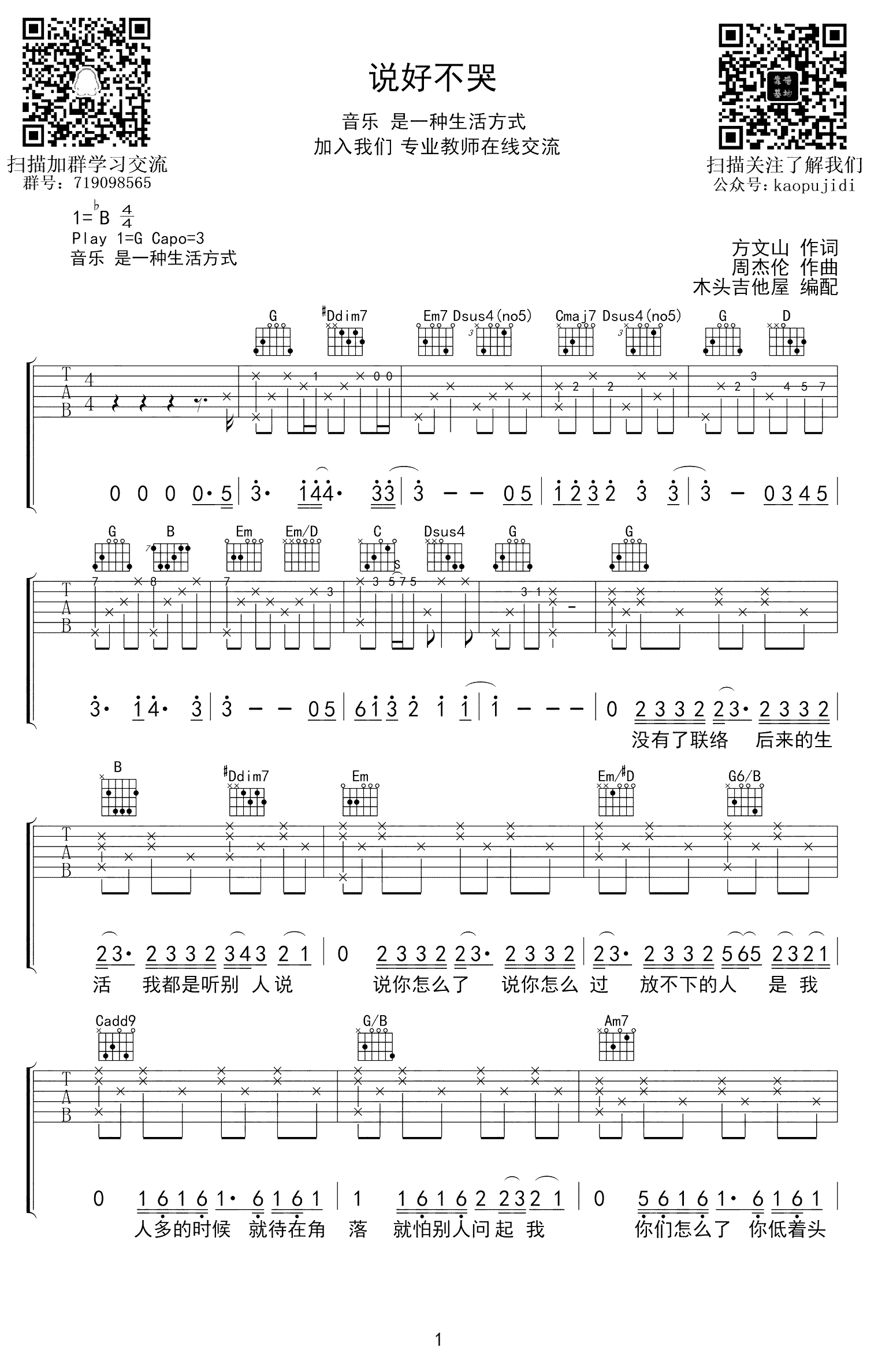 周杰伦/五月天《说好不哭》吉他谱 G调弹唱乐谱