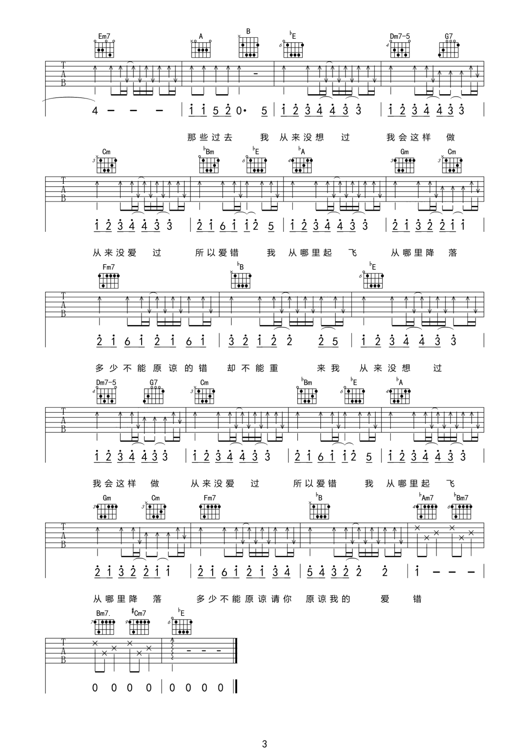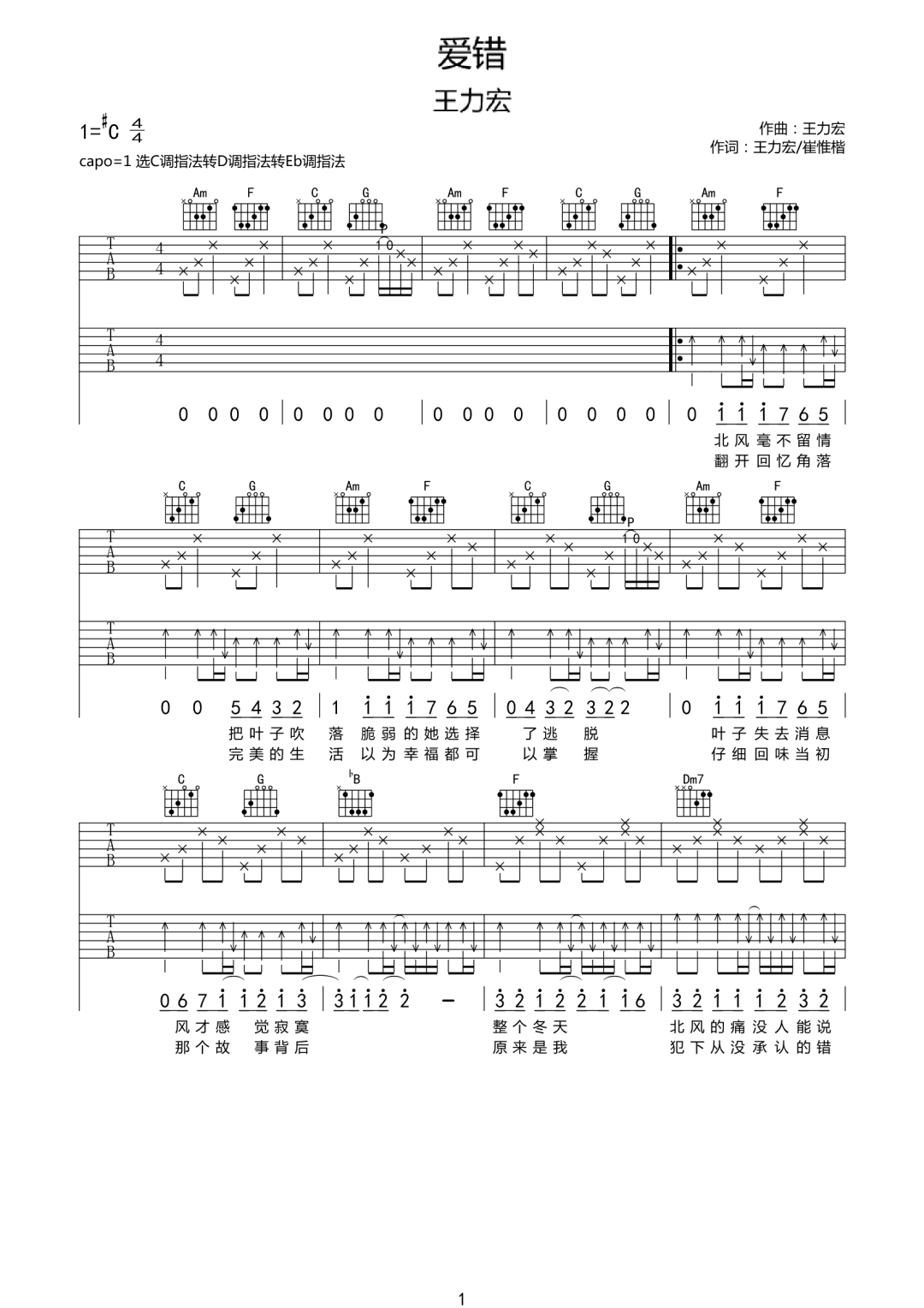 王力宏《爱错》吉他谱 C调弹唱乐谱