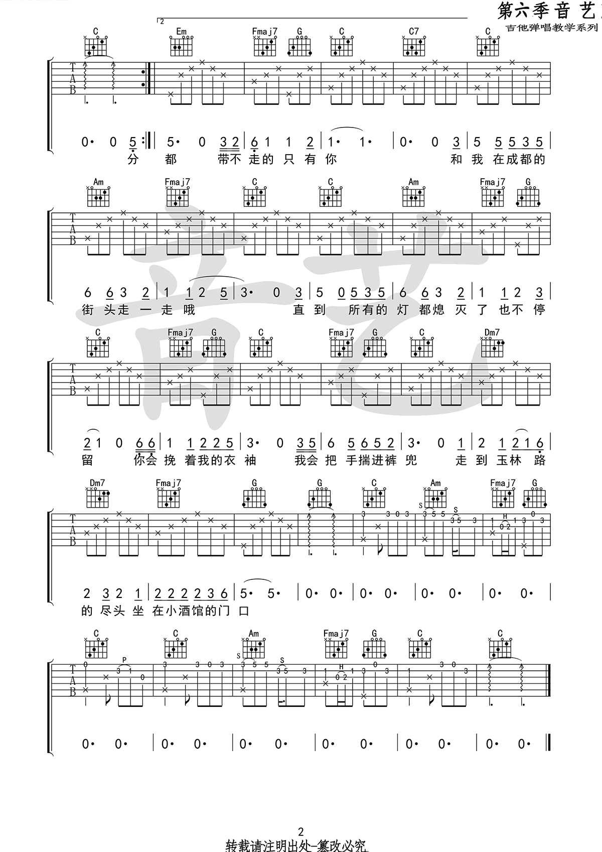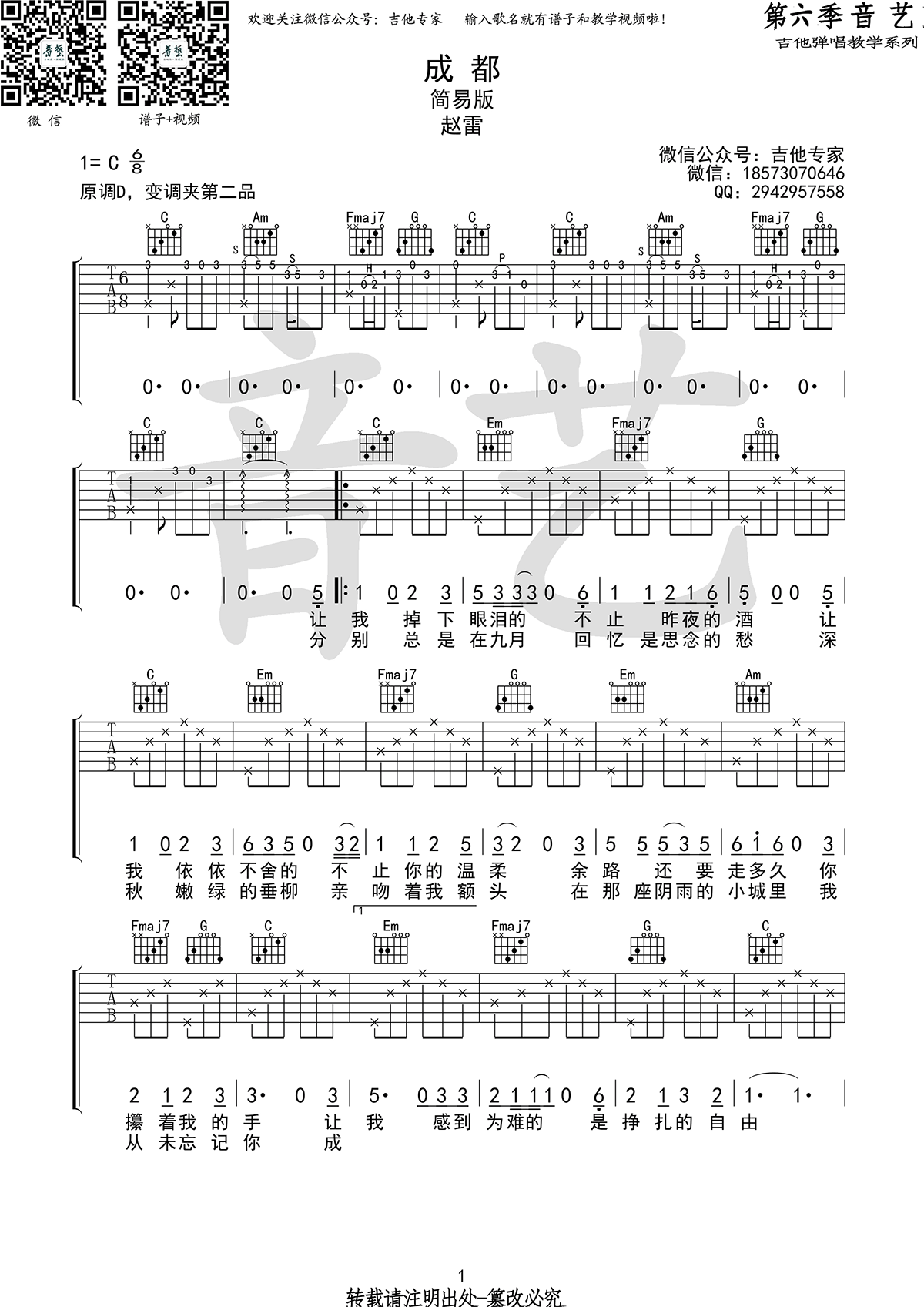 歌曲原调为D调,此版本的曲谱来源于@吉他专家,为6/8拍的节奏,按C调指法编配,共2张高清吉他谱,变调夹2品为原歌曲的调式,演唱时可按个人音域选择合适的变调夹位置。