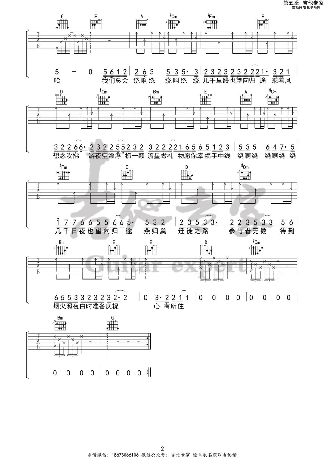 歌曲原调为#F调,此版本的曲谱来源于@吉他专家,为4/4拍的节奏,按C调指法编配,共2张高清吉他谱,变调夹6品为原歌曲的调式,演唱时可按个人音域选择合适的变调夹位置。