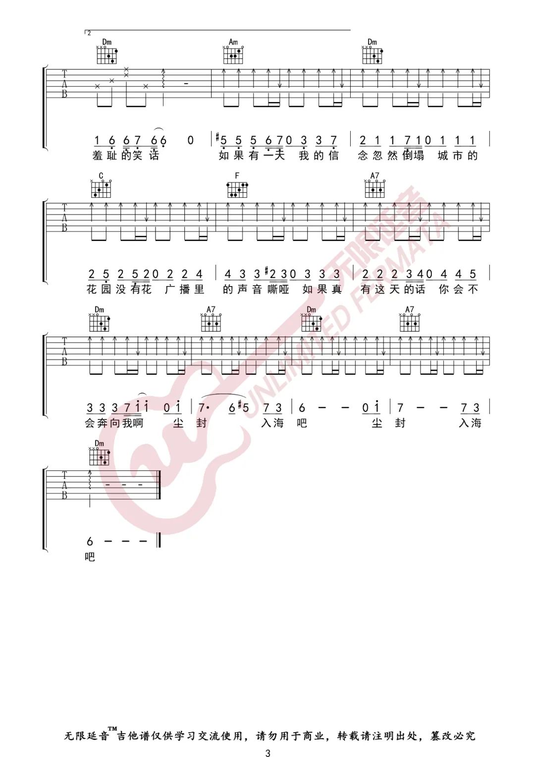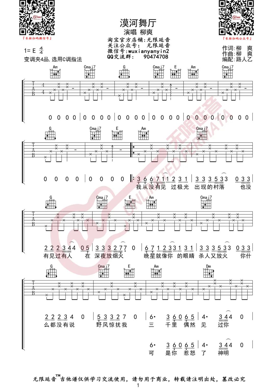 歌曲原调为E调,此版本的曲谱来源于@无限延音,为4/4拍的节奏,按C调指法编配,共3张高清吉他谱,变调夹4品为原歌曲的调式,演唱时可按个人音域选择合适的变调夹位置。
