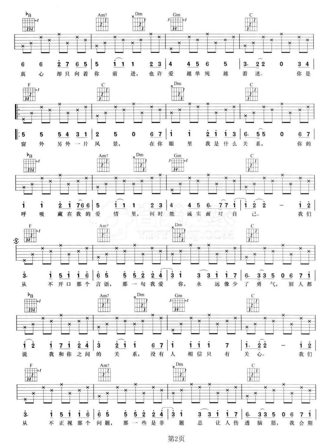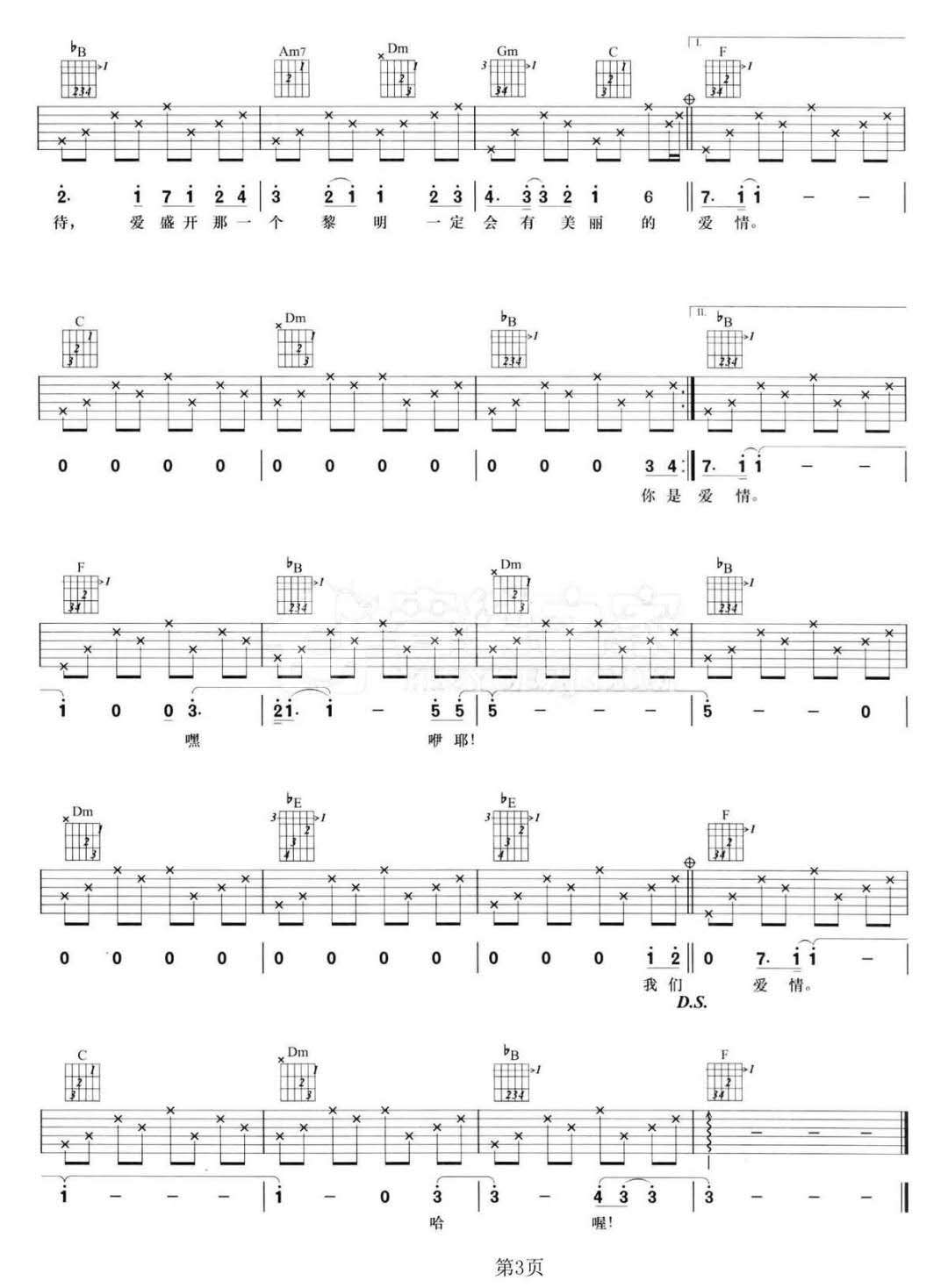 歌曲原调为#F调,此版本的曲谱来源于@网络转载,为4/4拍的节奏,按F调指法编配,共3张高清吉他谱,变调夹1品为原歌曲的调式,演唱时可按个人音域选择合适的变调夹位置。