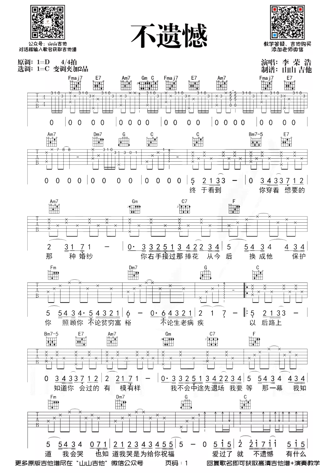 李荣浩《不遗憾》吉他谱 C调指法弹唱乐谱