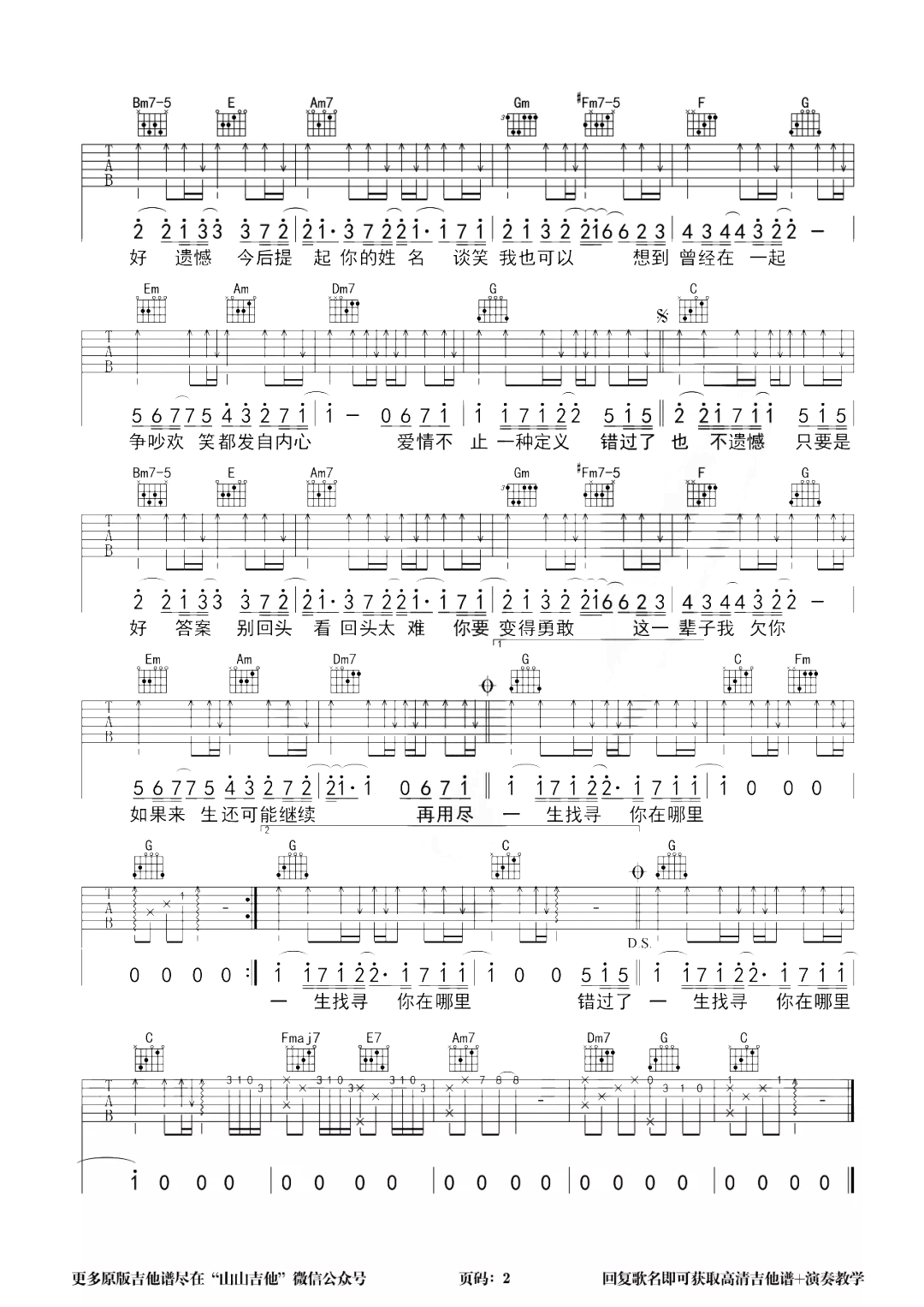 歌曲原调为D调,此版本的曲谱来源于@山山吉他,为4/4拍的节奏,按C调指法编配,共2张高清吉他谱,变调夹2品为原歌曲的调式,演唱时可按个人音域选择合适的变调夹位置。
