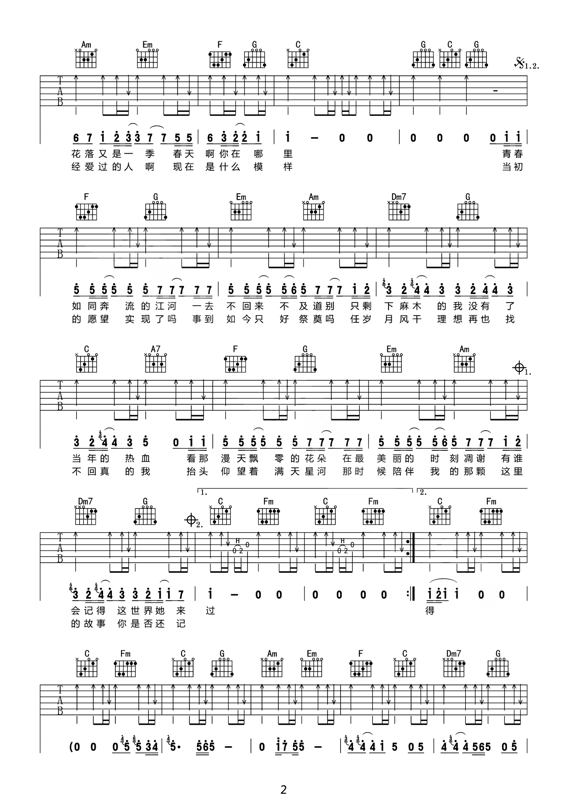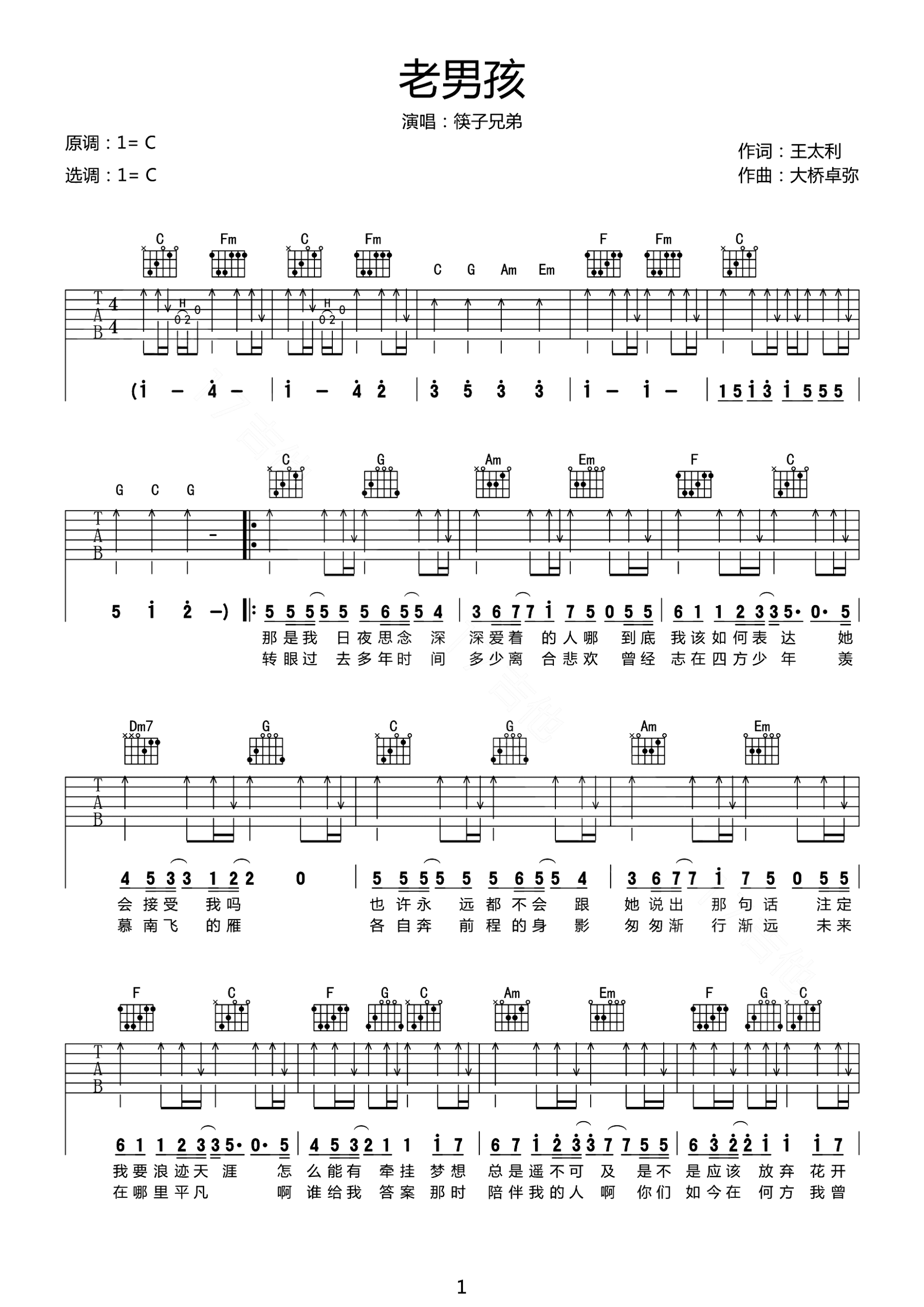 歌曲原调为C调,此版本的曲谱来源于@网络转载,为4/4拍的节奏,按C调指法编配,共3张高清吉他谱,变调夹不夹为原歌曲的调式,演唱时可按个人音域选择合适的变调夹位置。