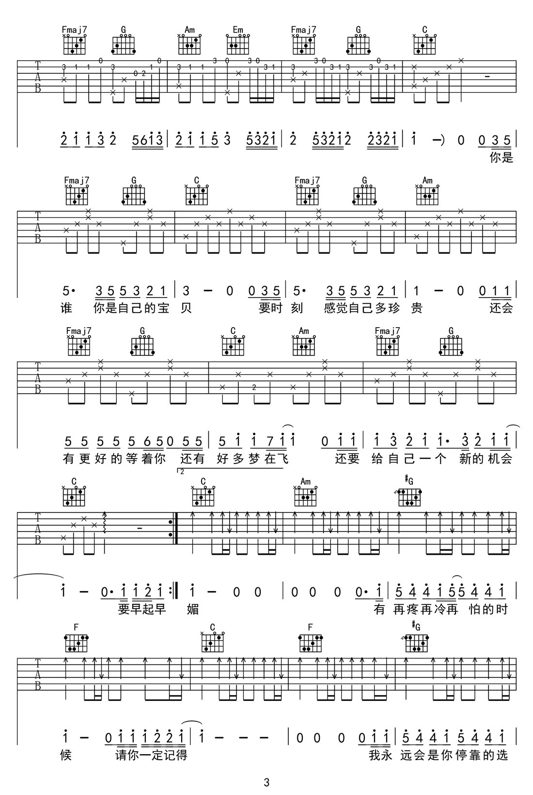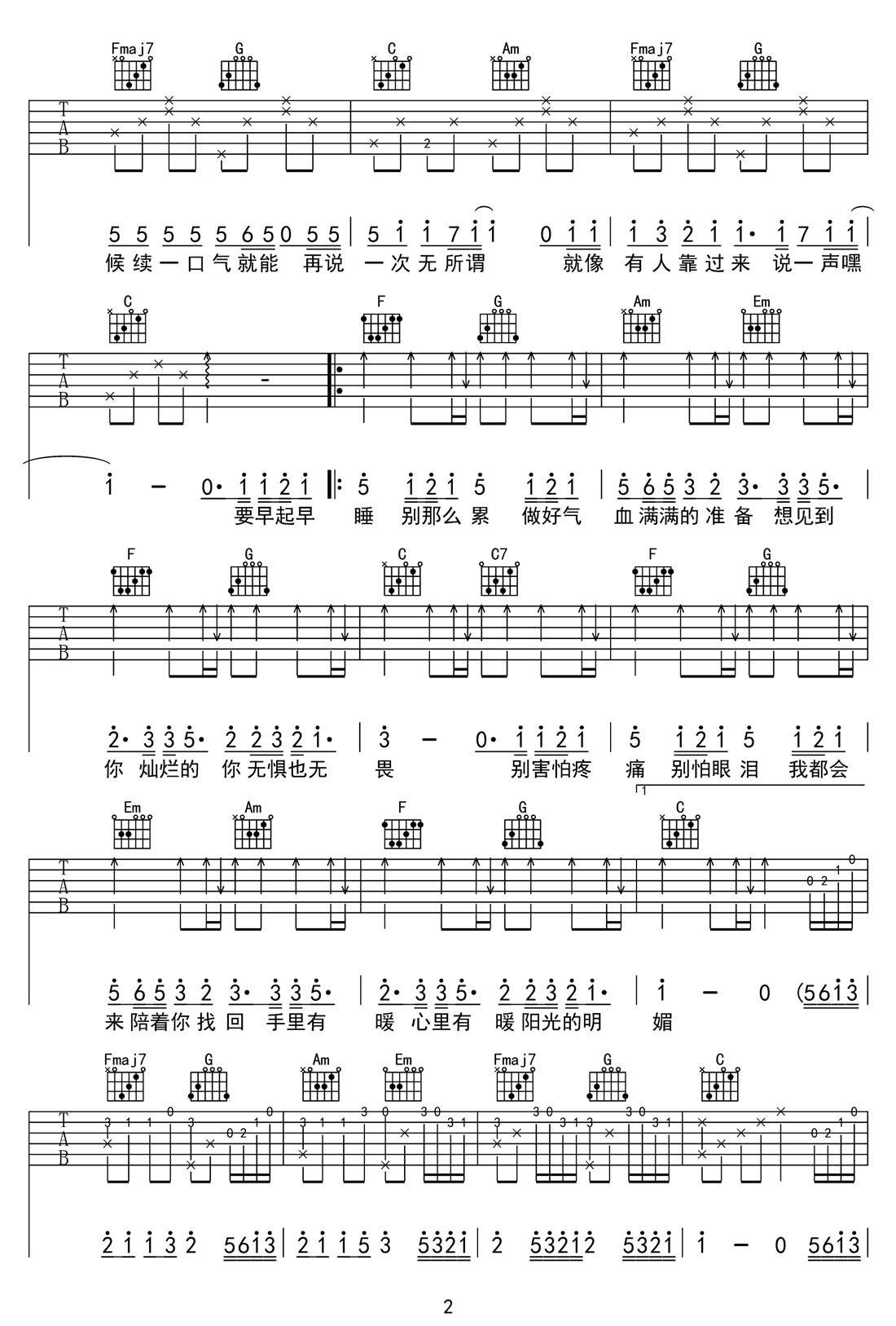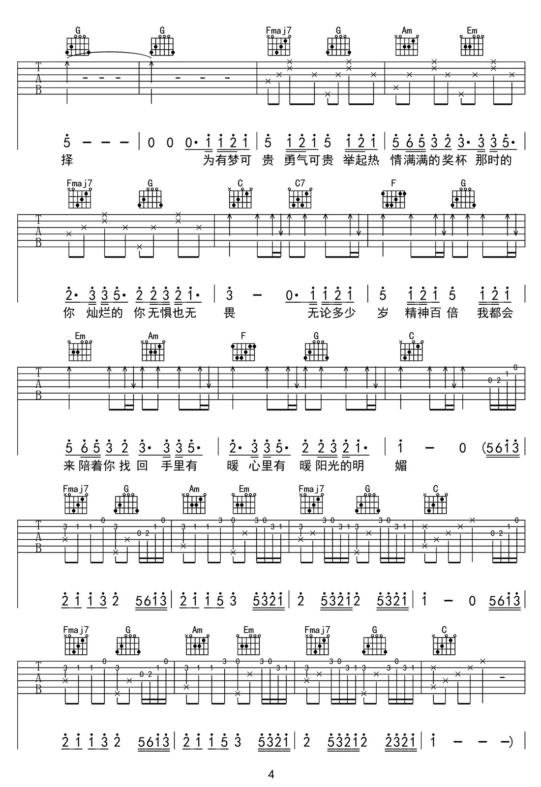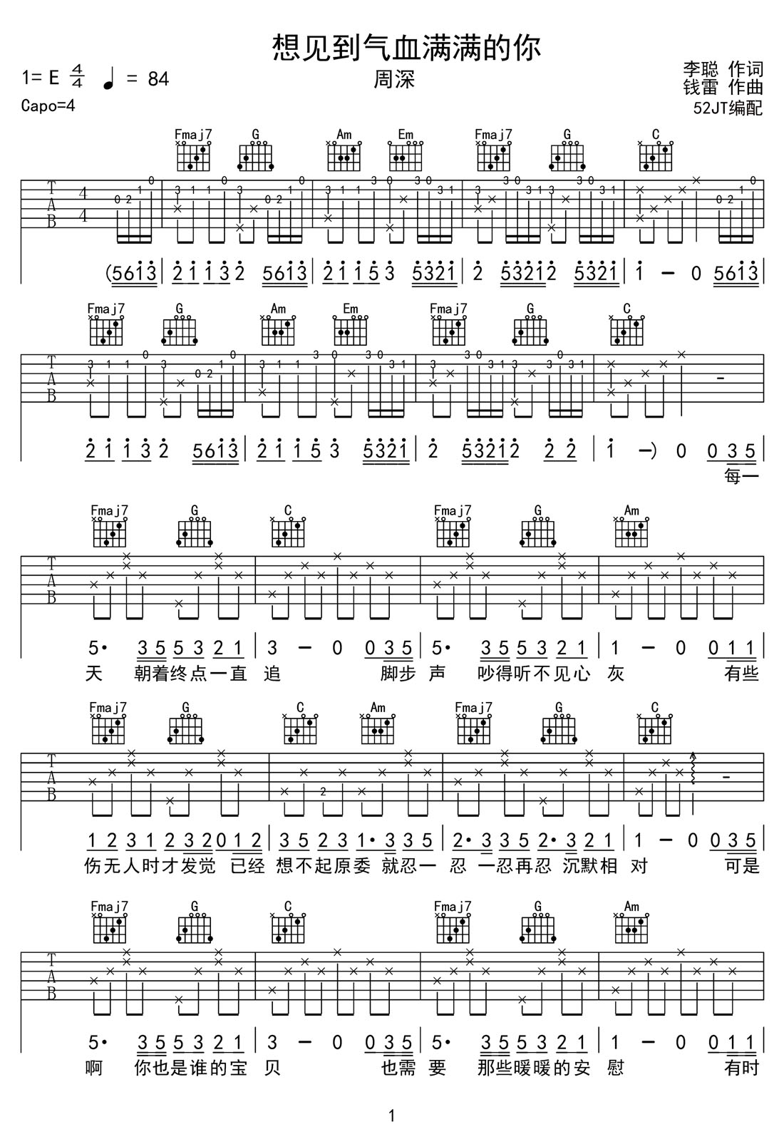 想见到气血满满的你吉他谱,歌曲原调为E调,此版本的曲谱来源于@52JT,为4/4拍的节奏,按C调指法编配,共4张高清吉他谱,变调夹4品为原歌曲的调式,演唱时可按个人音域选择合适的变调夹位置。