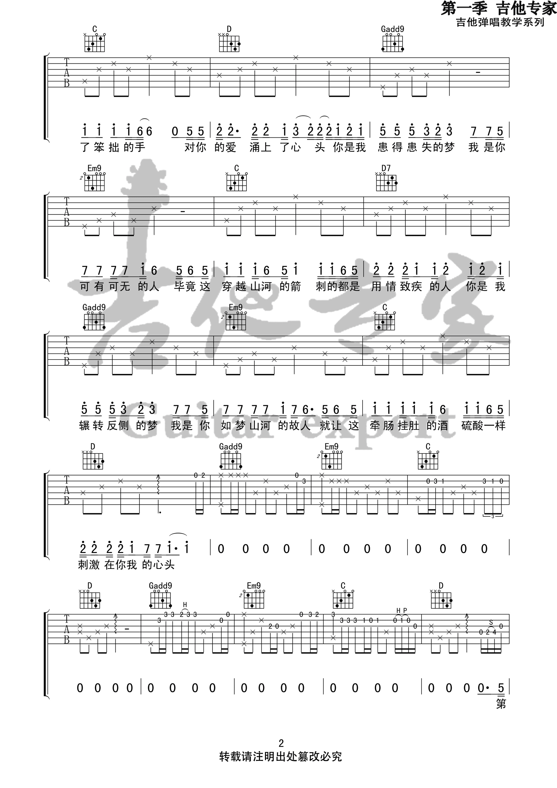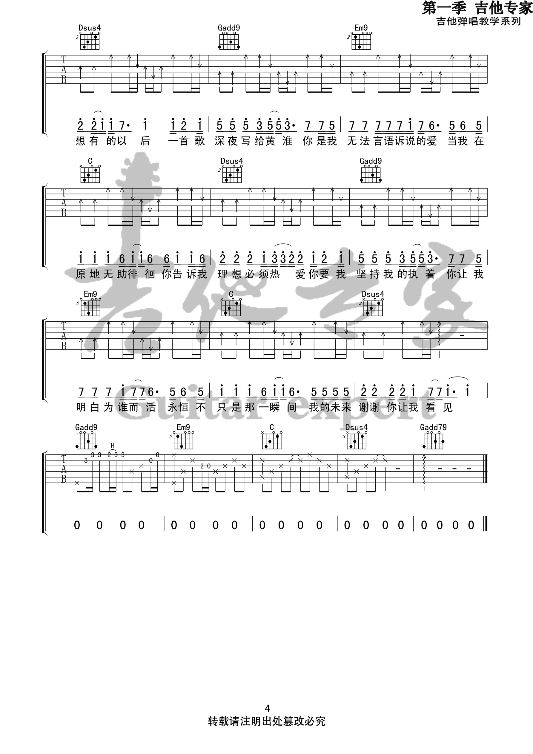 歌曲原调为降B调,此版本的曲谱来源于@吉他专家,为4/4拍的节奏,按G调指法编配,共4张高清吉他谱,变调夹3品为原歌曲的调式,演唱时可按个人音域选择合适的变调夹位置。