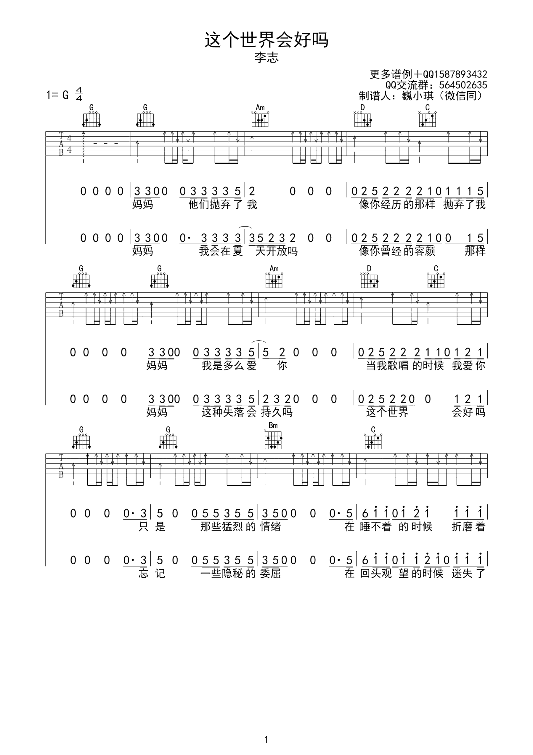 李志《这个世界会好吗》吉他谱 G调扫弦弹唱谱