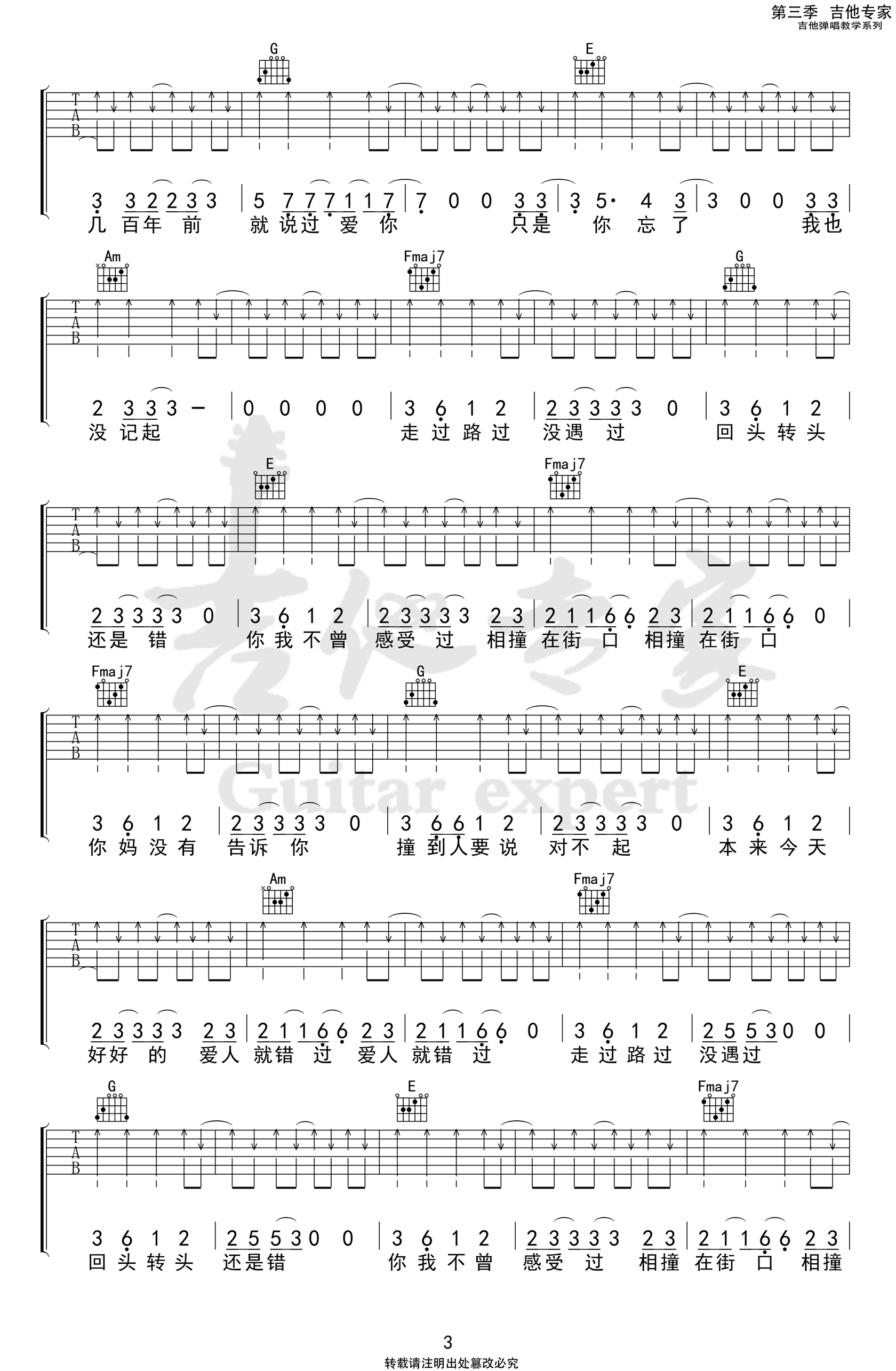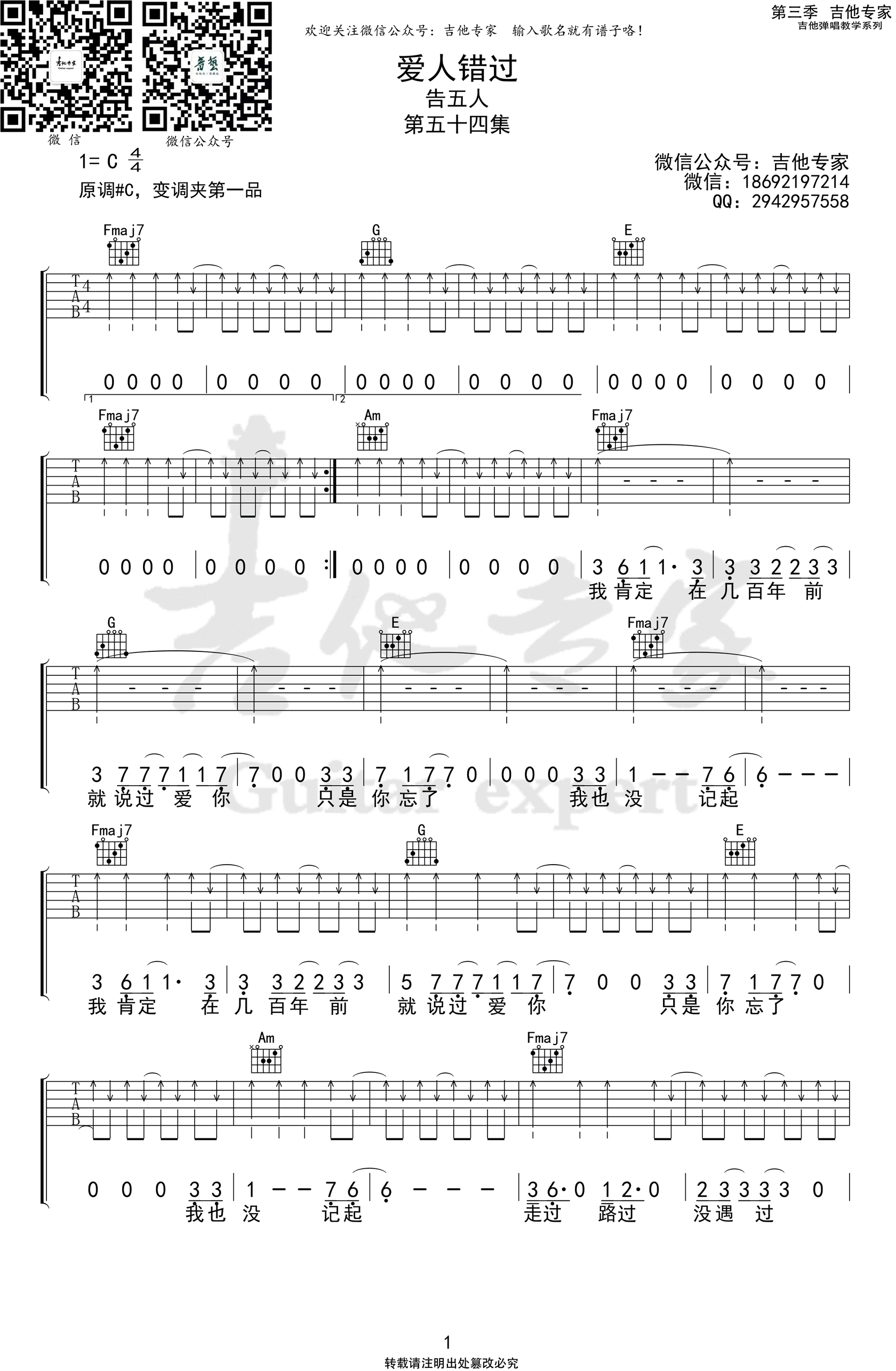 歌曲原调为#C调,此版本的曲谱来源于@吉他专家,为4/4拍的节奏,按C调指法编配,共4张高清吉他谱,变调夹1品为原歌曲的调式,演唱时可按个人音域选择合适的变调夹位置。