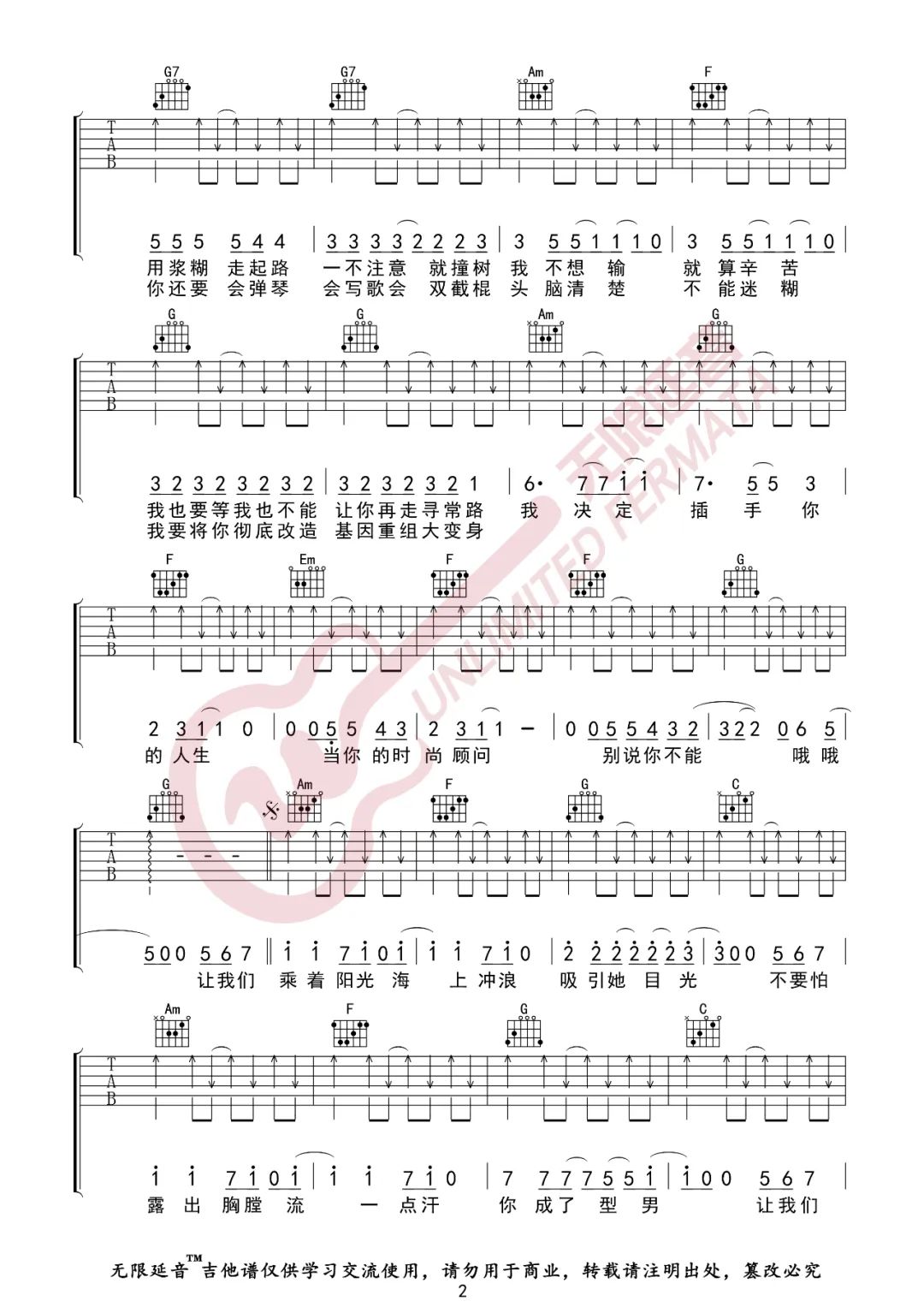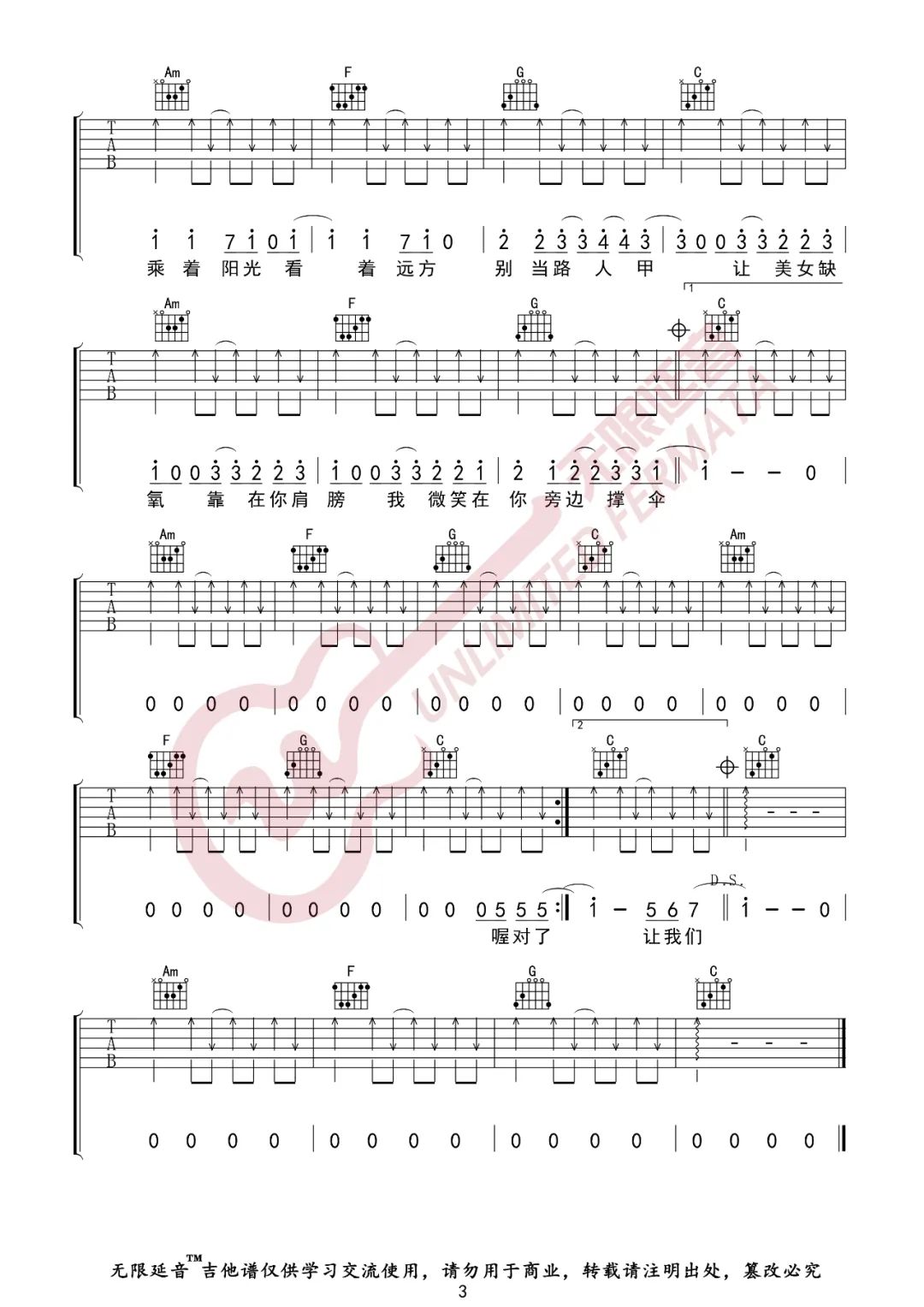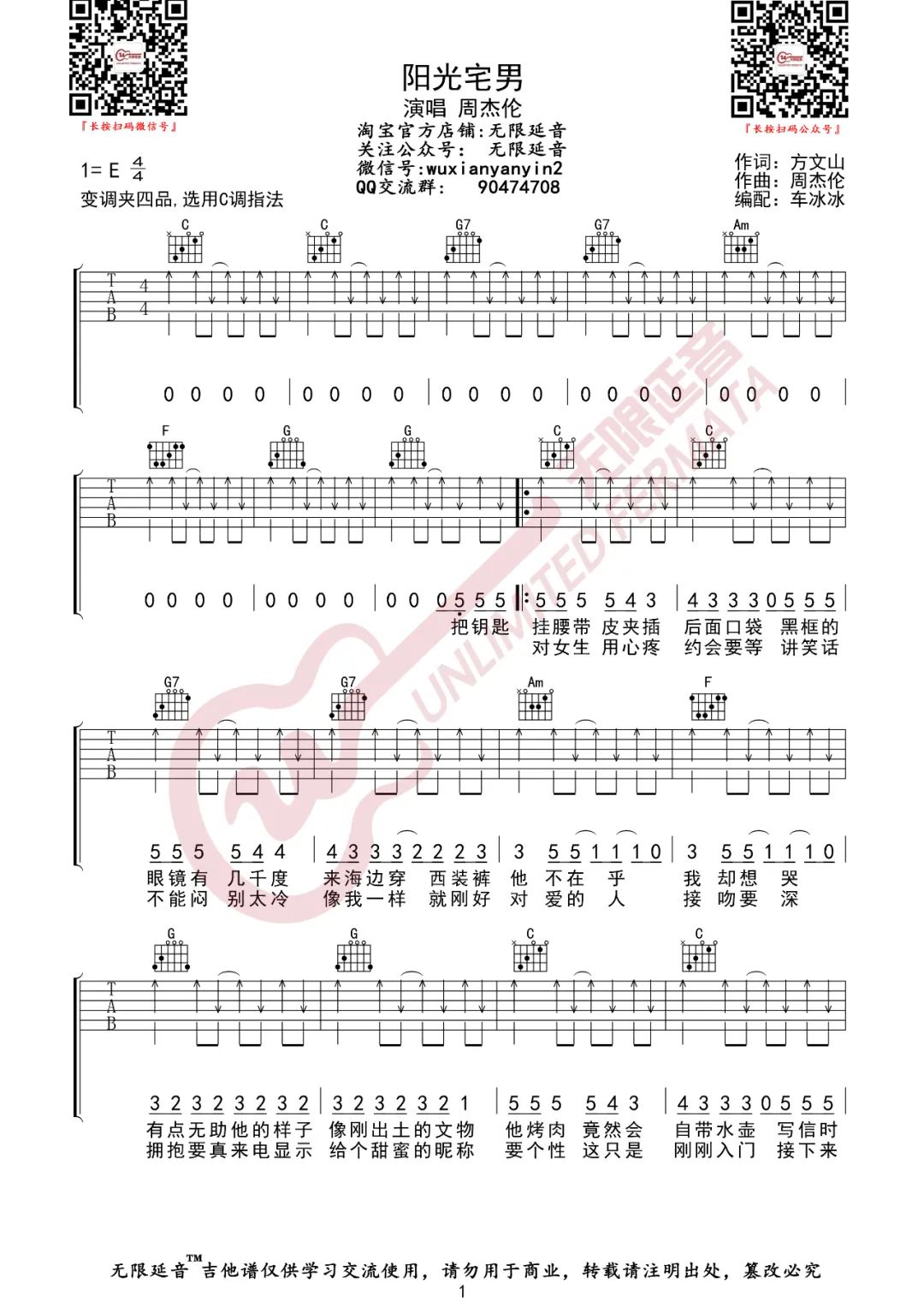 歌曲原调为E调,此版本的曲谱来源于@无限延音,为4/4拍的节奏,按C调指法编配,共3张高清吉他谱,变调夹4品为原歌曲的调式,演唱时可按个人音域选择合适的变调夹位置。