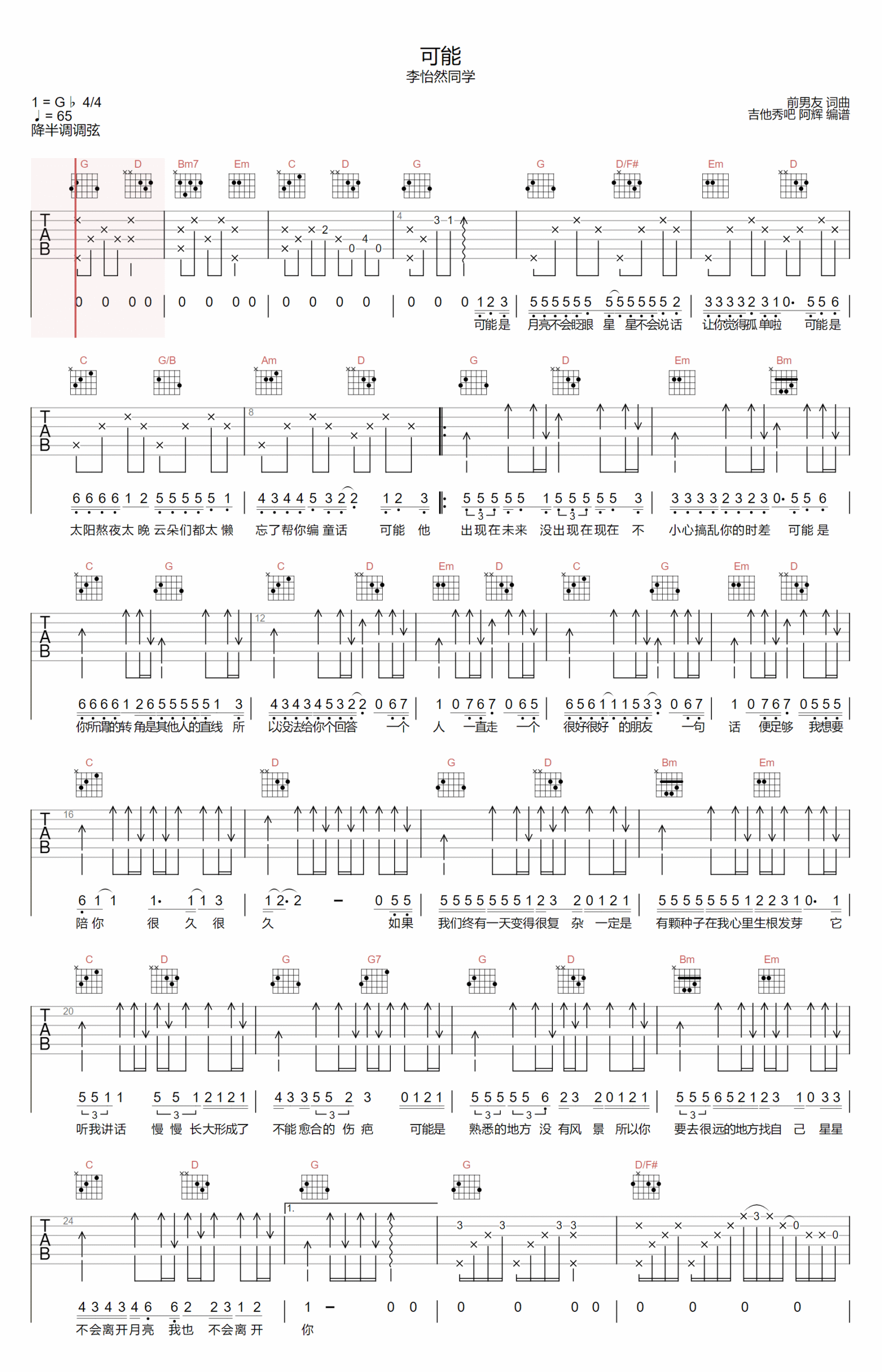 歌曲原调为#F调,此版本的曲谱来源于@阿辉,为4/4拍的节奏,按G调指法编配,共2张高清吉他谱,变调夹降半音调弦为原歌曲的调式,演唱时可按个人音域选择合适的变调夹位置。