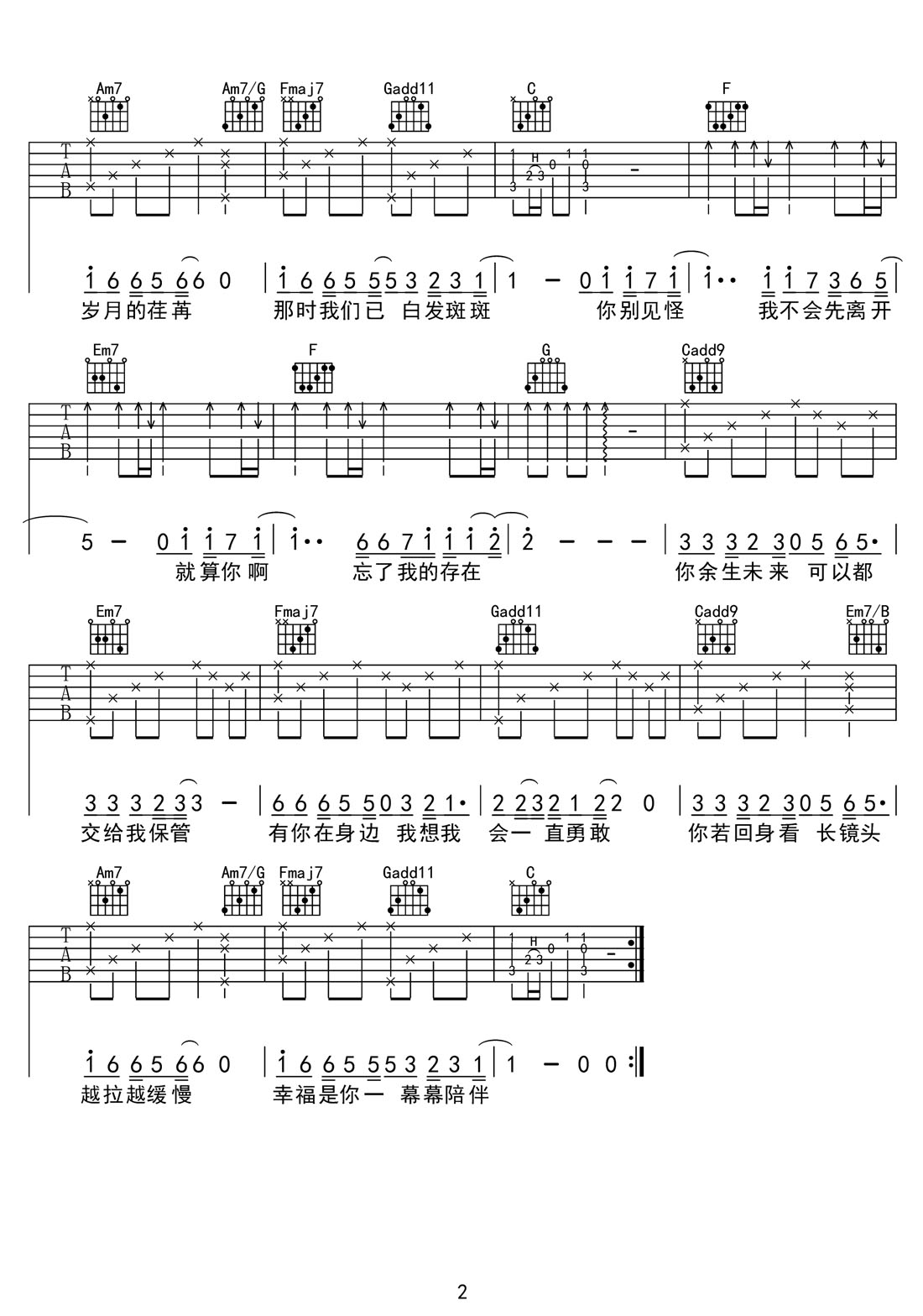 歌曲原调为F调,此版本的曲谱来源于@吉他大师,为4/4拍的节奏,按C调指法编配,共2张高清吉他谱,变调夹5品为原歌曲的调式,演唱时可按个人音域选择合适的变调夹位置。
