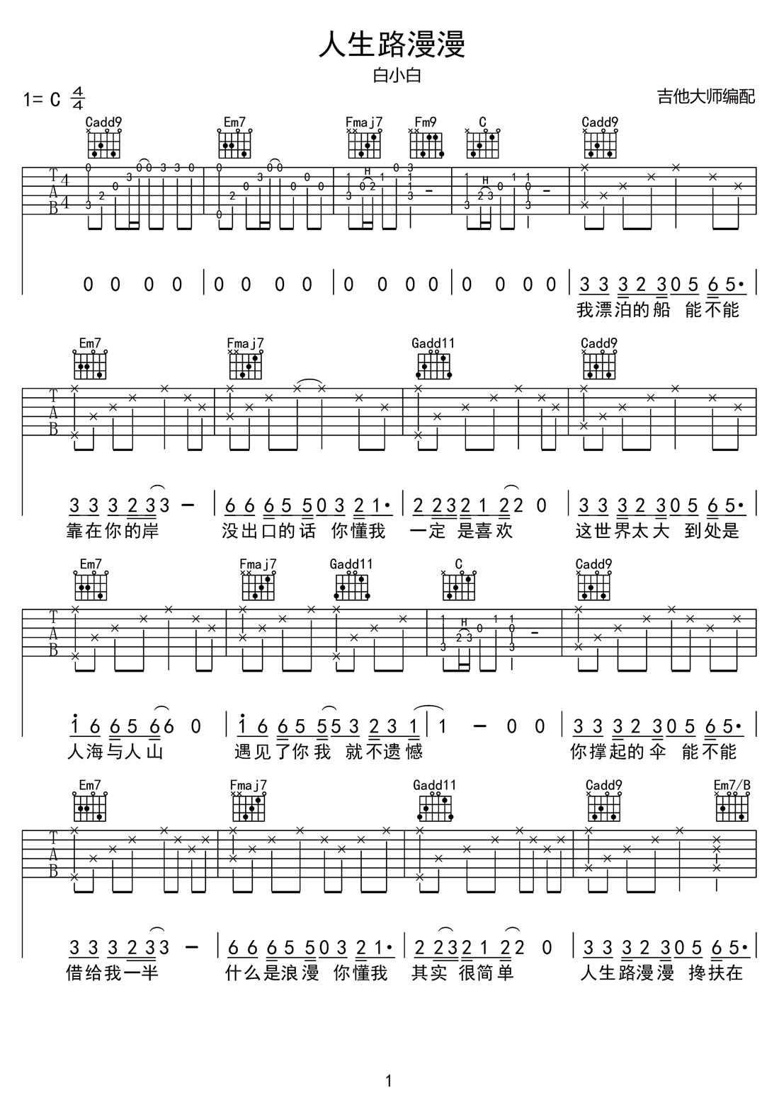 白小白《人生路漫漫》吉他谱 C调弹唱乐谱