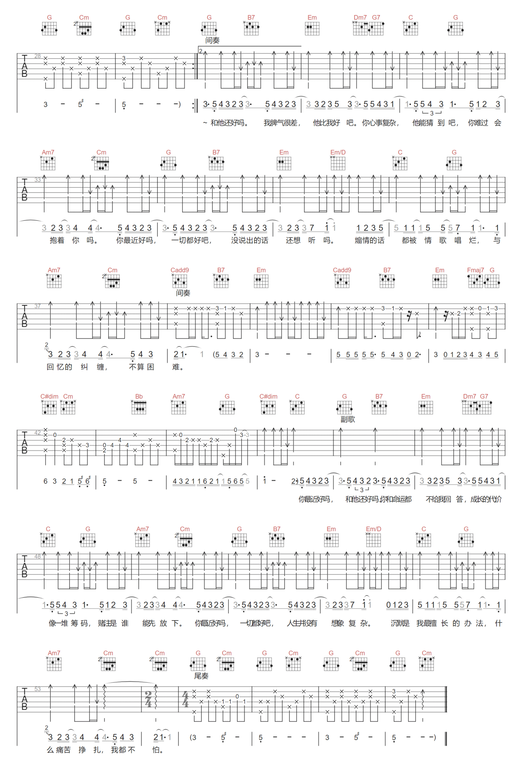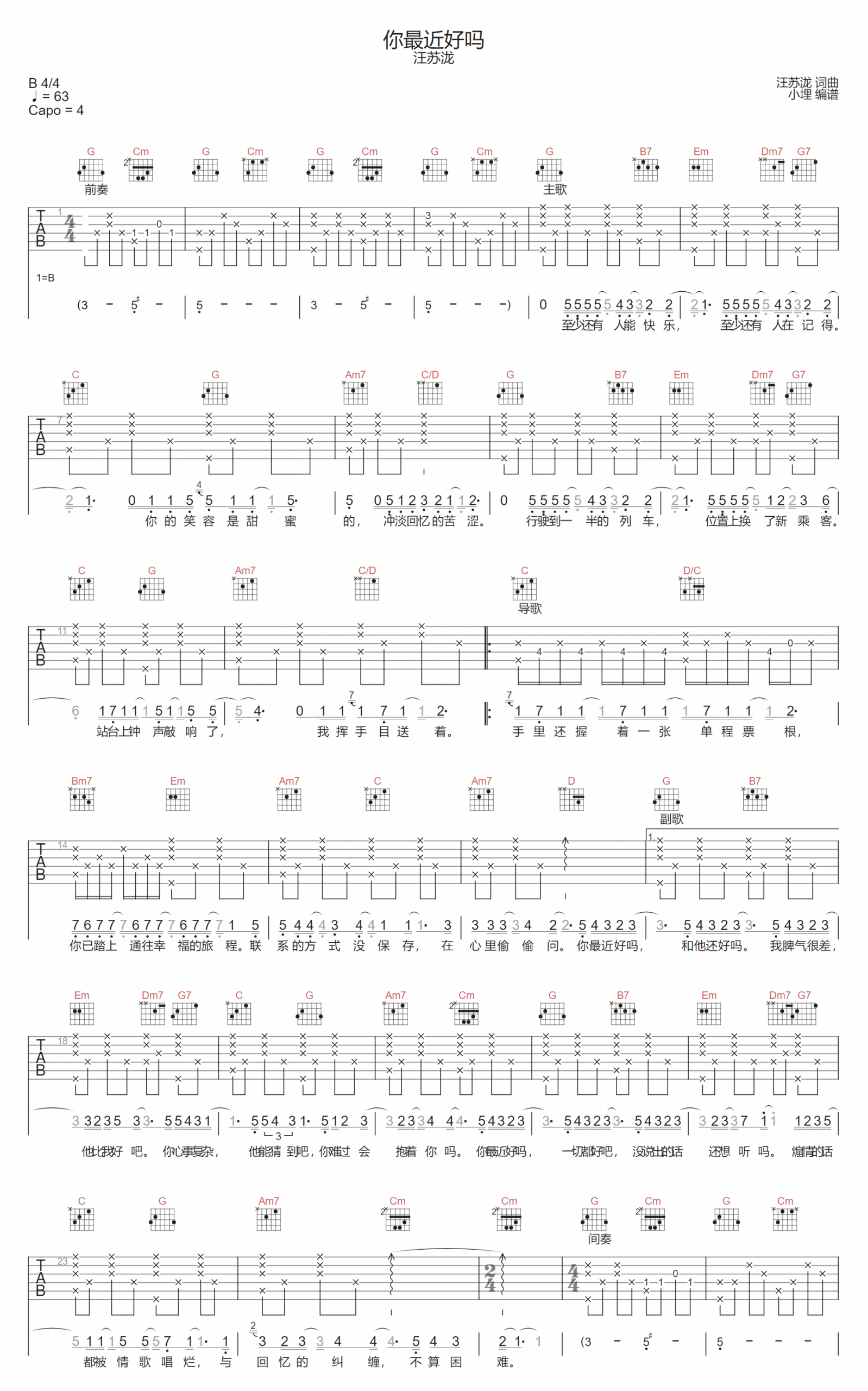 歌曲原调为B调,此版本的曲谱来源于@小埋,为4/4拍的节奏,按G调指法编配,共2张高清吉他谱,变调夹4品为原歌曲的调式,演唱时可按个人音域选择合适的变调夹位置。