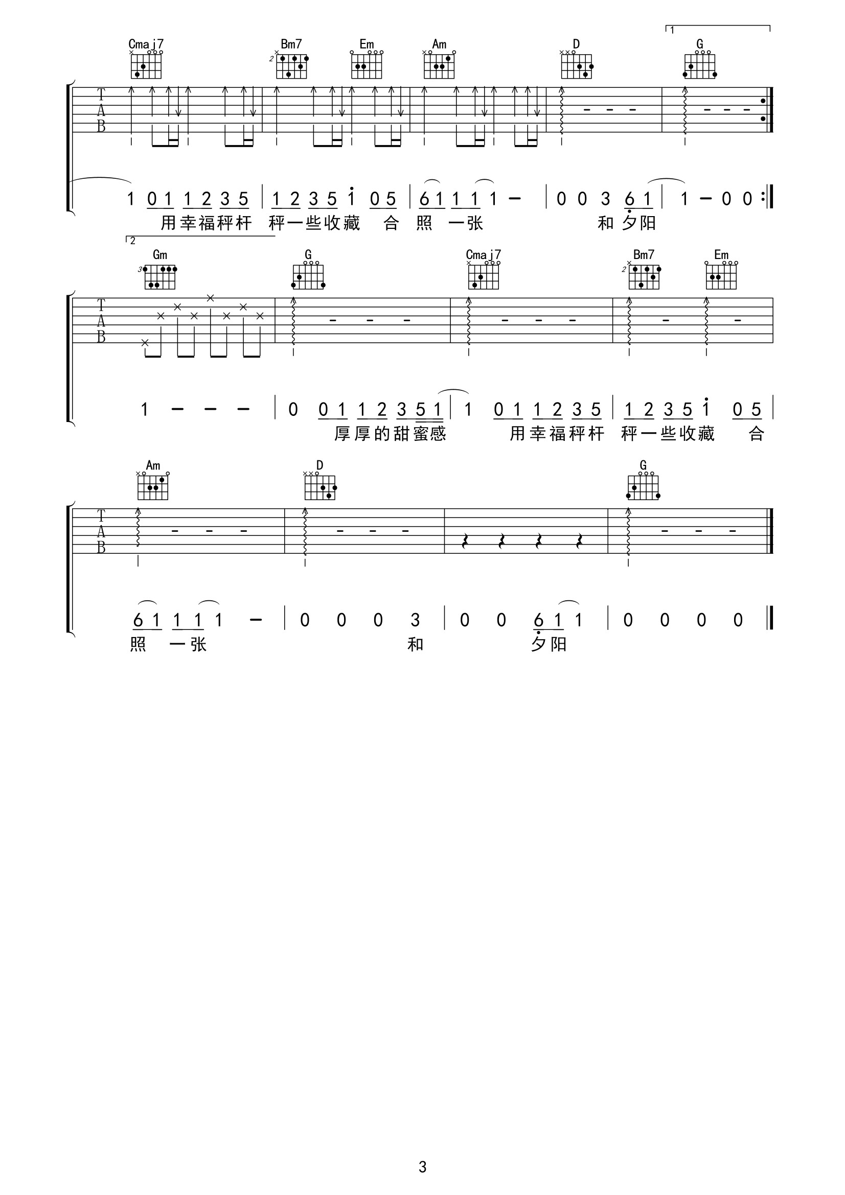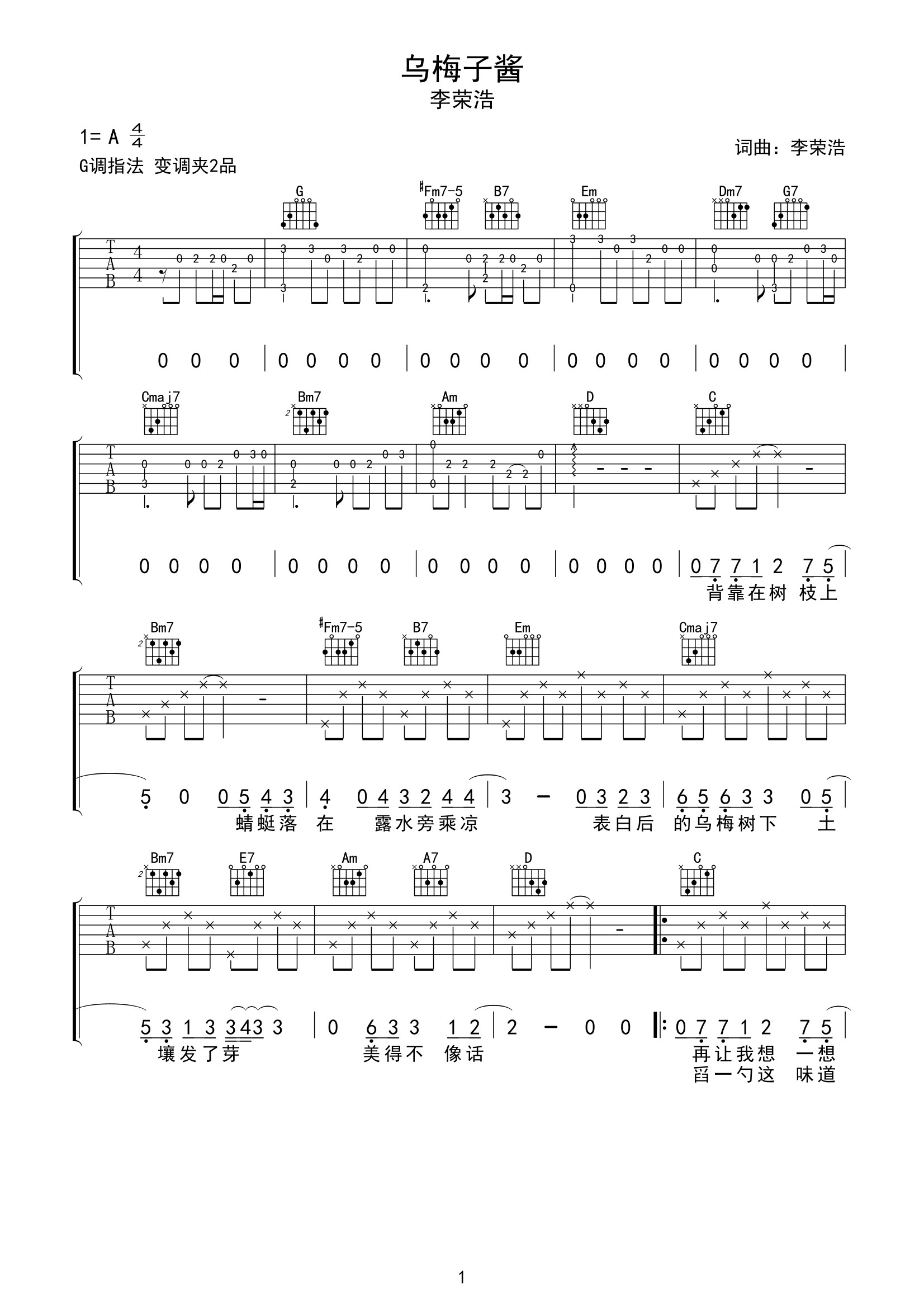 歌曲原调为A调,此版本的曲谱来源于@网络转载,为4/4拍的节奏,按G调指法编配,共3张高清吉他谱,变调夹2品为原歌曲的调式,演唱时可按个人音域选择合适的变调夹位置。
