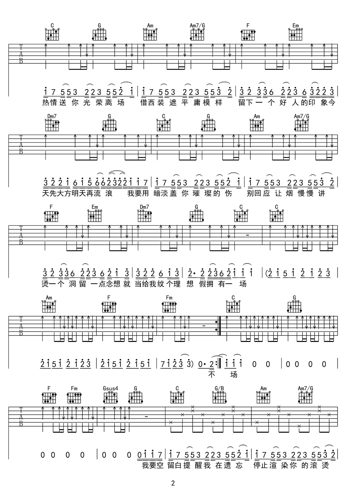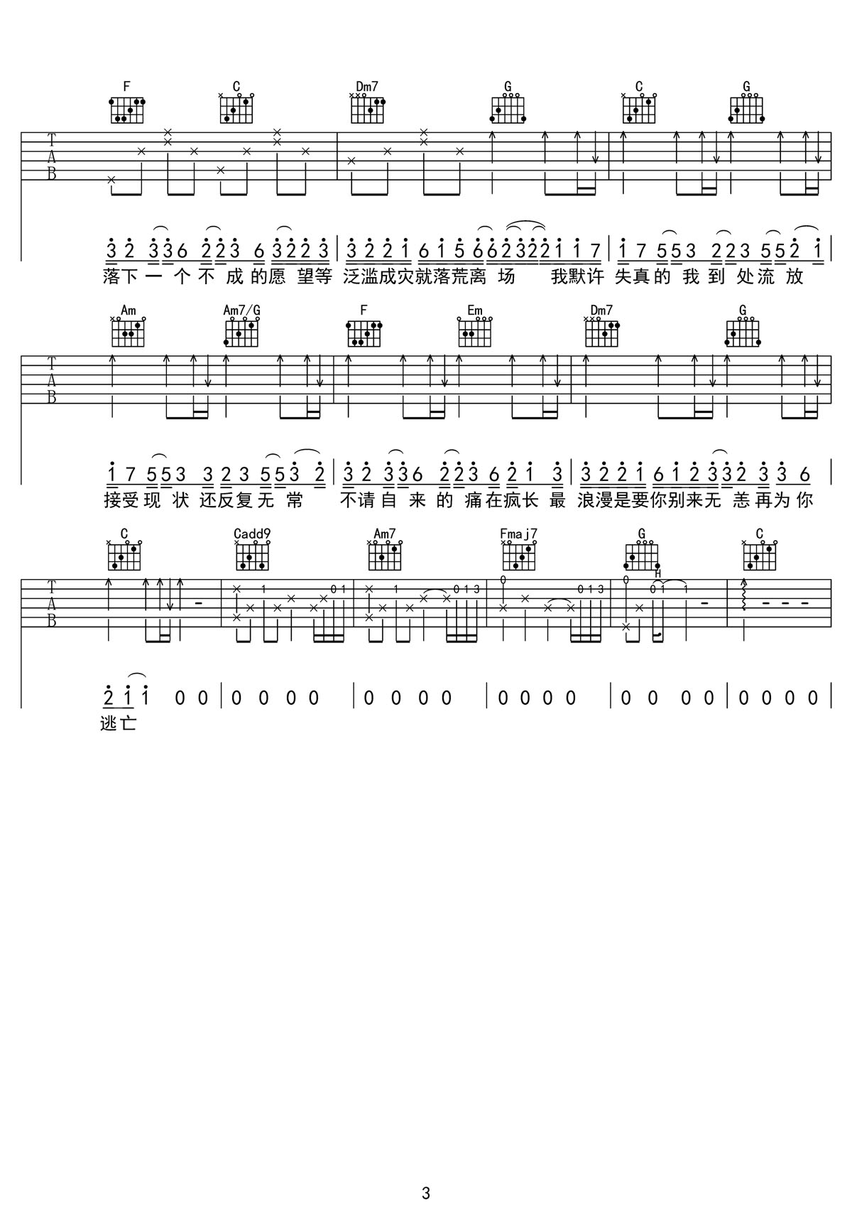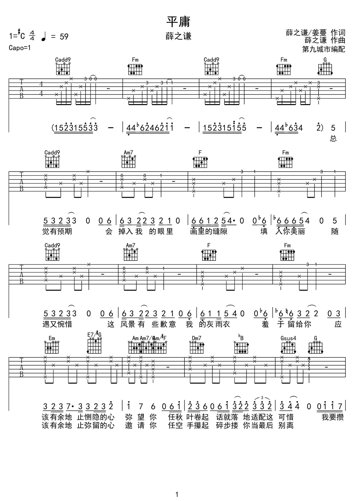 平庸吉他谱,歌曲原调为#C调,此版本的曲谱来源于@第九城市,为4/4拍的节奏,按C调指法编配,共3张高清吉他谱,变调夹1品为原歌曲的调式,演唱时可按个人音域选择合适的变调夹位置。