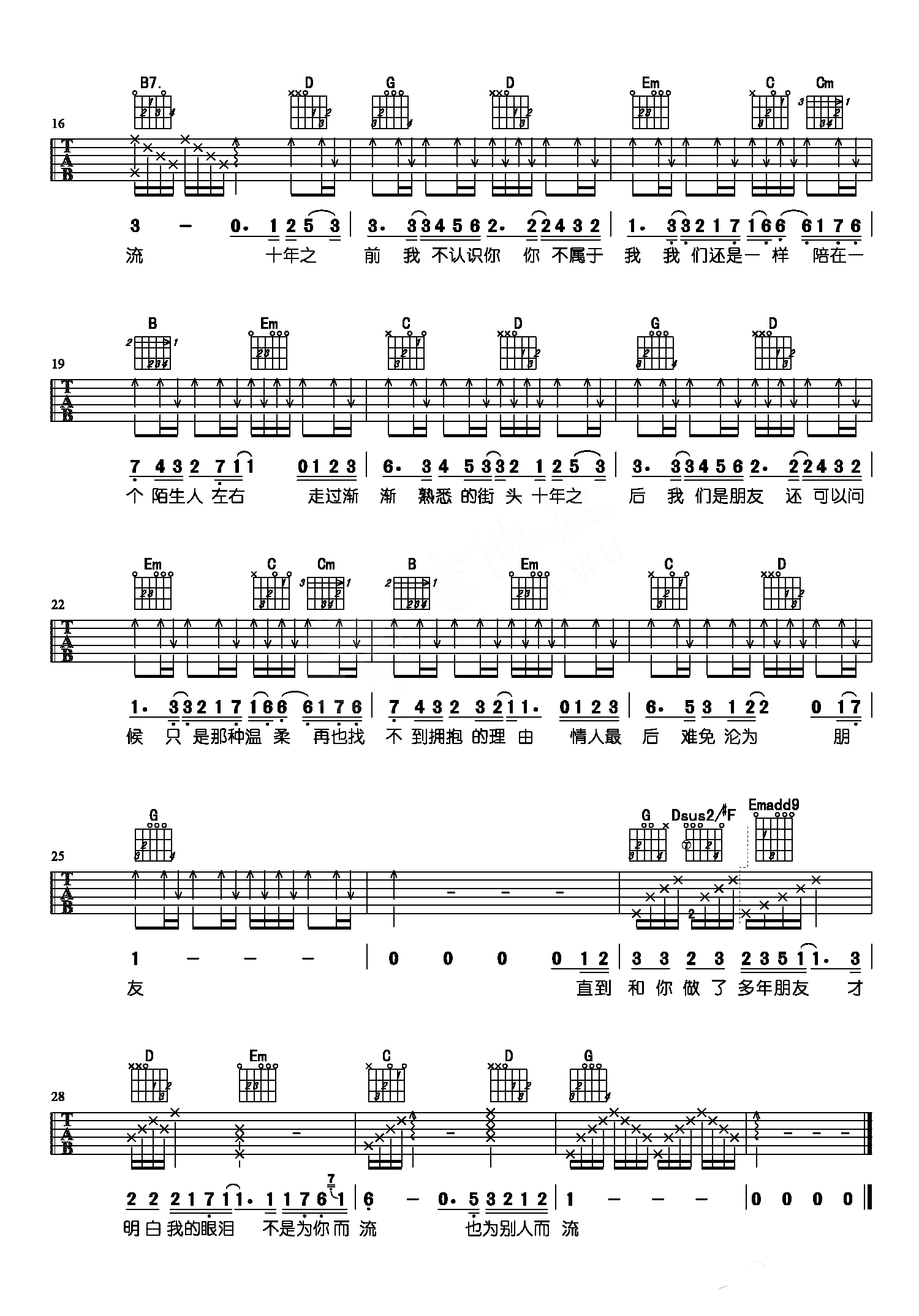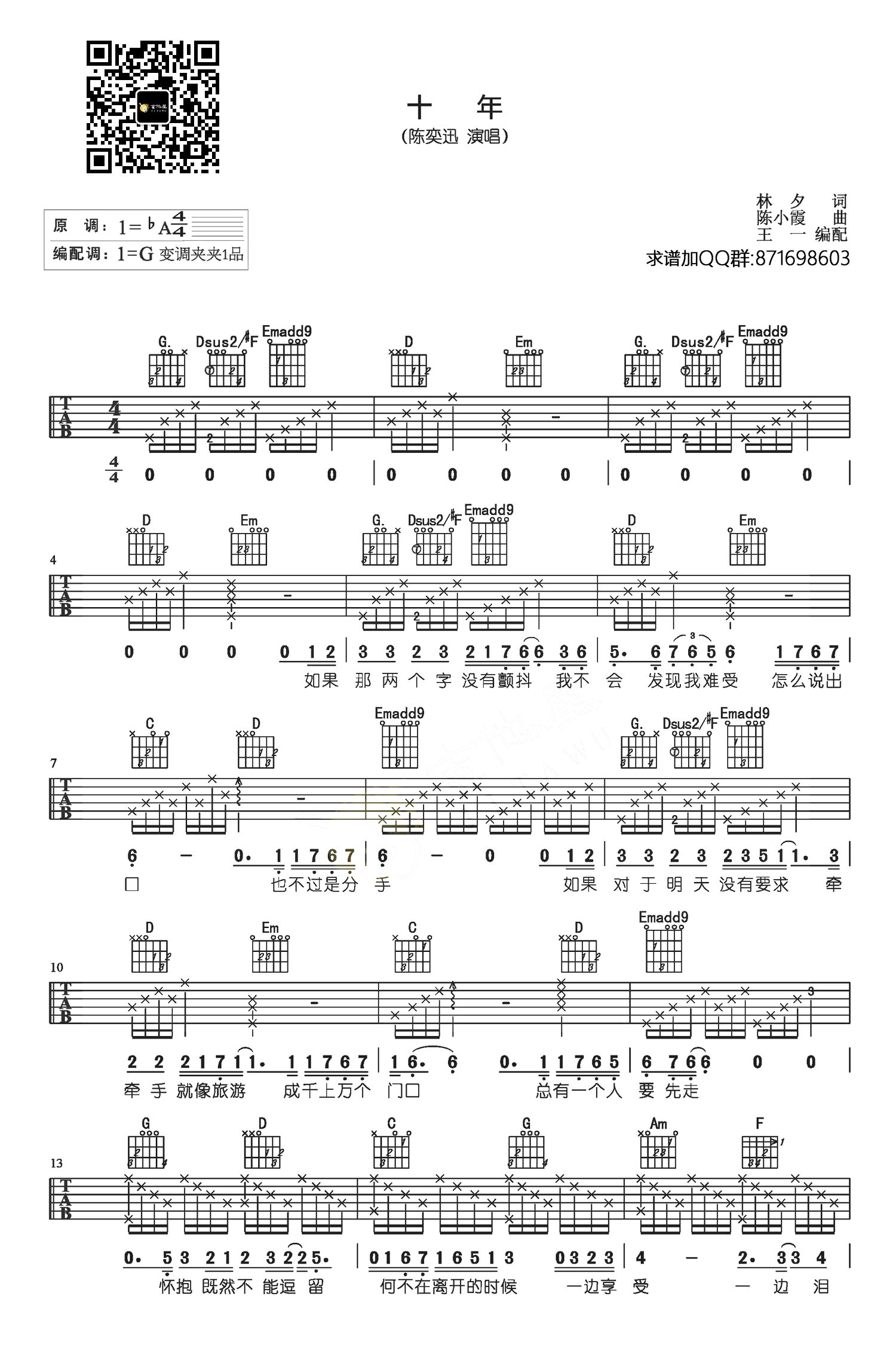 陈奕迅《十年》吉他谱 G调指法弹唱乐谱